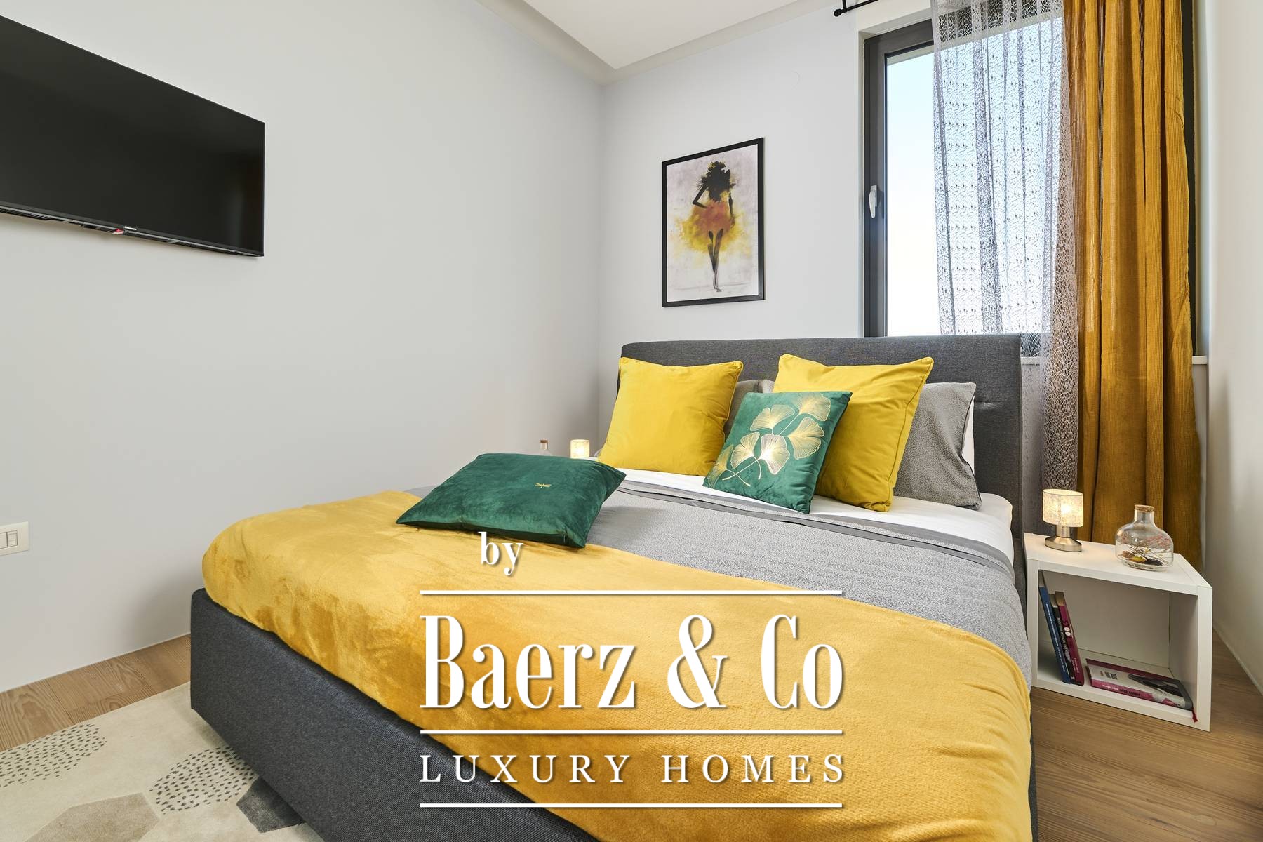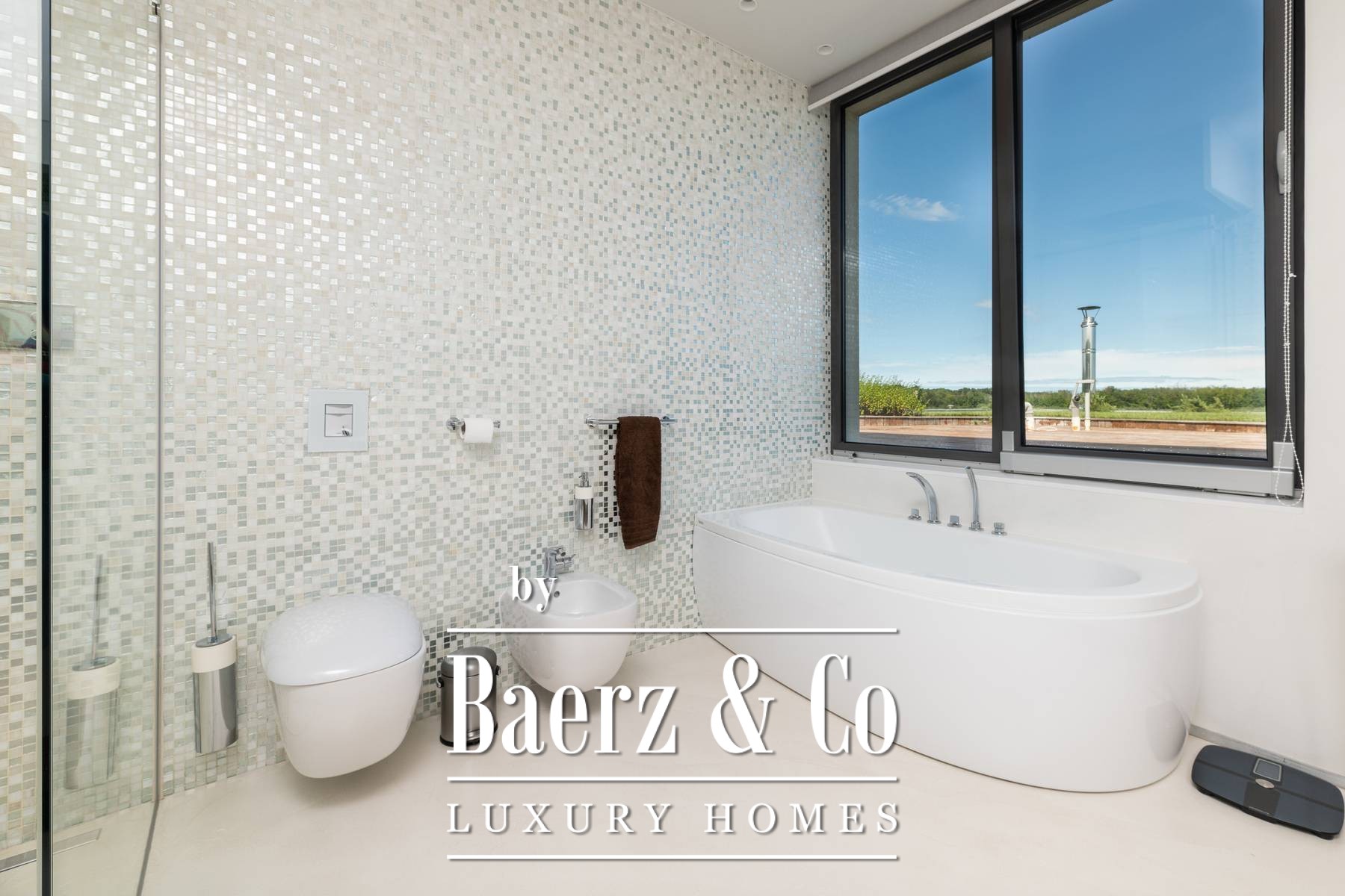 that is visible from the living room leads to the upper floor. It contains three bedrooms with bathrooms, a dressing room on the west side of the house and a common entrance hall. The roof of the living room is partly a passable fenced terrace, and partly a green roof.The roof above the first floor is a flat terrace, and above the living room on the ground floor is a flat walk-through terrace combined with a green roof.All windows and exterior doors are aluminum, glazed with IZO glass 4 + 12 + 4 mm.The number of storeys of the building is / P0 + Pr + 1K /, ie the basement, ground floor and first floor with a flat roof, partially passable.The building is fully finished and suitable for use or housing.It is located on a hill surrounded by olive groves. It has an arboretum in its environment on which 70 species of plants have been planted, of which very old olives stand out.In the spacious yard there are parking spaces for 5-6 cars and a garage for 4-5 cars.In this modern construction, attention is paid to quality so that internet cables are routed throughout the house. Modern technology is controlled via mobile phones, so it is a so-called "smart house".Special attention deserves a heated pool 5x9 m2 = 45 m2 which has a shutter that closes.This villa will satisfy the client who is looking for top quality.