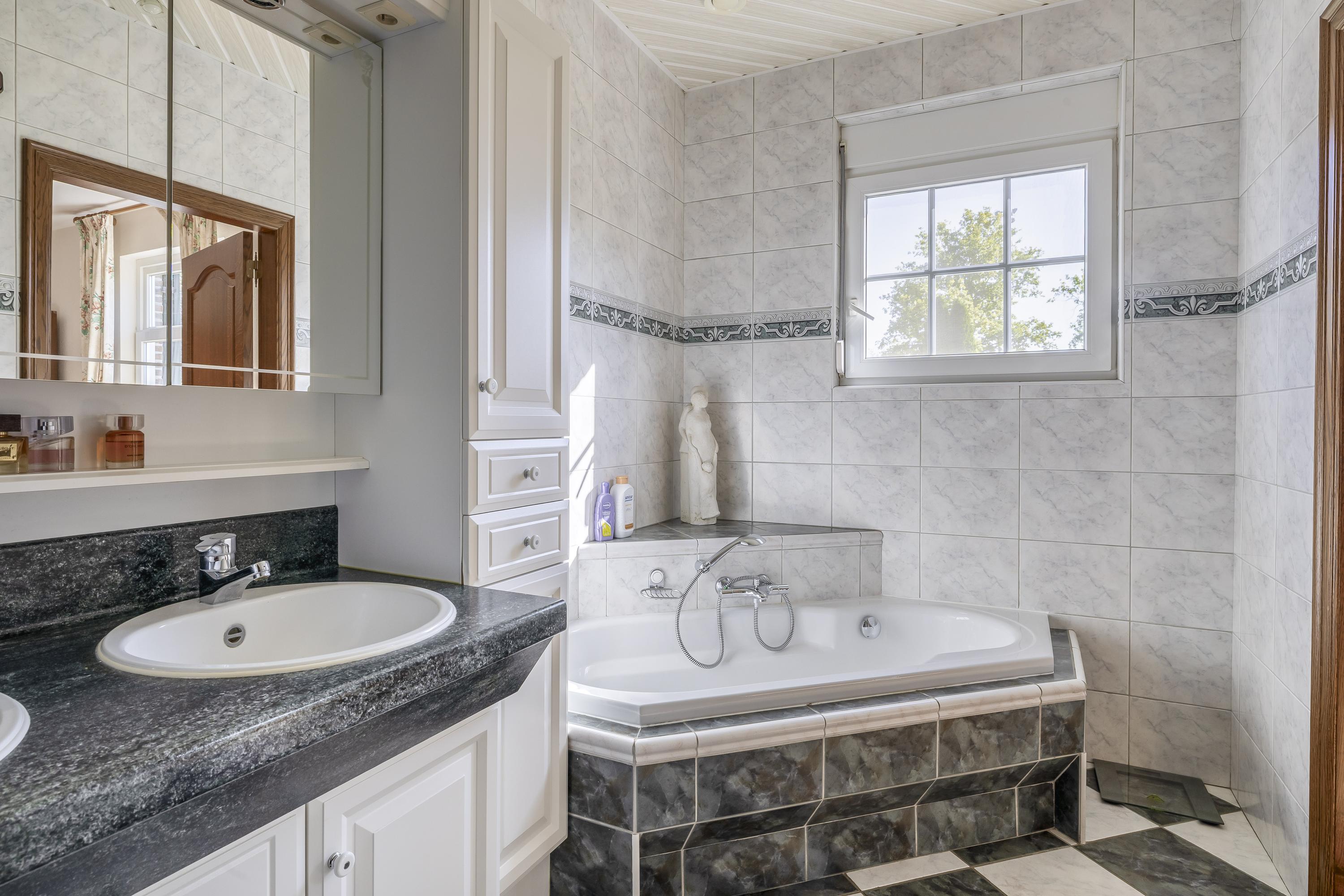 De aanpandige garage is uitgerust met een gootsteen en een vaste kastenwand met schuifdeuren. In deze kast is