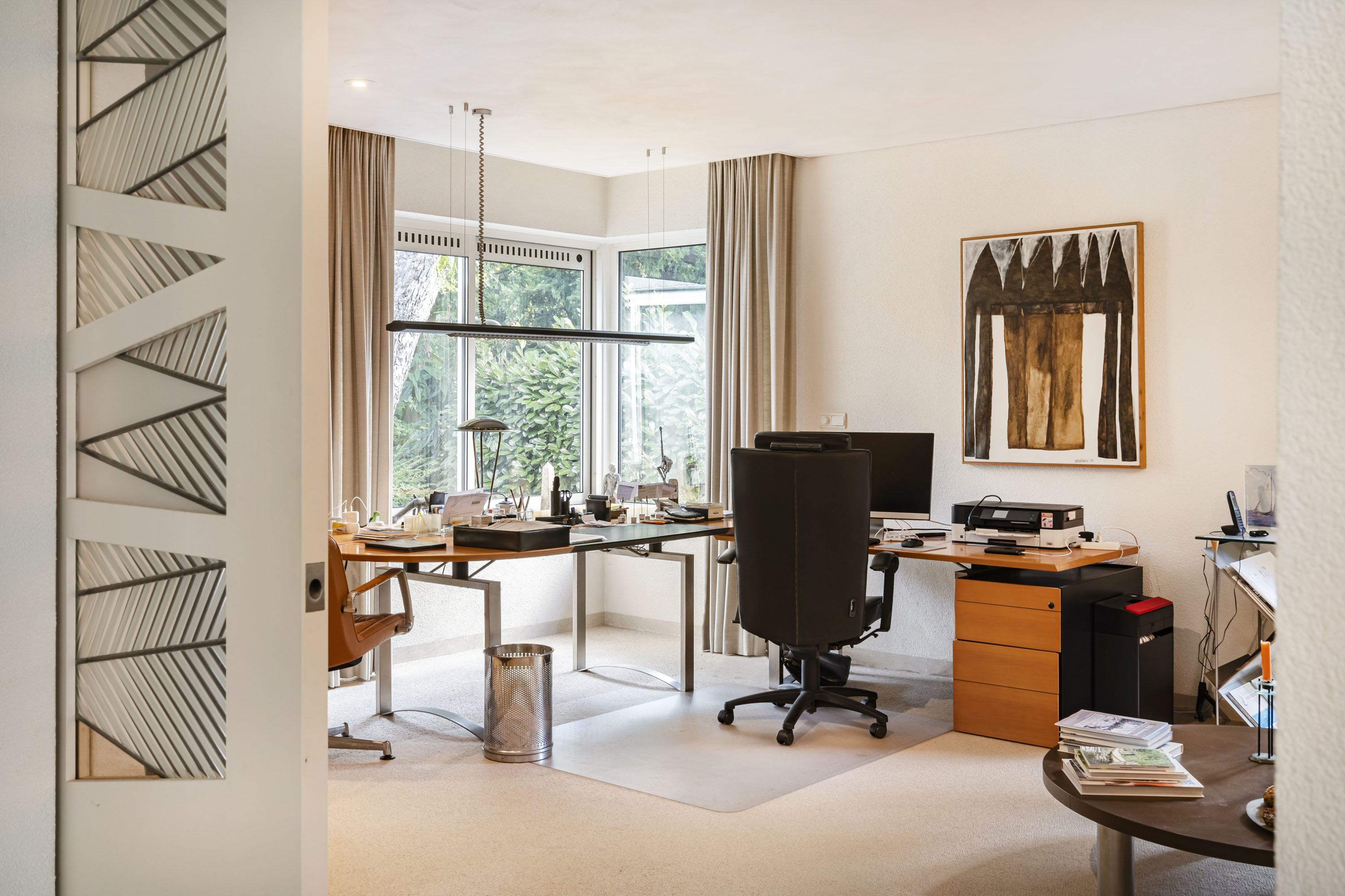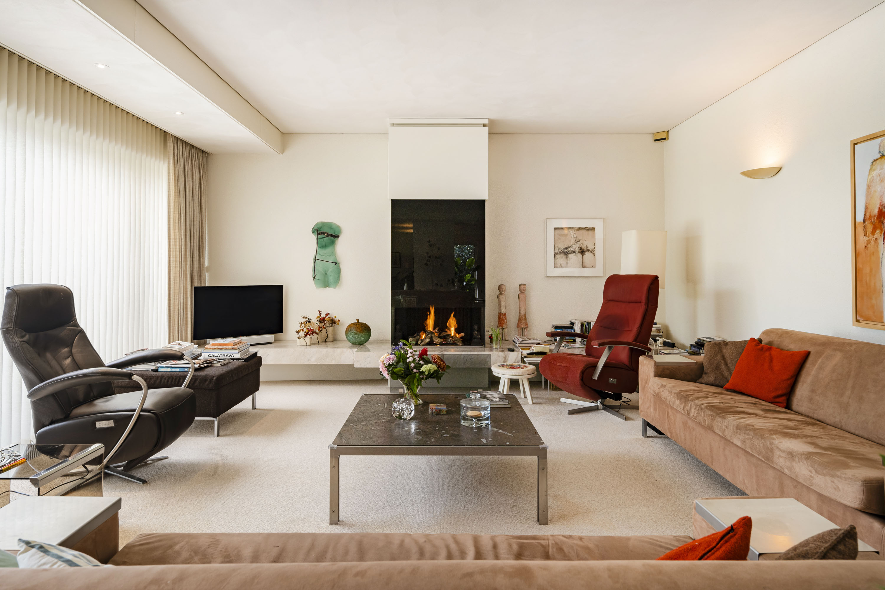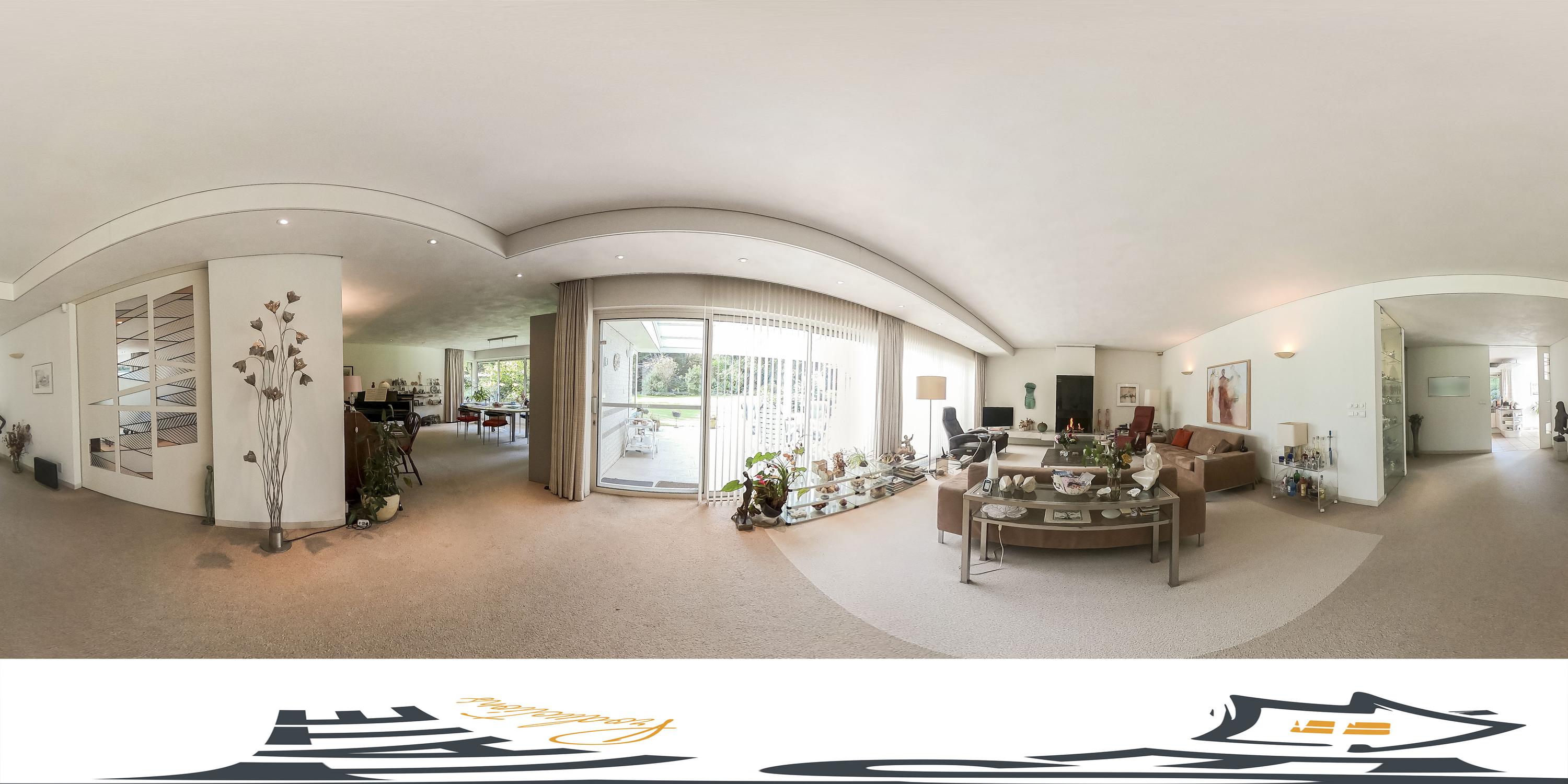 Als we verder gaan op de begane grond komen we in het zeer royale woongedeelte. De zitkamer beschikt over een glazen pui over de gehele breedte, waardoor er werkelijk een fantastisch uitzicht is over de tuin. Verder is er een leefkeuken met een aangrenzende bijkeuken voorzien van een goederenlift vanuit het souterrain. De eetkamer is gesitueerd aan de tuinzijde en daartussen bevindt zich een royale werkkamer. Al deze ruimten in het woongedeelte staan in open verbinding met elkaar. Werkkamer en keuken kunnen met fraaie schuifdeuren afgescheiden worden. Het royale overdekte buitenterras grenzend aan de zitkamer is voorzien van een elektrisch schuifdak inclusief zonwering en heeft haar toegang vanuit de zitkamer middels een schuifpui.