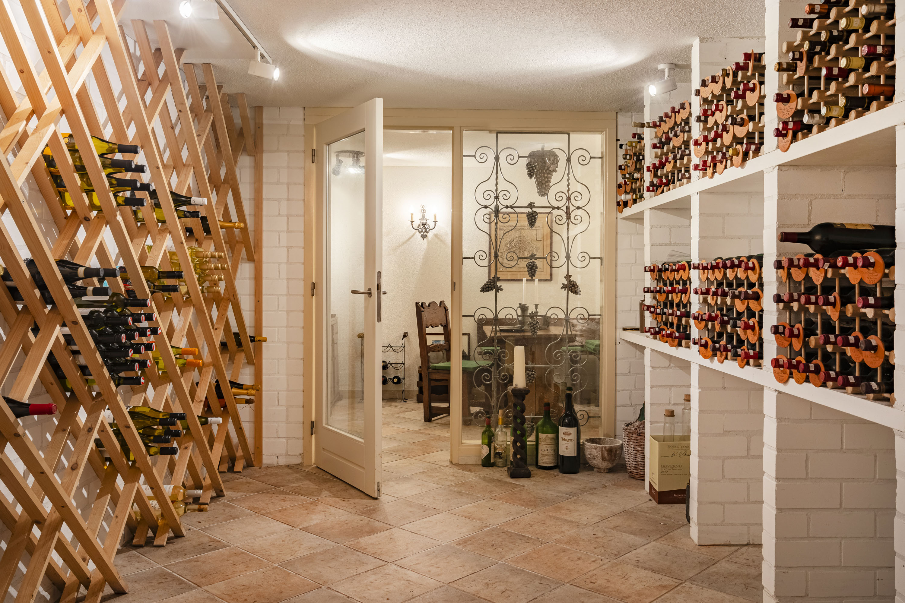 Dit ruime souterrain beschikt over een ruime garage met plek voor 2 auto's. Verder is de garage voorzien van een elektrische deur en een laadpaal voor een elektrische auto. Daarnaast is er een prachtige wijnkelder, diverse bergruimtes, een technische ruimte met o.a de warmtepompen voor de woning en het inpandige zwembad met jetstream. Vanuit het souterrain is voor bewoners de toegang tot de woning.