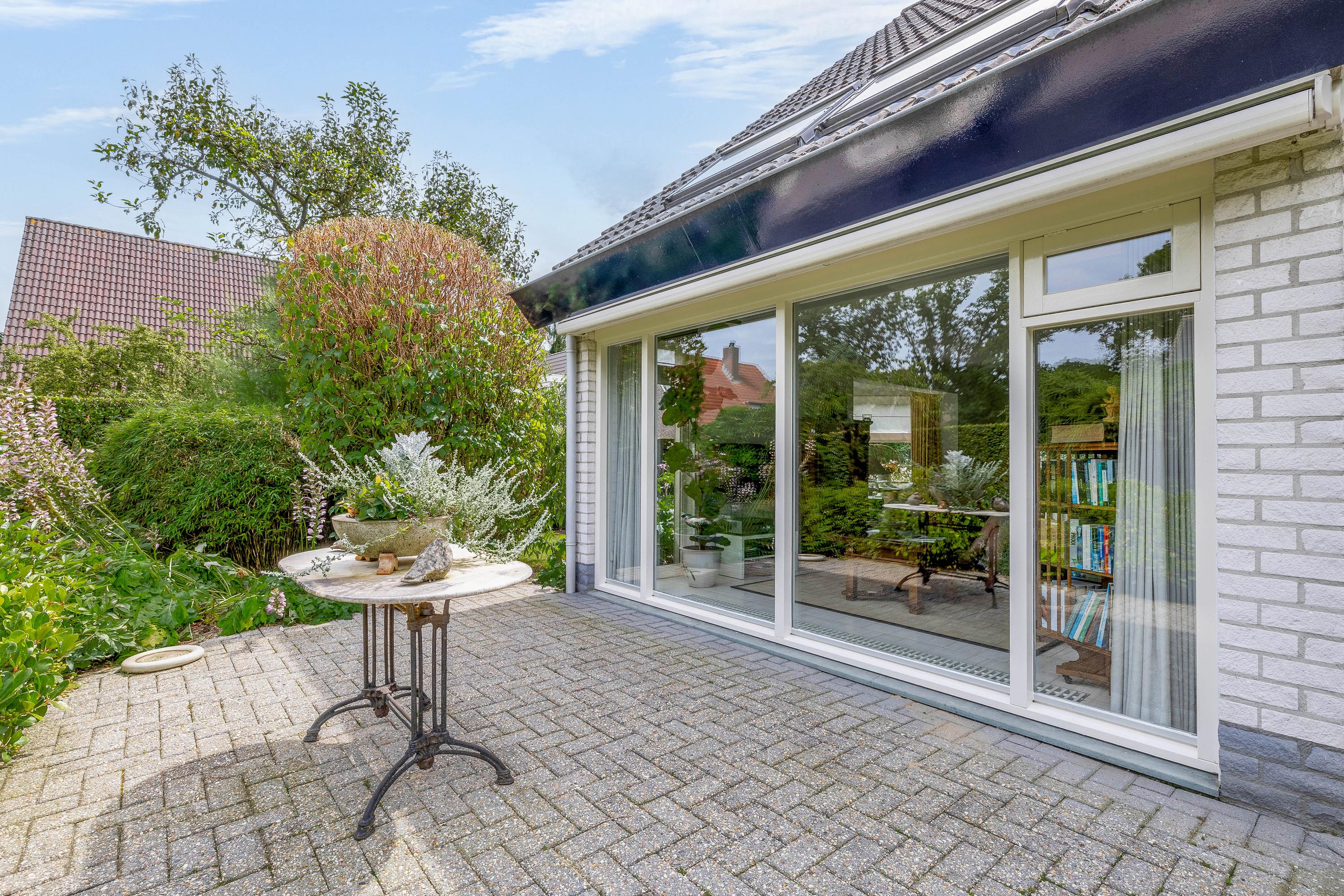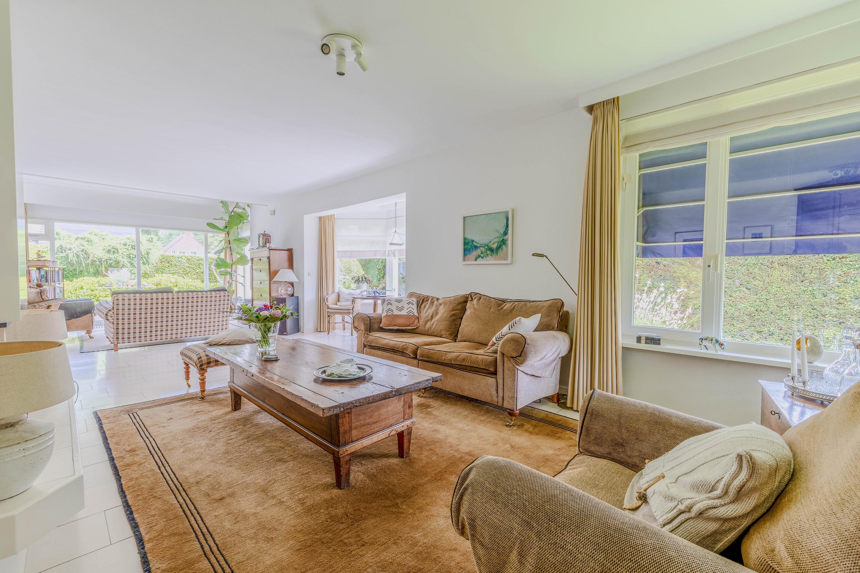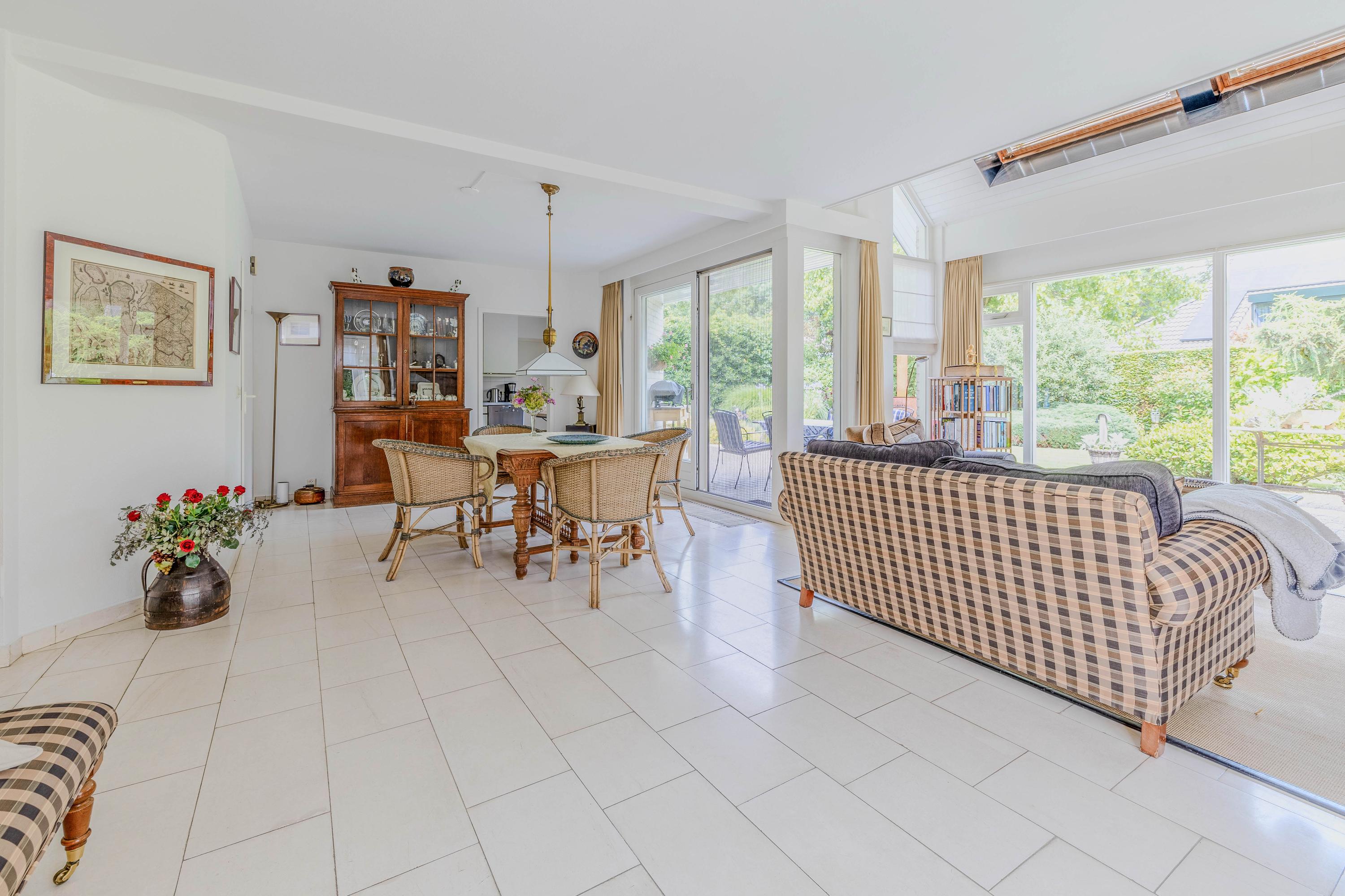 Vanuit de woonkamer loopt u via een schuifpui naar het royale- en deels overdekte terras en tuin. De ramen zijn voorzien van automatische zonwering.