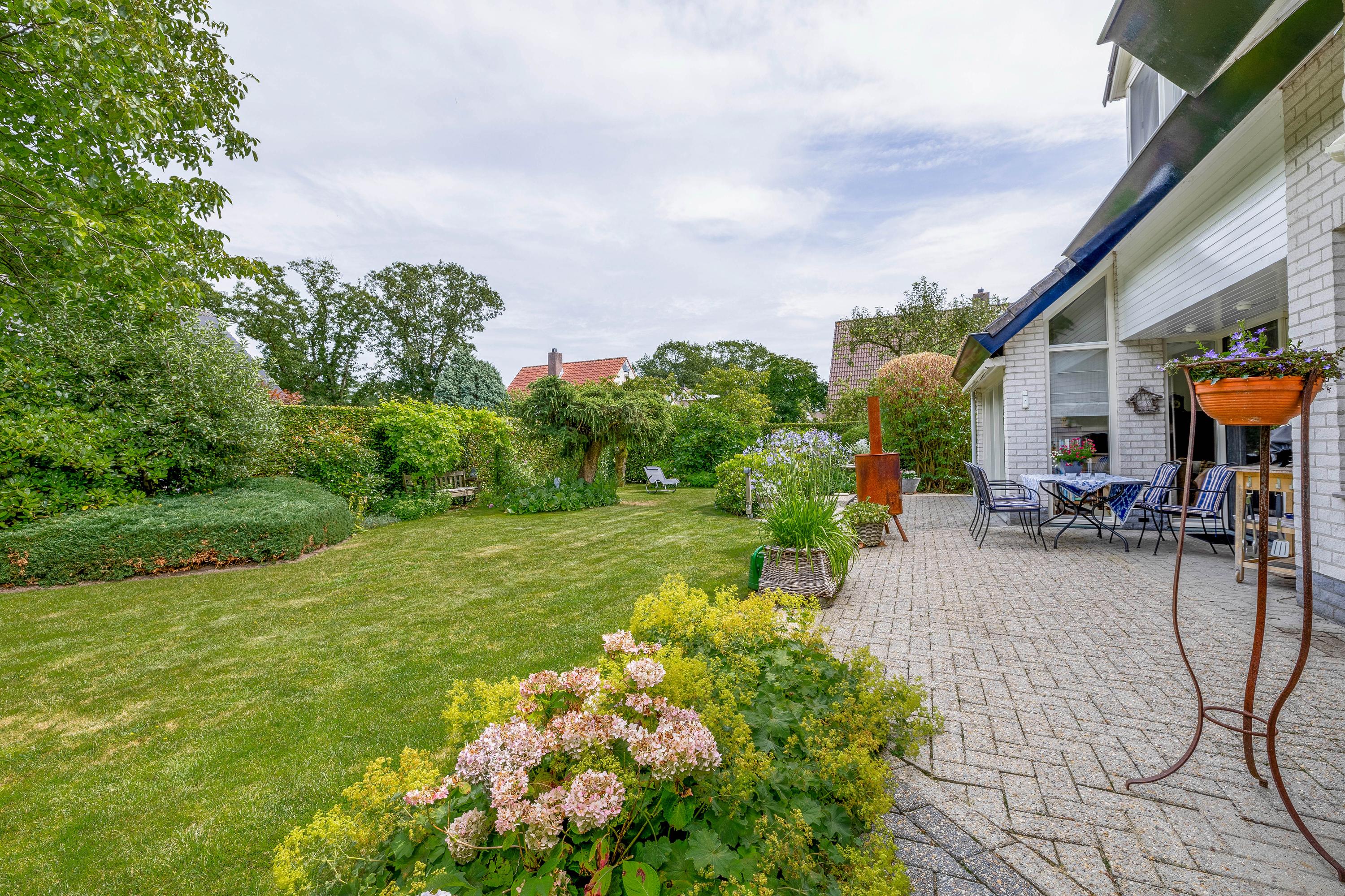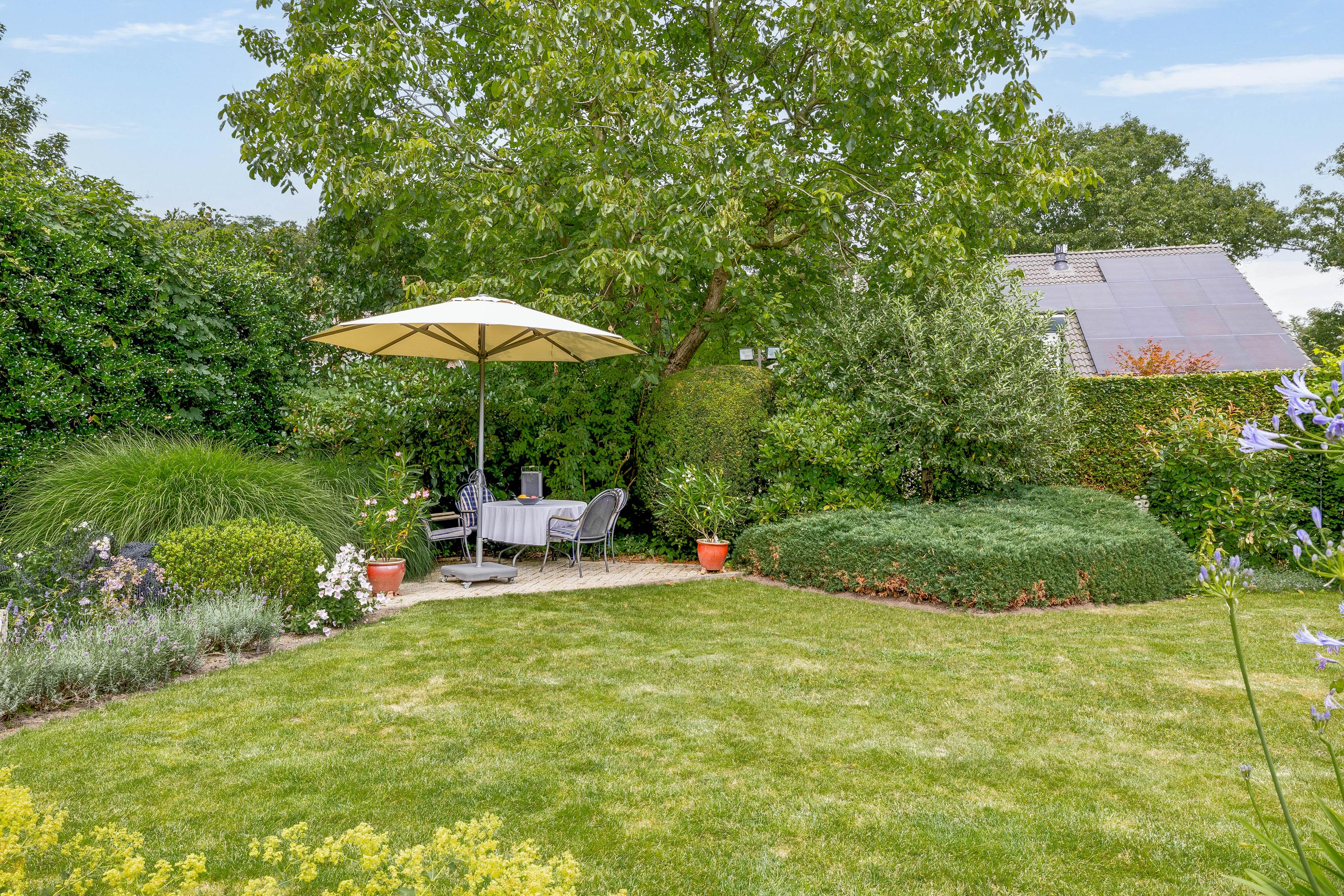 De woning heeft een prachtig aangelegde achtertuin met zeer veel groen en privacy. U geniet hier onder andere van gazon, borders met beplanting en enkele bomen. Er zijn diverse zitplekken aanwezig om heerlijk rustig te kunnen vertoeven.