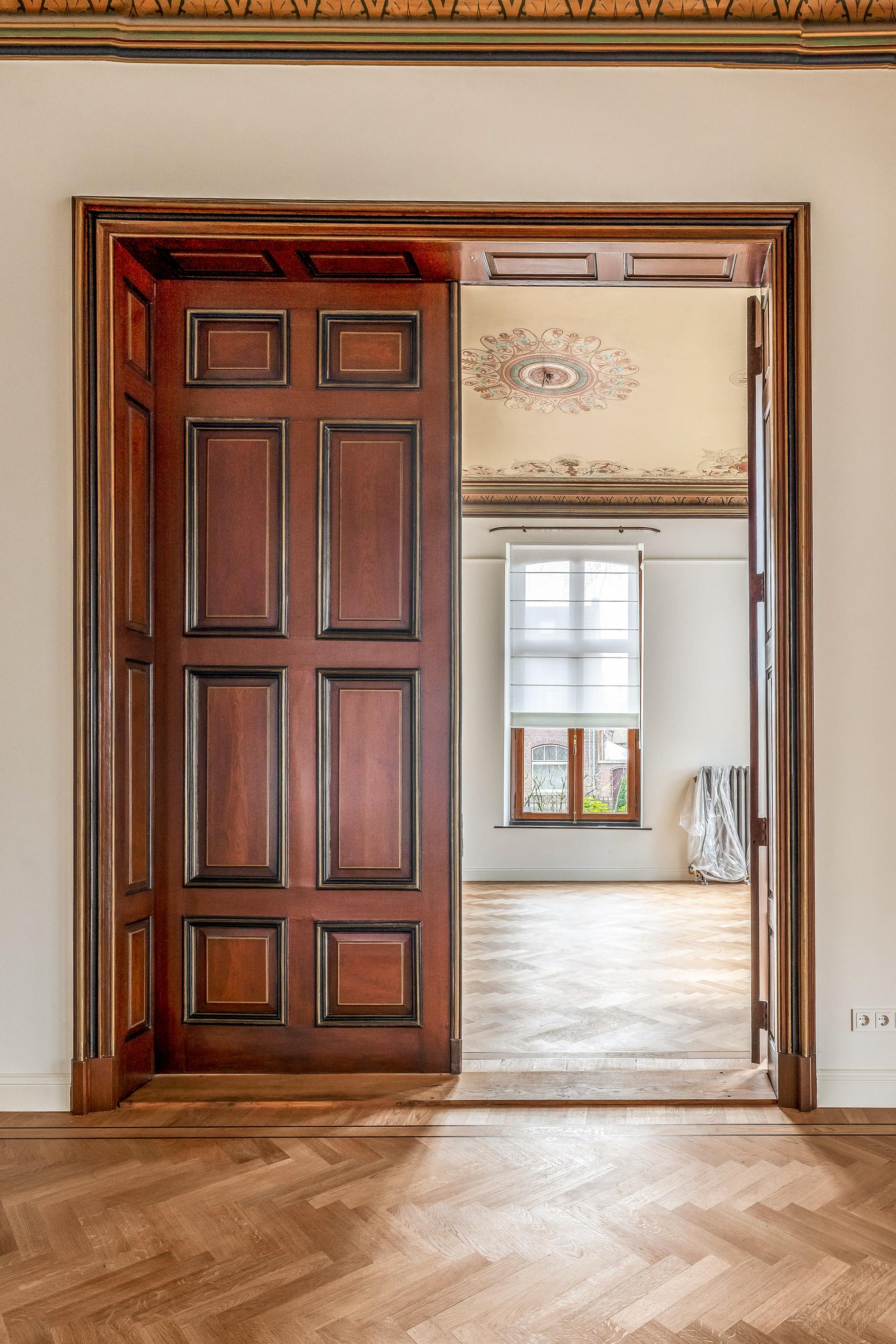 Vanuit de ontvangsthal bereikt u de royale en statige woonkamer, verdeeld in twee comfortabele zitgedeeltes die via grote, houten openslaande deuren van elkaar gescheiden kunnen worden. Zo kan er ook ruimte gecreëerd worden voor bijvoorbeeld een kantoor aan huis. Deze ruimtes worden gekenmerkt door de hoge plafonds en de indrukwekkende, authentieke plafondschilderingen die een tijdloze sfeer creëren. Het licht valt rijkelijk binnen en benadrukt de warme, uitnodigende ambiance van deze leefruimtes.