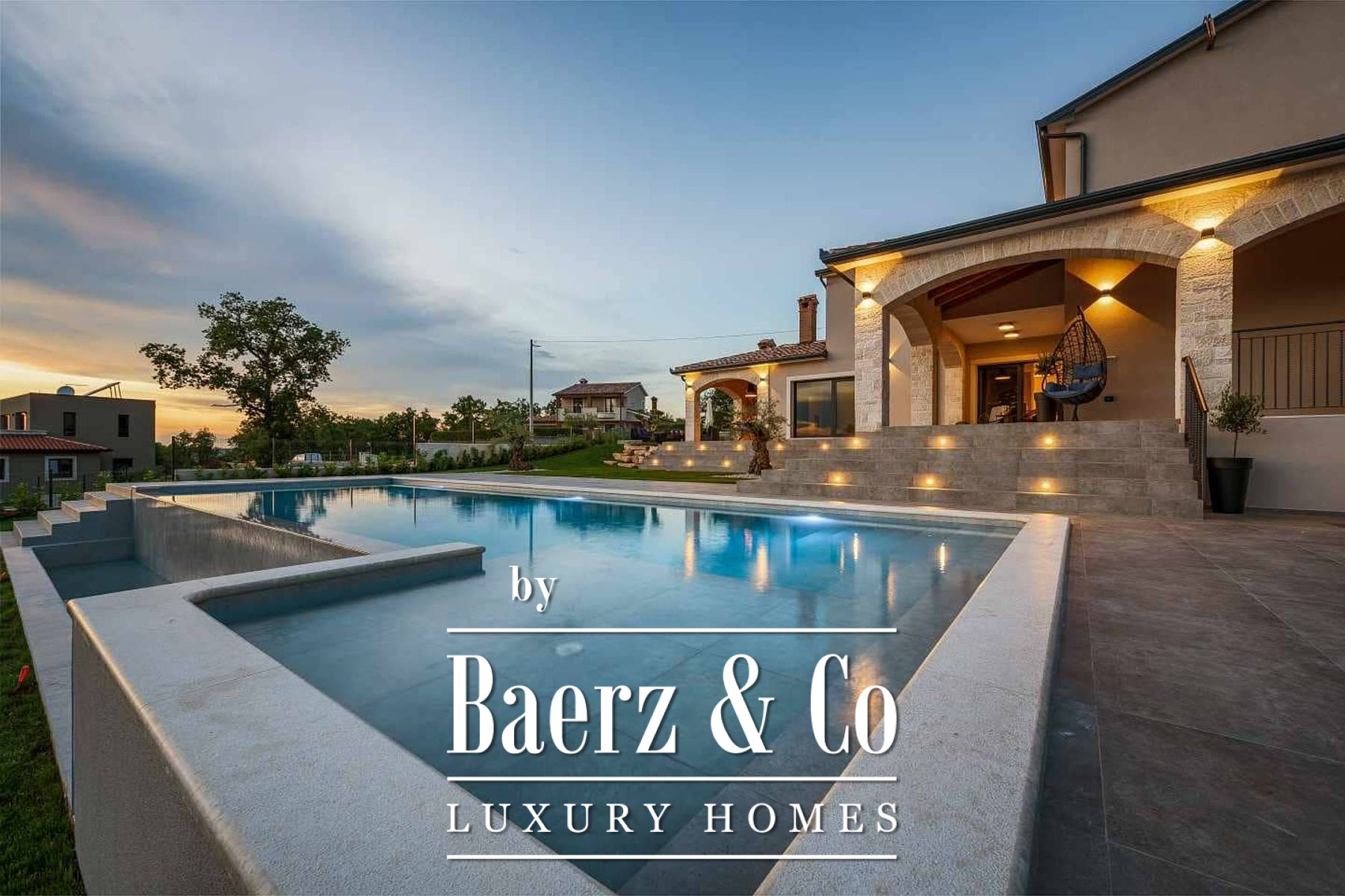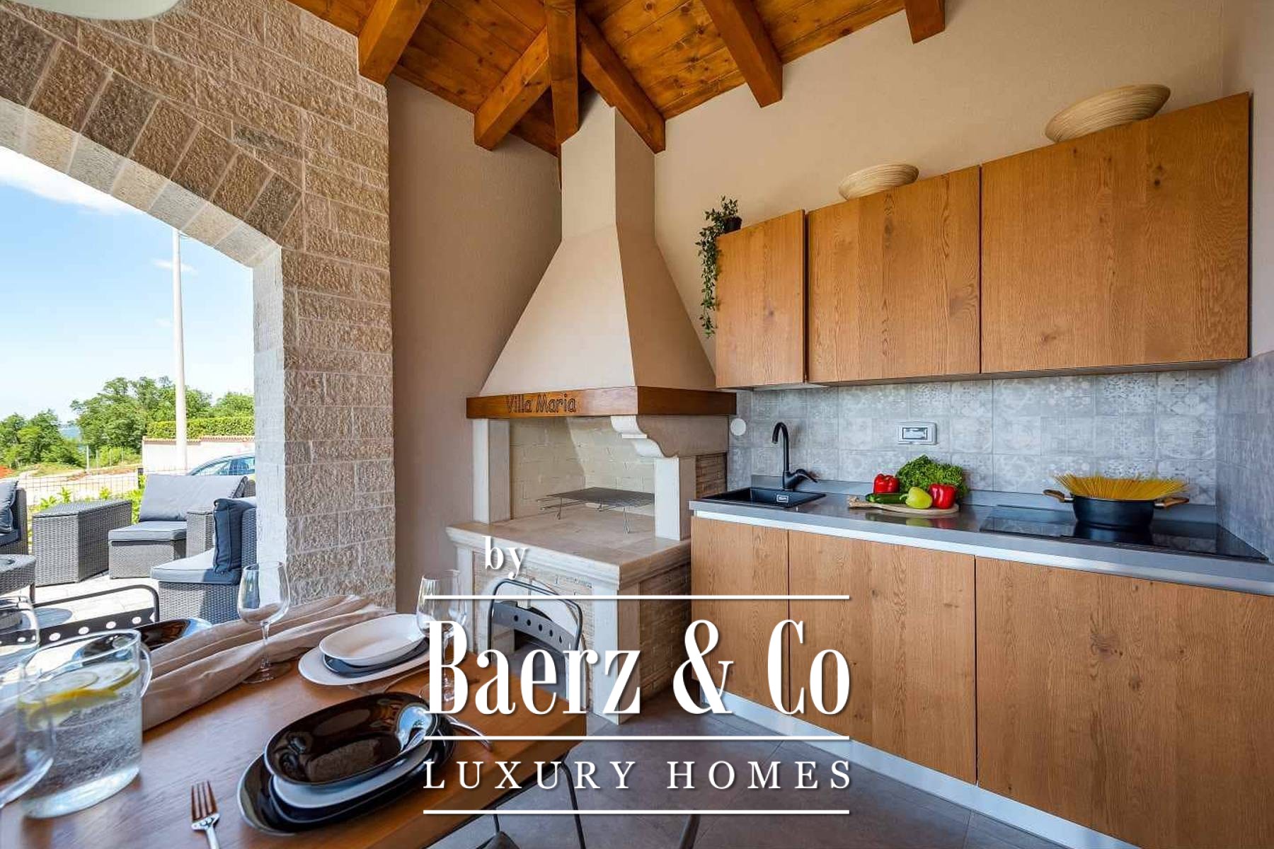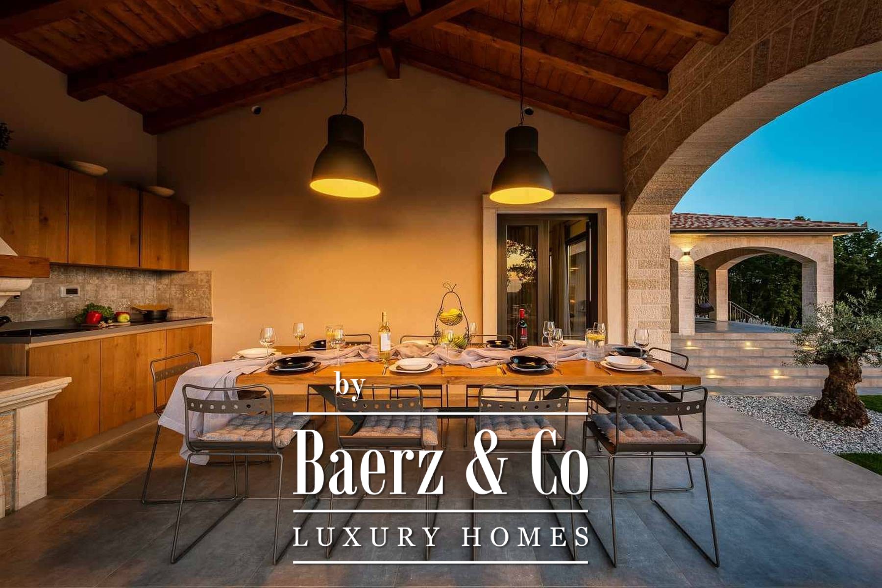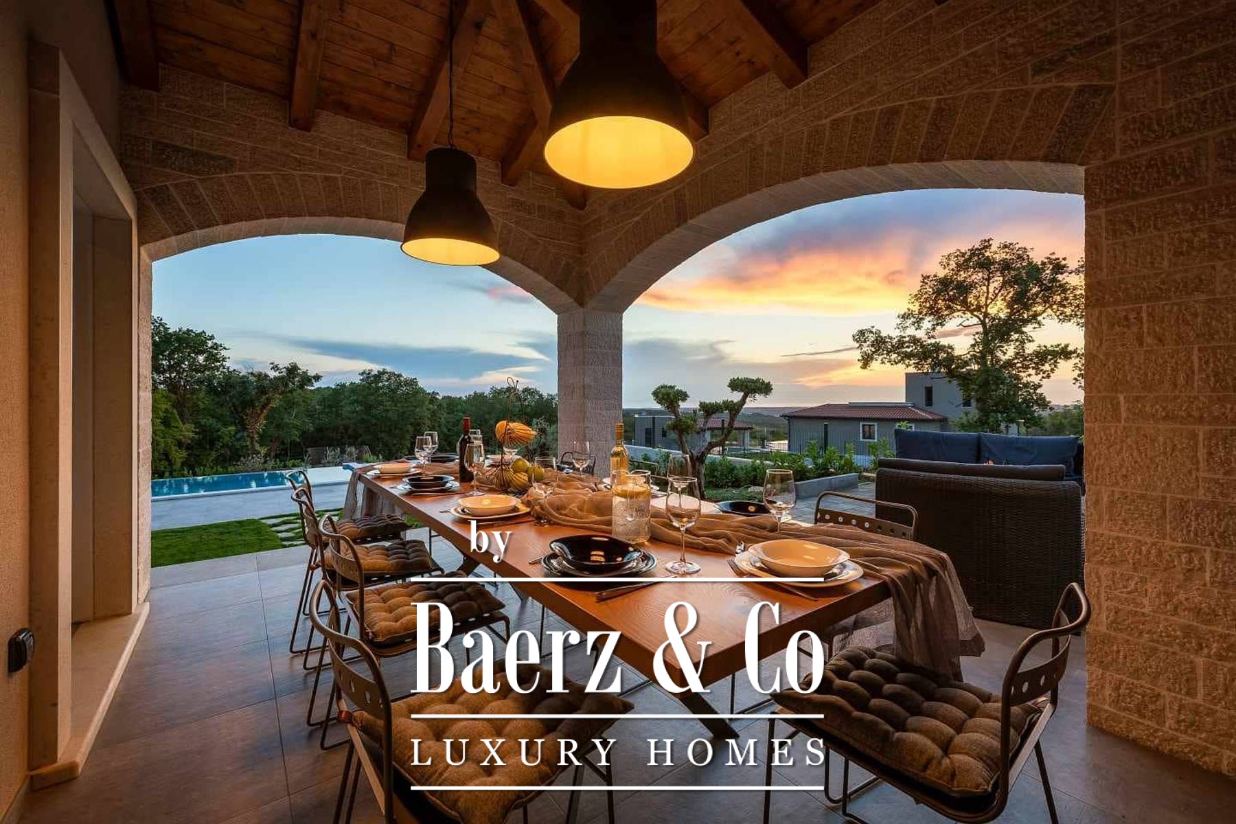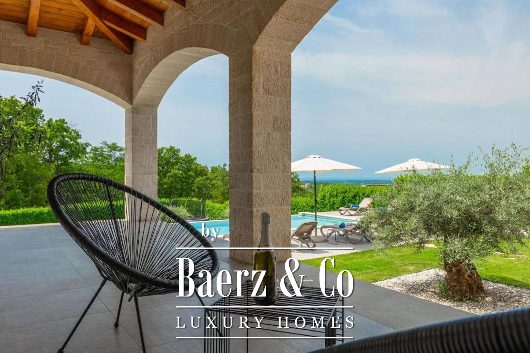 Not far from Vižinada is this luxurious, modern, and rustic villa that was built in 2020 and is located on a private plot of 1630 m2 with a beautiful panoramic view of the sea. The villa of 280 m² is spread over two floors. On the ground floor, there is a spacious living room with a fully equipped kitchen, a dining room, a bathroom, and a bedroom with its bathroom. An internal staircase leads us to the first floor, where there are three more bedrooms, each with a bathroom. The villa also has a basement with an area of 350 m2. On the large, fully fenced property, there