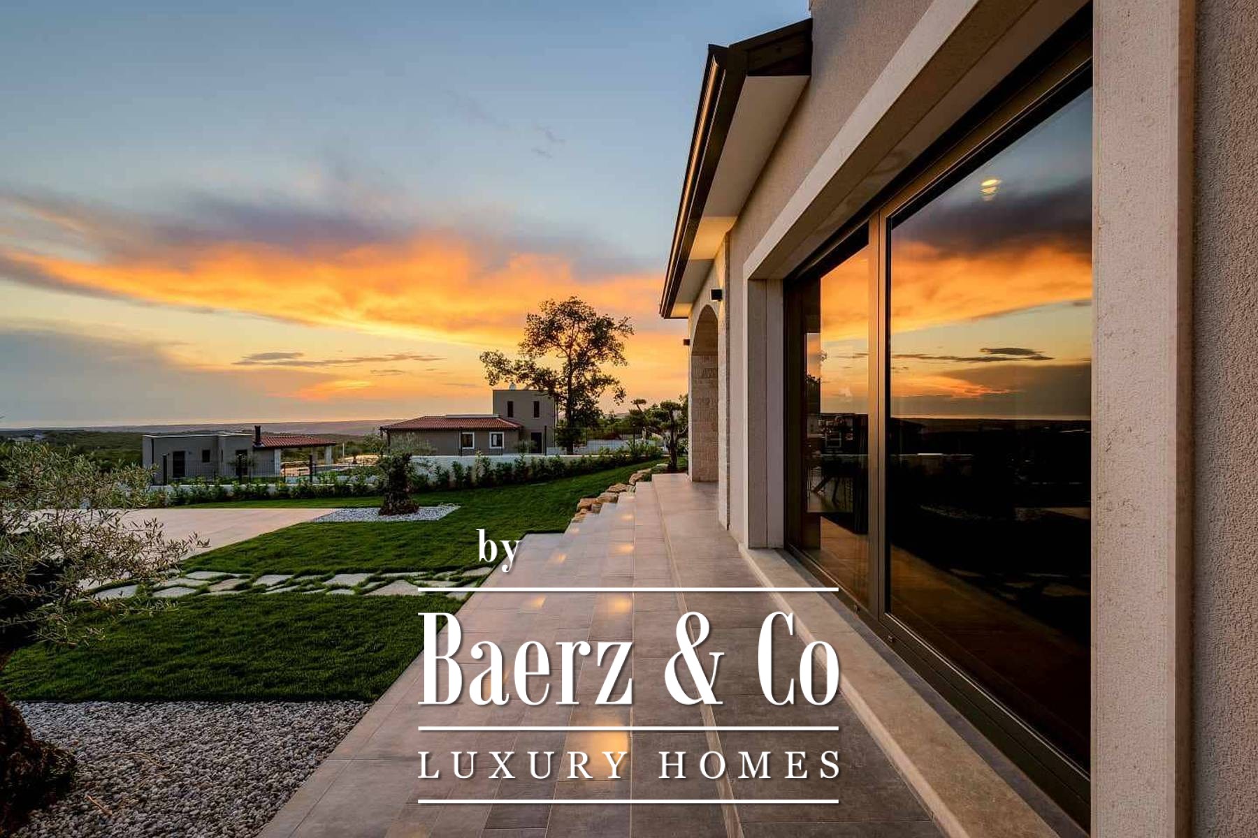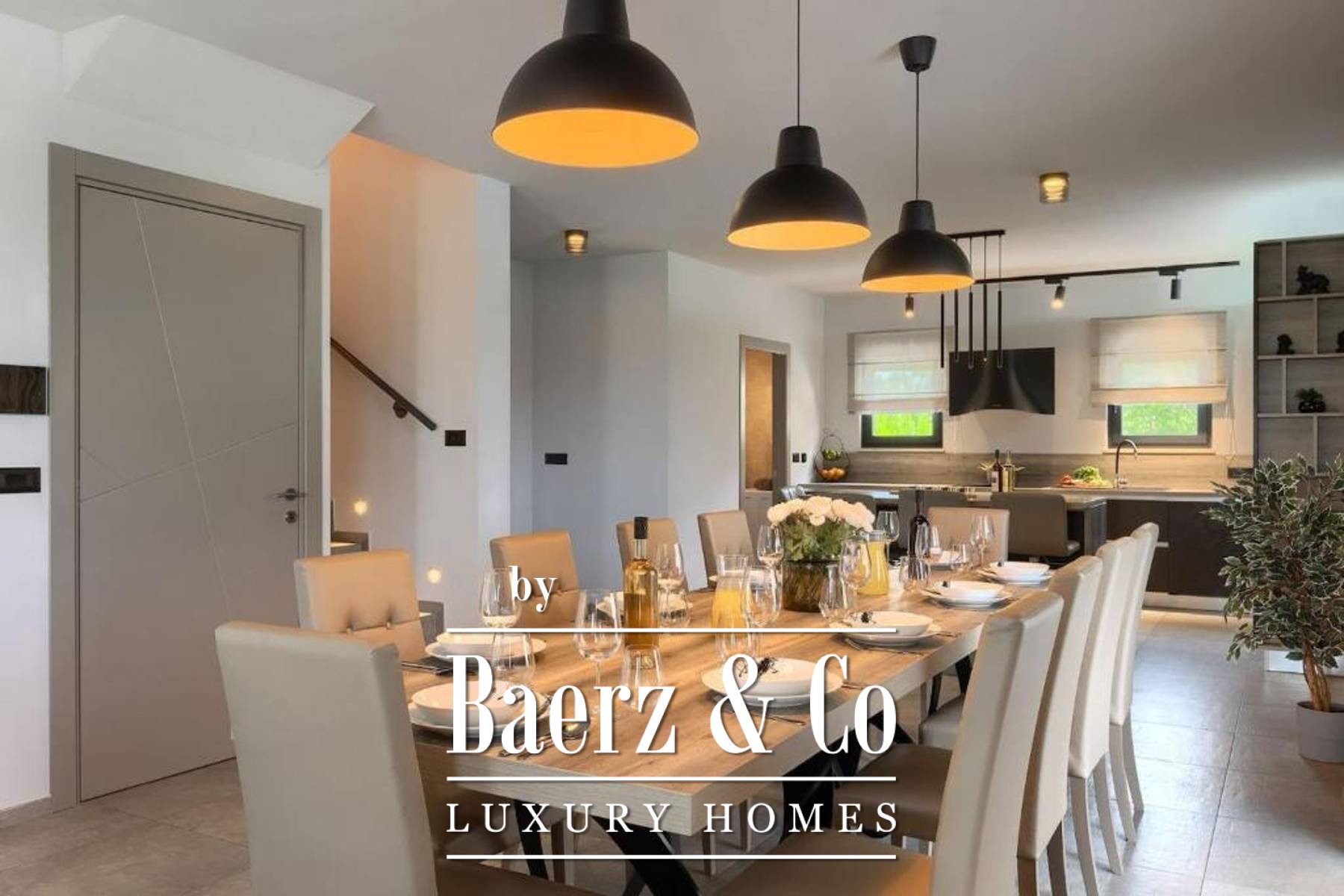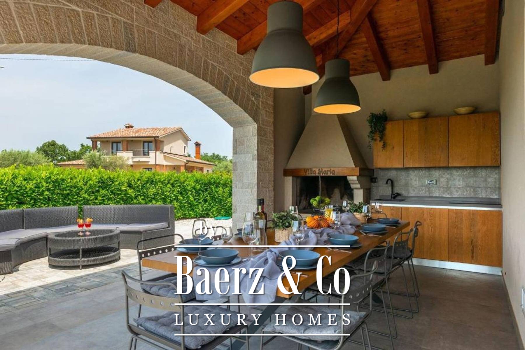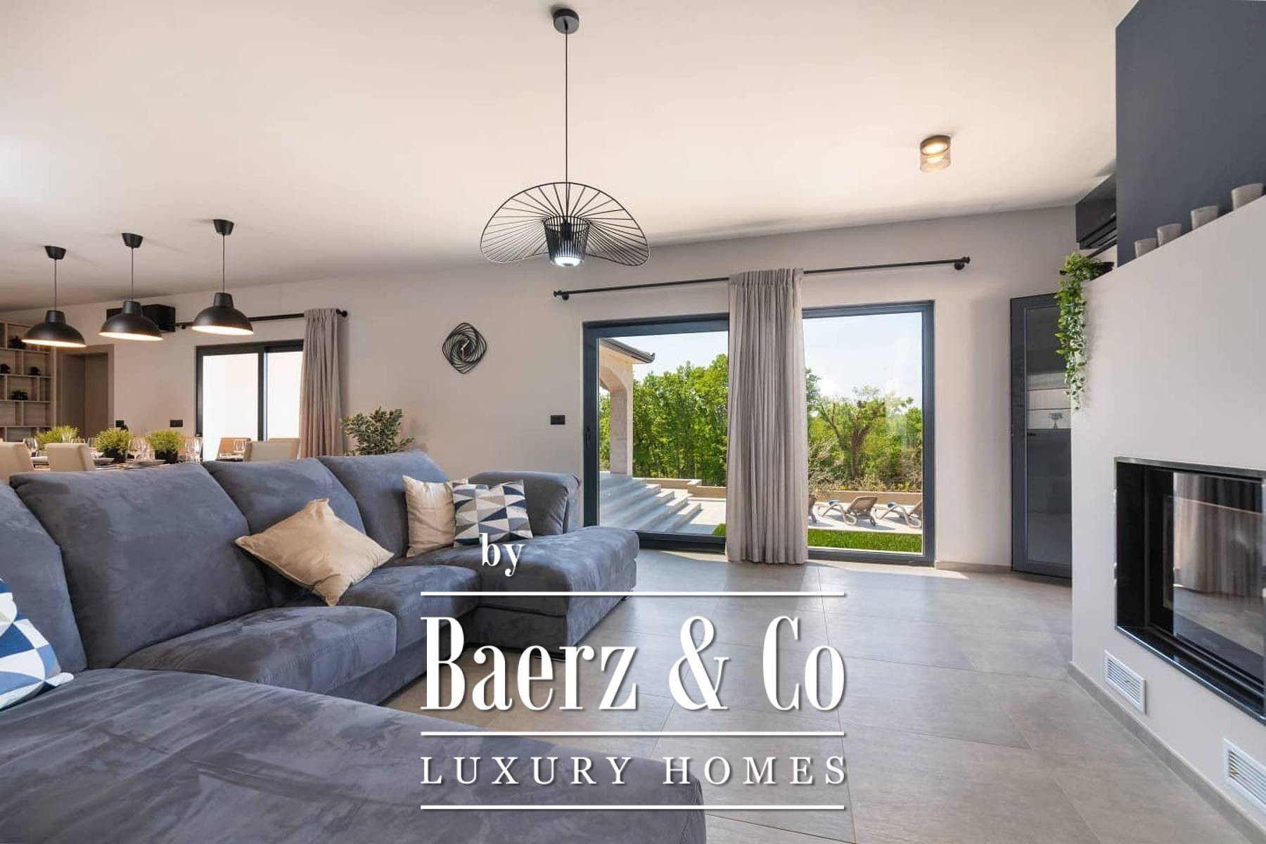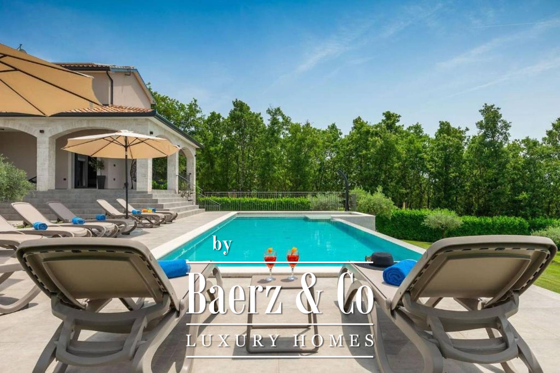 Not far from Vižinada is this luxurious, modern, and rustic villa that was built in 2020 and is located on a private plot of 1630 m2 with a beautiful panoramic view of the sea. The villa of 280 m² is spread over two floors. On the ground floor, there is a spacious living room with a fully equipped kitchen, a dining room, a bathroom, and a bedroom with its bathroom. An internal staircase leads us to the first floor, where there are three more bedrooms, each with a bathroom. The villa also has a basement with an area of 350 m2. On the large, fully fenced property, there