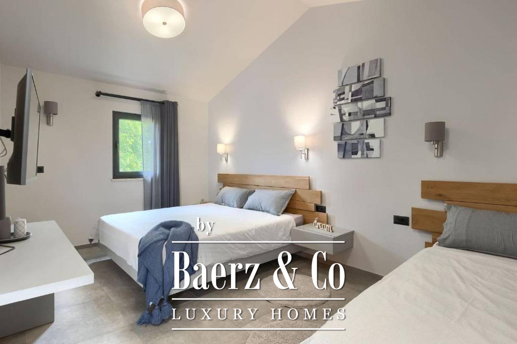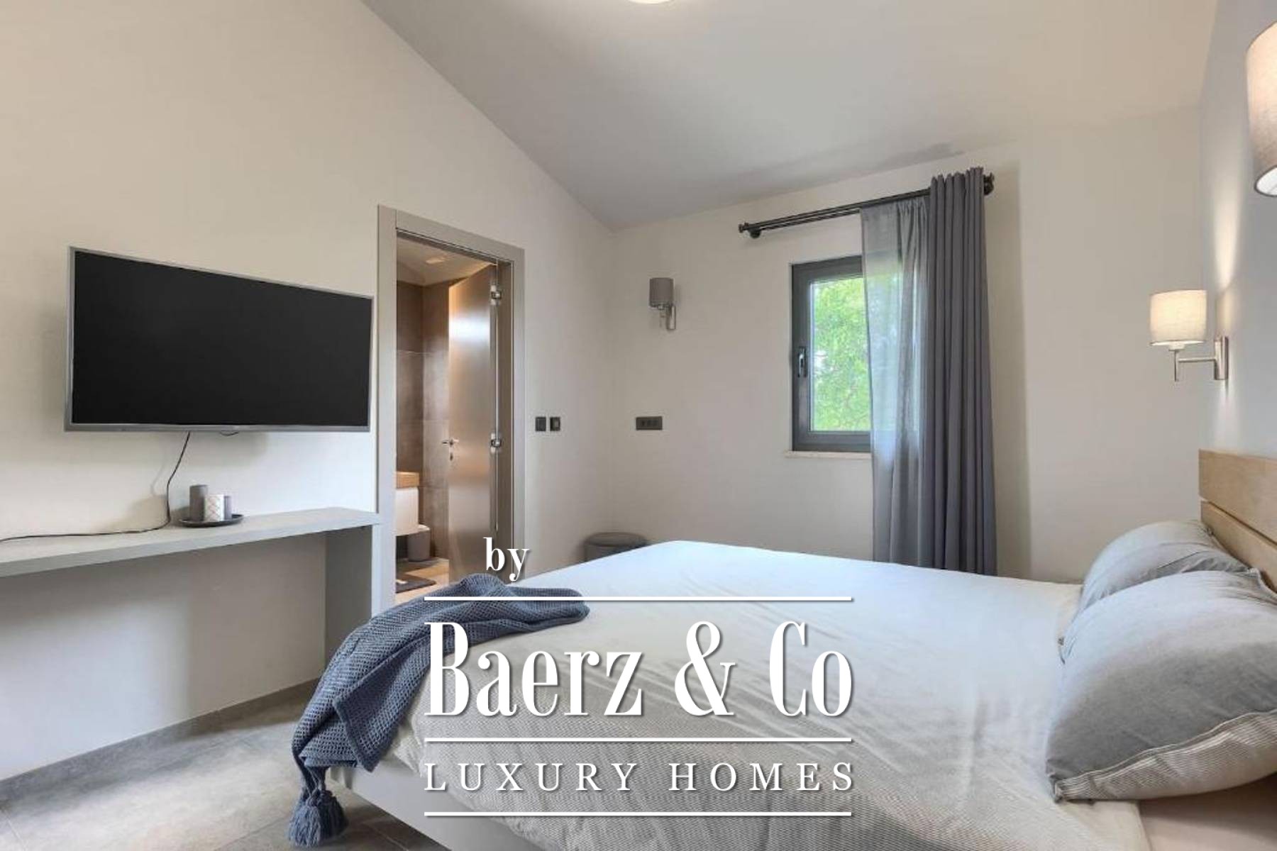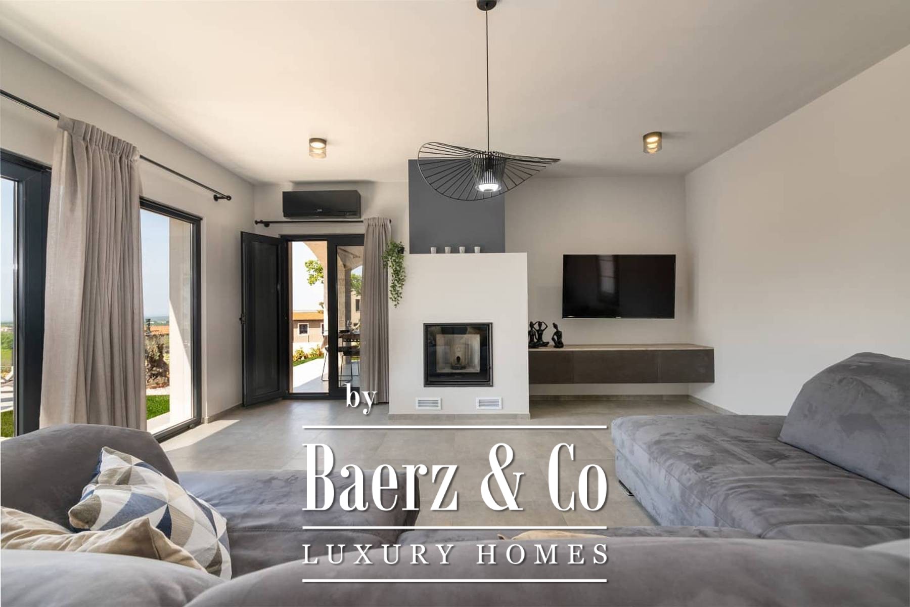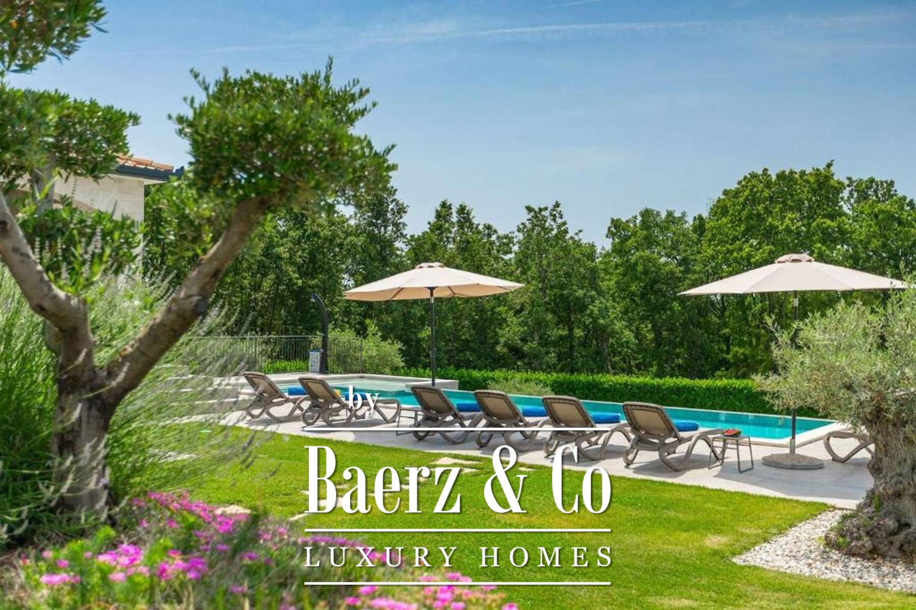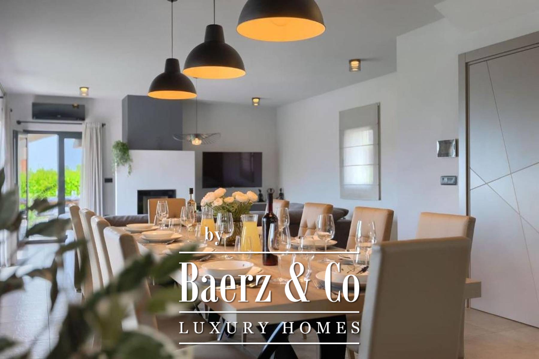 Not far from Vižinada is this luxurious, modern, and rustic villa that was built in 2020 and is located on a private plot of 1630 m2 with a beautiful panoramic view of the sea. The villa of 280 m² is spread over two floors. On the ground floor, there is a spacious living room with a fully equipped kitchen, a dining room, a bathroom, and a bedroom with its bathroom. An internal staircase leads us to the first floor, where there are three more bedrooms, each with a bathroom. The villa also has a basement with an area of 350 m2. On the large, fully fenced property, there