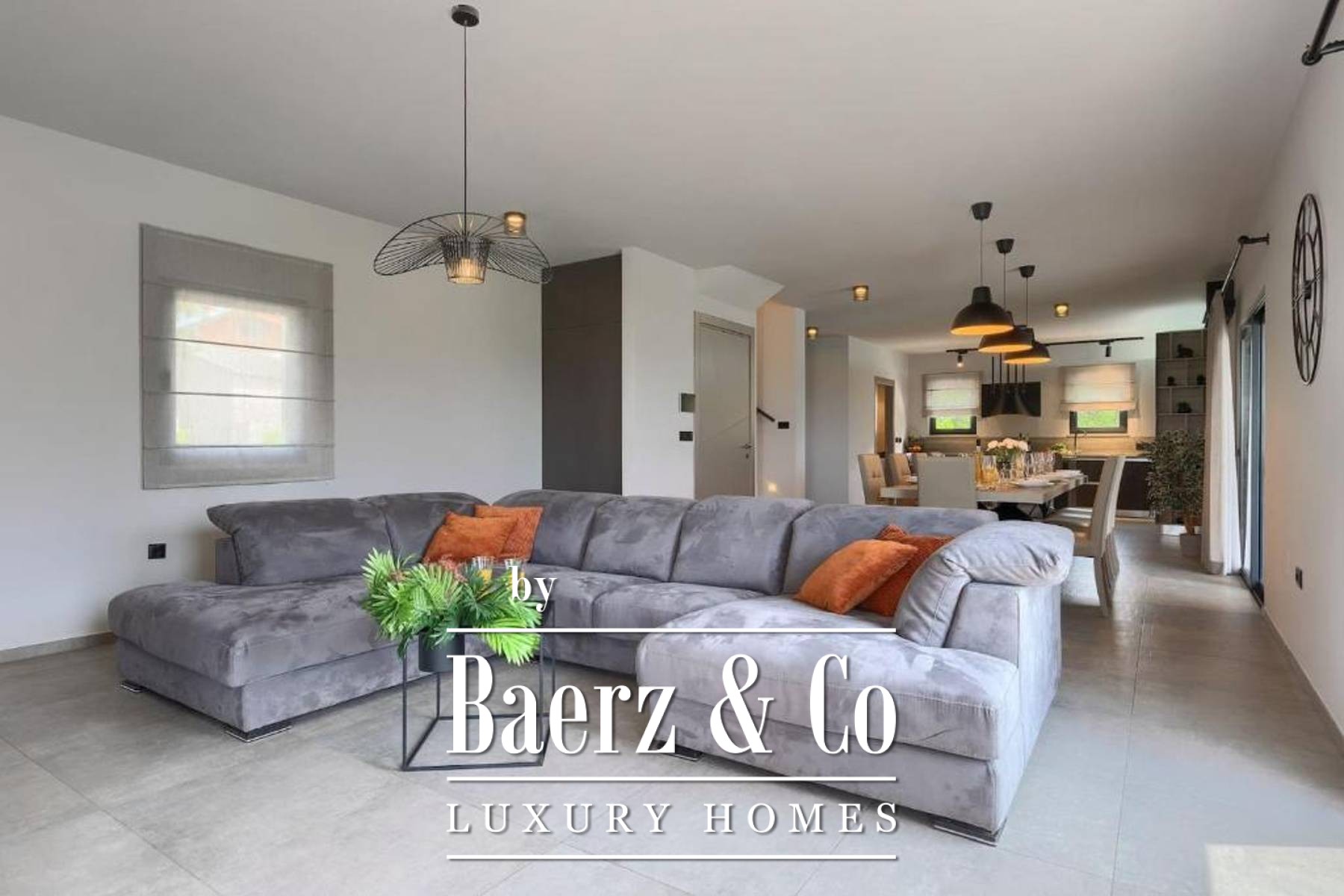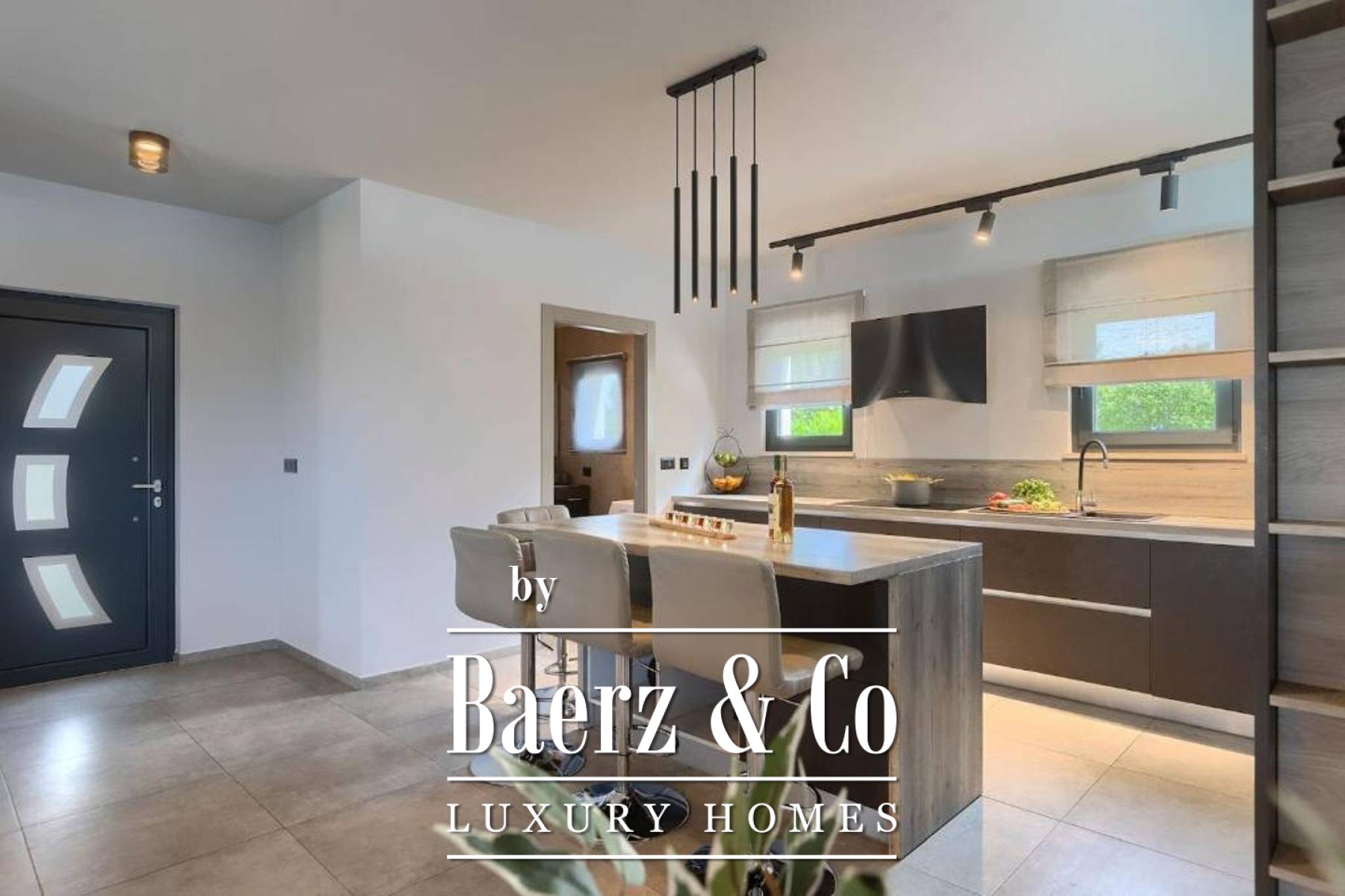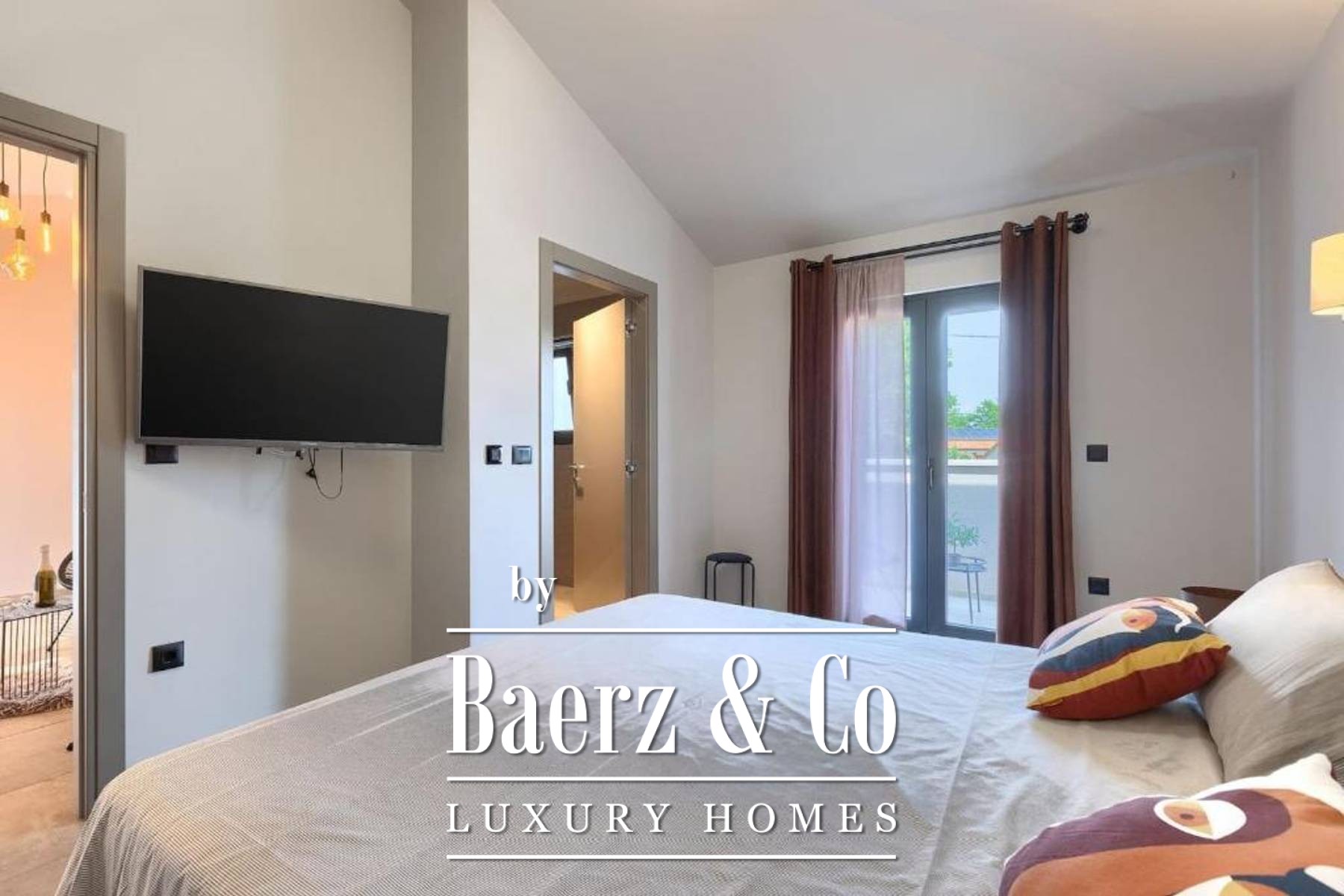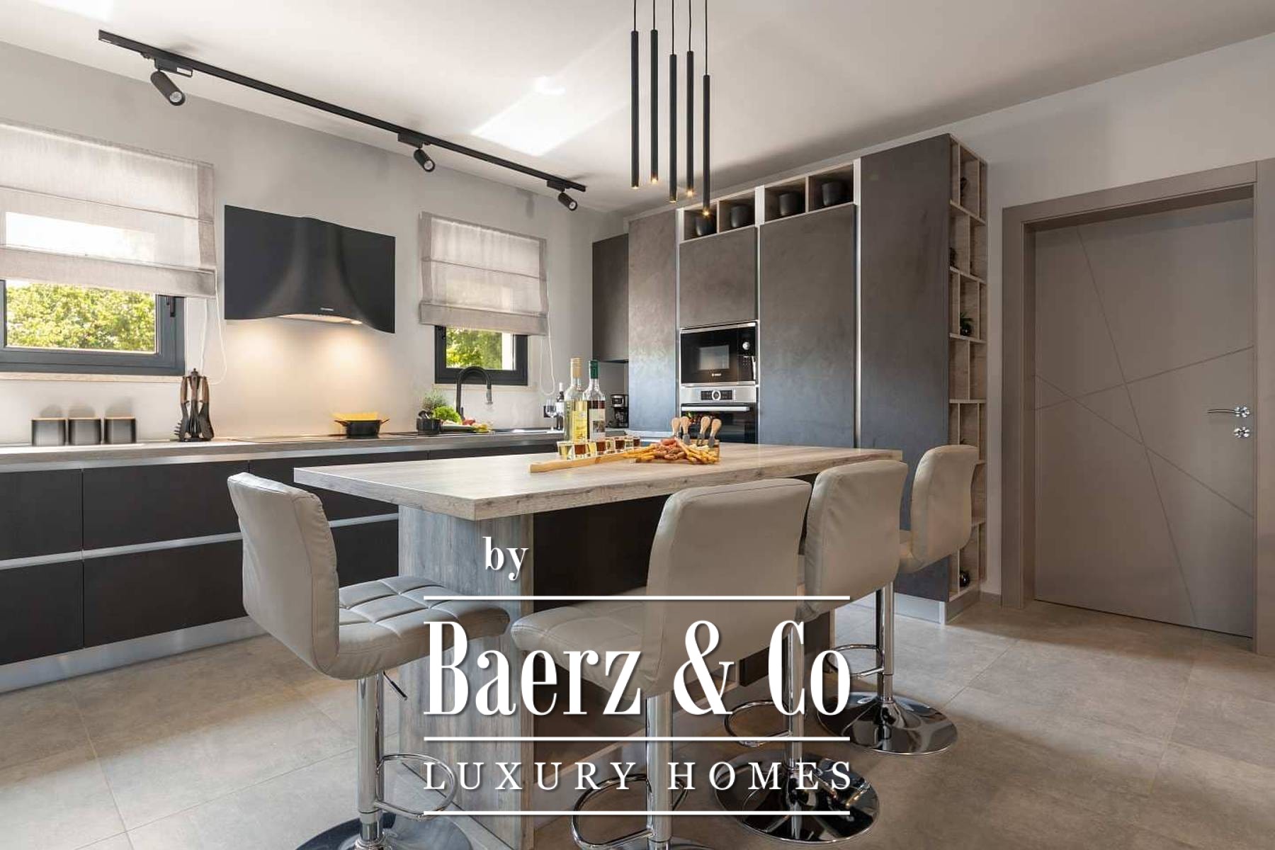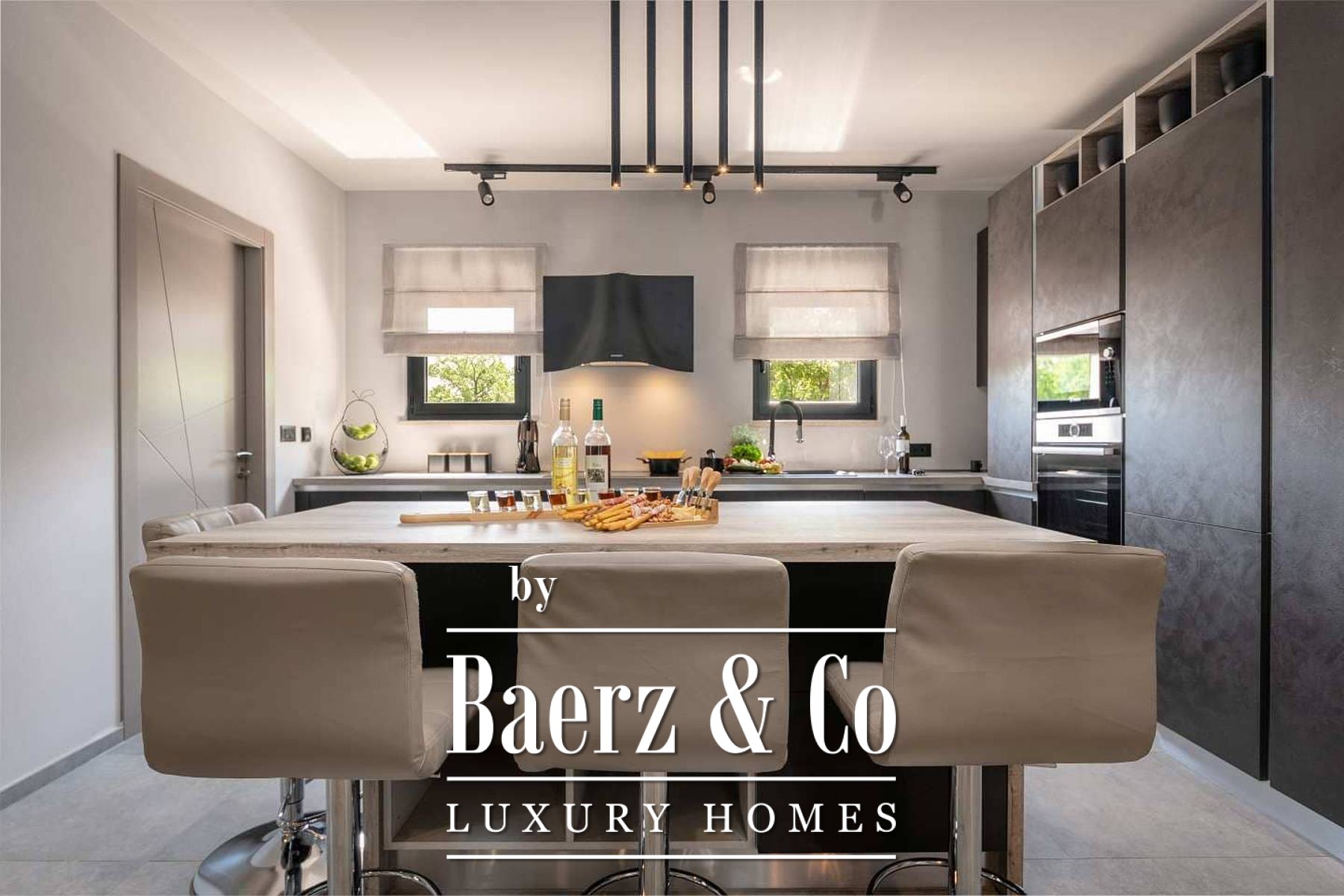 Not far from Vižinada is this luxurious, modern, and rustic villa that was built in 2020 and is located on a private plot of 1630 m2 with a beautiful panoramic view of the sea. The villa of 280 m² is spread over two floors. On the ground floor, there is a spacious living room with a fully equipped kitchen, a dining room, a bathroom, and a bedroom with its bathroom. An internal staircase leads us to the first floor, where there are three more bedrooms, each with a bathroom. The villa also has a basement with an area of 350 m2. On the large, fully fenced property, there