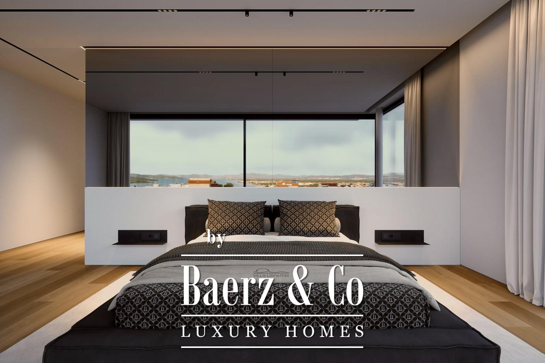 Ajax alarm system (motion, smoke, gas, CO2 sensors), Dahua intercom (biometric entry - face, fingerprint; QR code, chip, bracelet)...The first floor has a total area of 187.60 m² and features four spacious bedrooms. Each bedroom has its own bathroom, and the master bedroom also includes a walk-in closet.FIRST FLOOR equipment: Weitzer oak brushed and oiled parquet, roof window 360x120, motorized opening, Ditre Flann 2.0 beds, 1x Hansgrohe Rainfinity 360 shower, custom Corian countertop in matte white with two sinks, 2x Vitra wall-mounted sensor faucets, separate WC with ventilation, custom motorized blackout curtains (remote, switch, touch), Refin Keramika Feel White Strutturato in the bathroom, underfloor heating and Mitsubishi recuperator, custom wardrobe.GENERAL equipment: TKE elevator with black glass and mirror, Mitsubishi split air conditioning system with discreet ducted diffuser in all rooms, Vessmann water tank, Aquahome 30 Smart water softener, all rooms have access to a balcony - with optiwhite glass (railing) and integrated LED light in the lower channel, mirror extending from the basement to the top, Alumil S650 sliding doors with double glazing, city water, bio pit with purifier, pre-preparation for city sewerage, villa constructed with reinforced waterproof concrete, basement is waterproofed with Voltex.Located in a beautiful, quiet, and attractive area in the city of Vodice, just about 15 minutes by car from the city of Šibenik.For more information, please inquire.