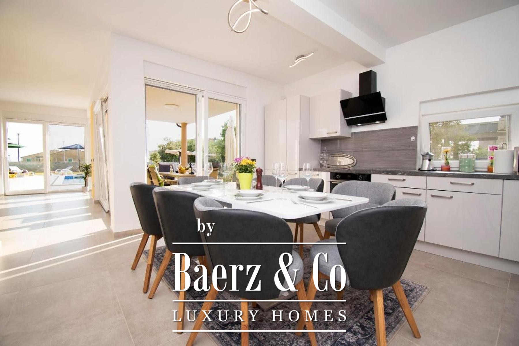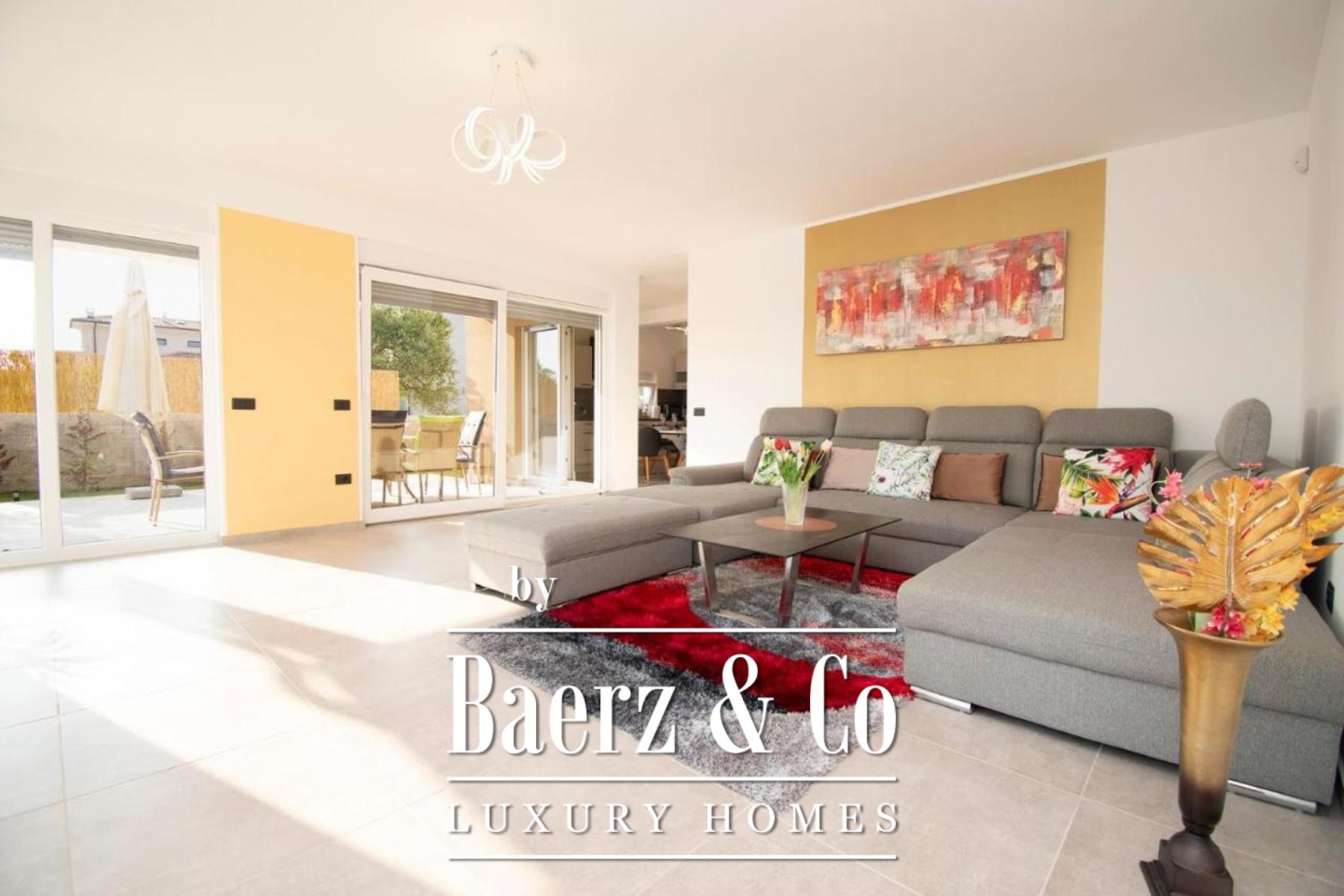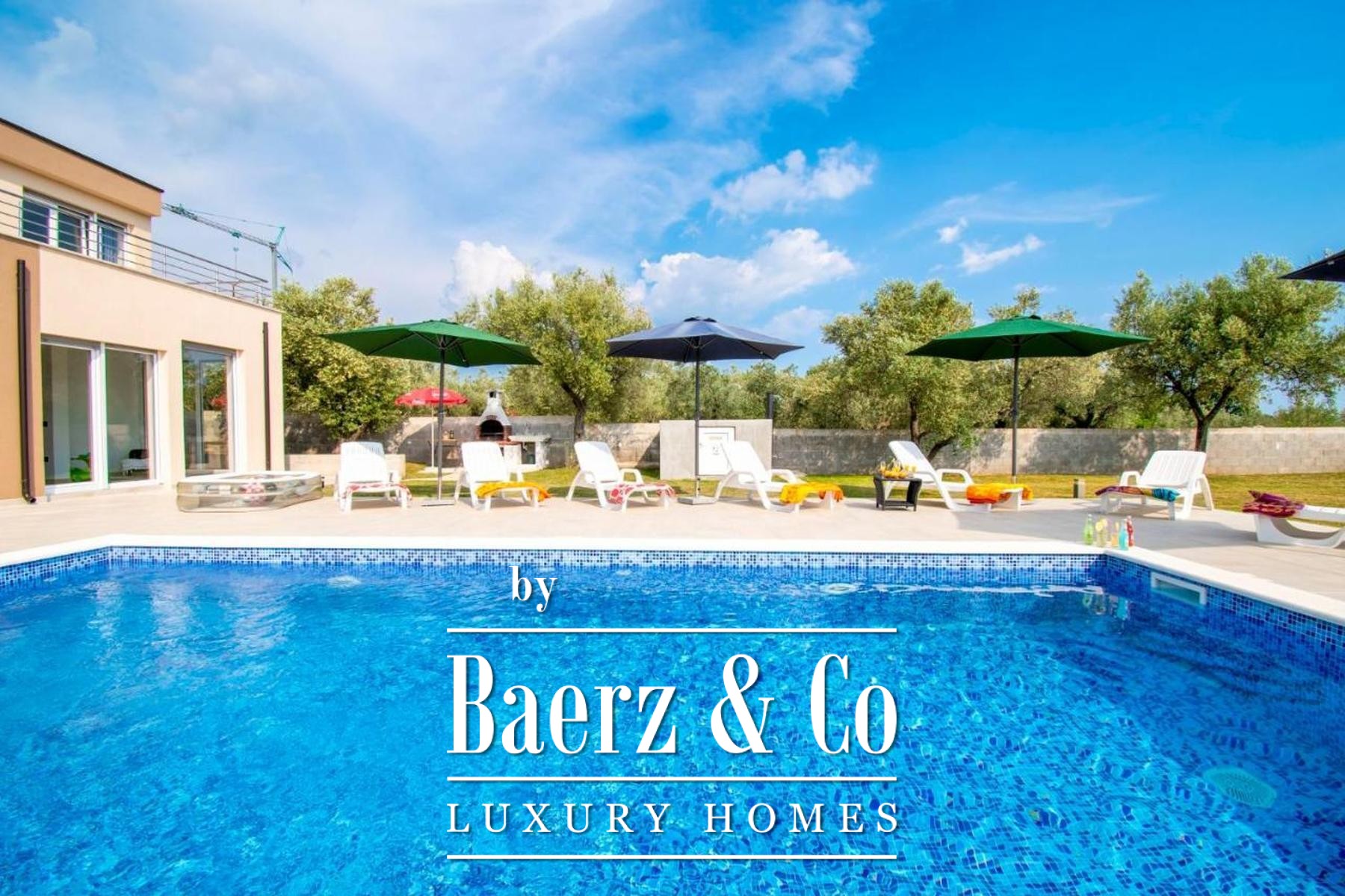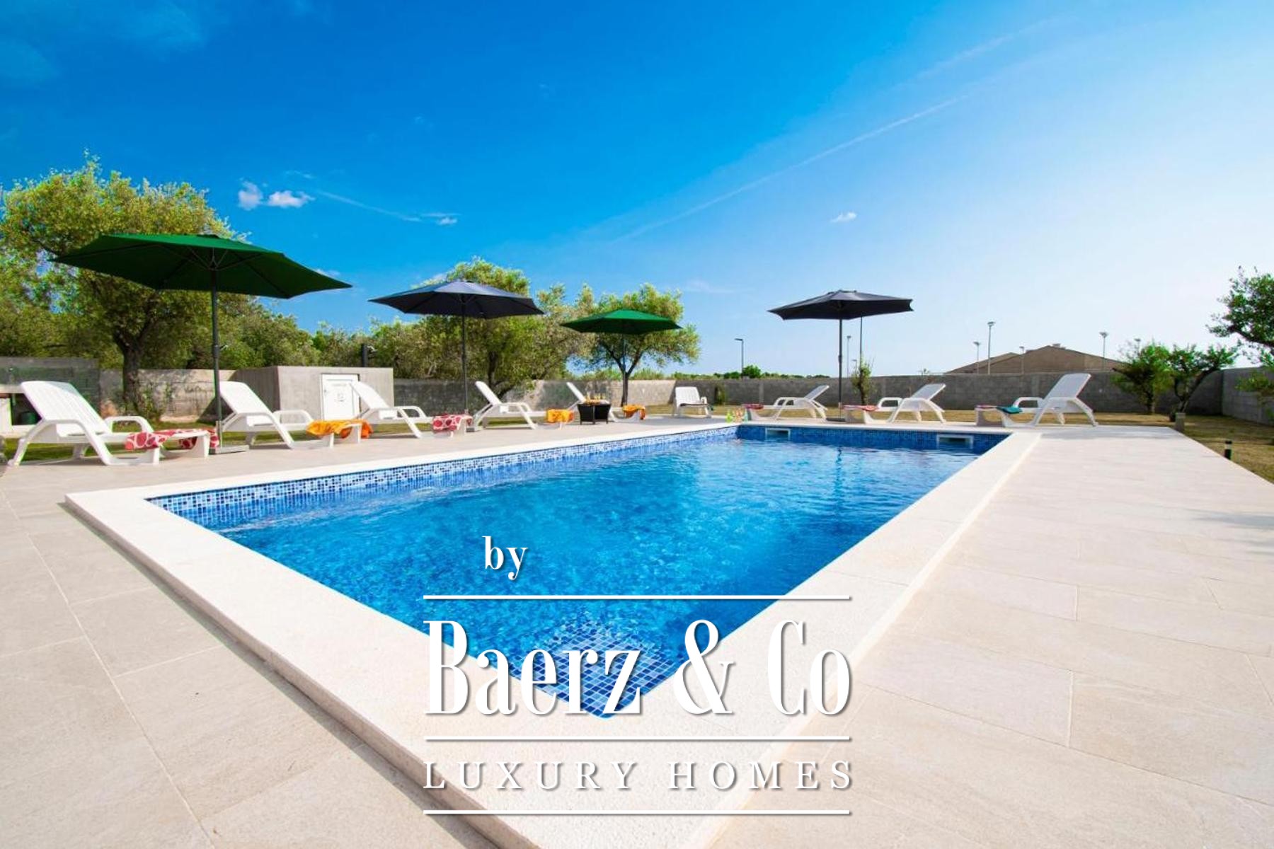 In a peaceful location in Vodnjan, this modern villa of 250 m² with a pool and a beautiful sea view is for sale. On the ground floor of the villa, there is an entrance area, a bathroom, a kitchen with a dining area, a bedroom with its own bathroom, and a living room with a view of the pool and the sea. On the first floor, there are