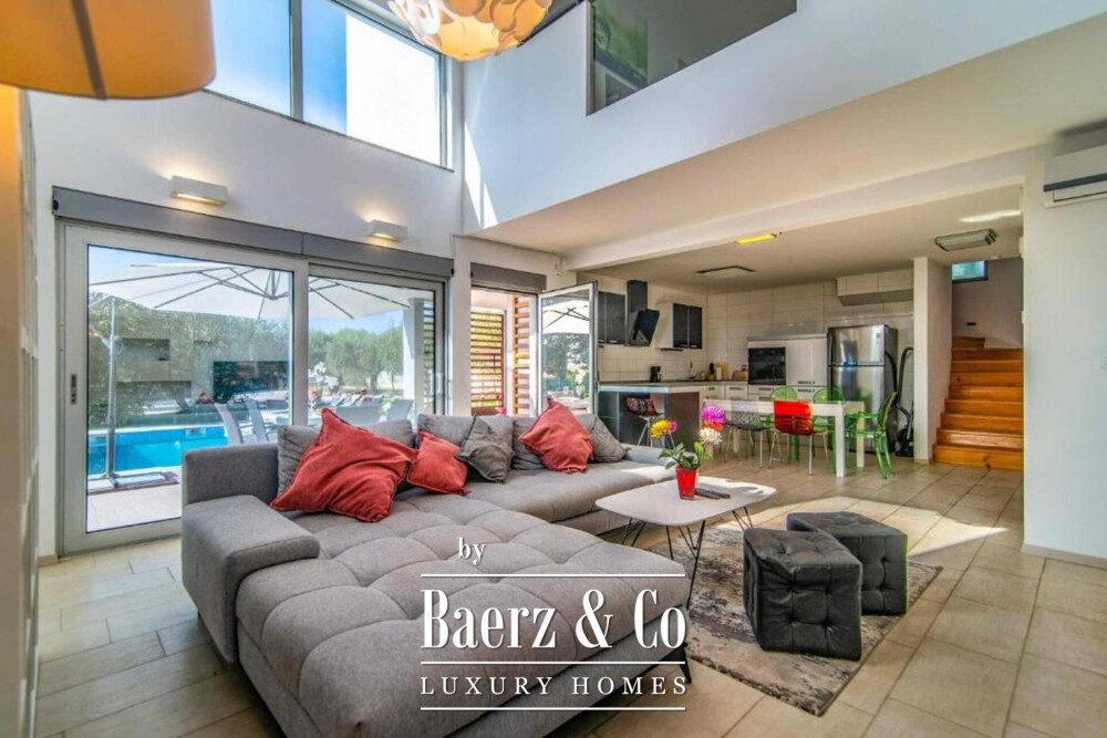 Villa Vodnjan met panoramisch zeezicht is een toonbeeld van modern design en verfijnde privacy, op slechts enkele minuten van het centrum van Vodnjan en alle noodzakelijke voorzieningen. Deze woning biedt 173 m² doordacht ingedeelde leefruimte op een beveiligd en aangelegd perceel van 1.294 m², met volledige privacy en vrij uitzicht over de natuur, de Brijuni-archipel en de zee richting Pula.