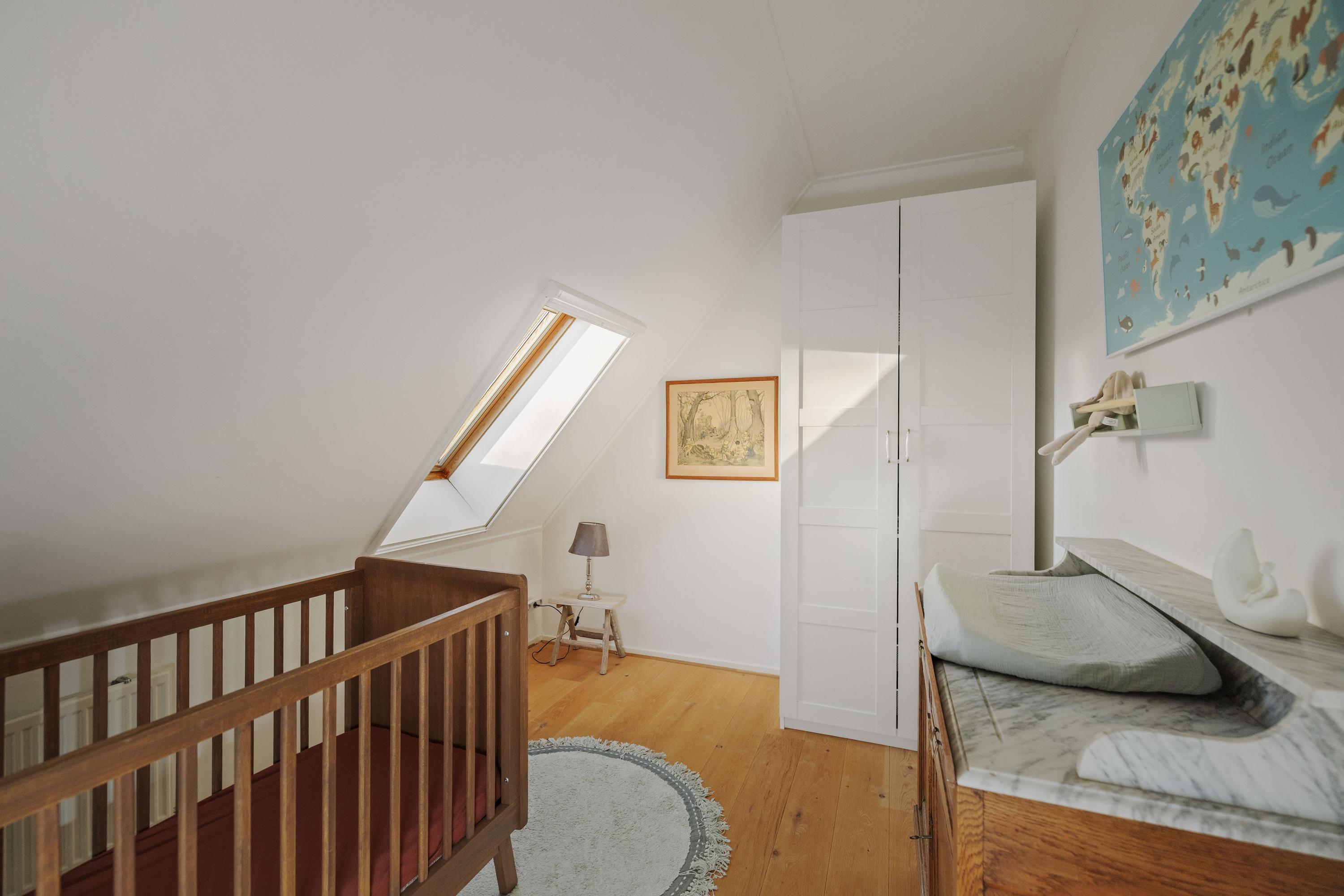 Aan de royale en zonnige overloop, met op de vloer een rood eiken planken vloer, grenzen vijf ruime slaapkamers. De ouderkamer beschikt over een eigen badkamer met inloopdouche, WC en wastafel. In het voorhuis bevindt zich tevens de waskamer/ technische ruimte, met de aansluitingen voor de wasmachine en -droger, de ketel en het buffervat en een boiler van 120 liter, alsmede een praktische berging. Hier is tevens de tweede badkamer, met dubbele wastafels, een ruime inloopdouche en een WC.