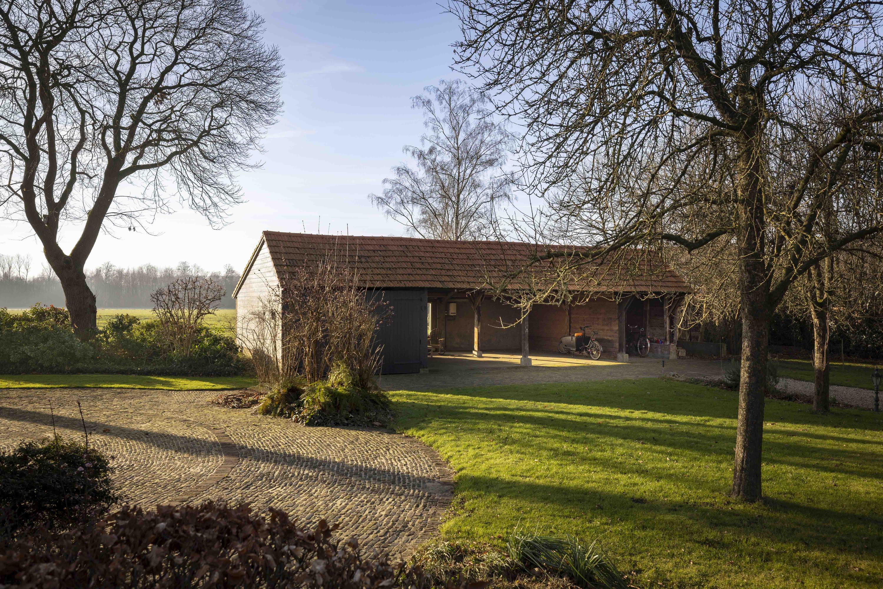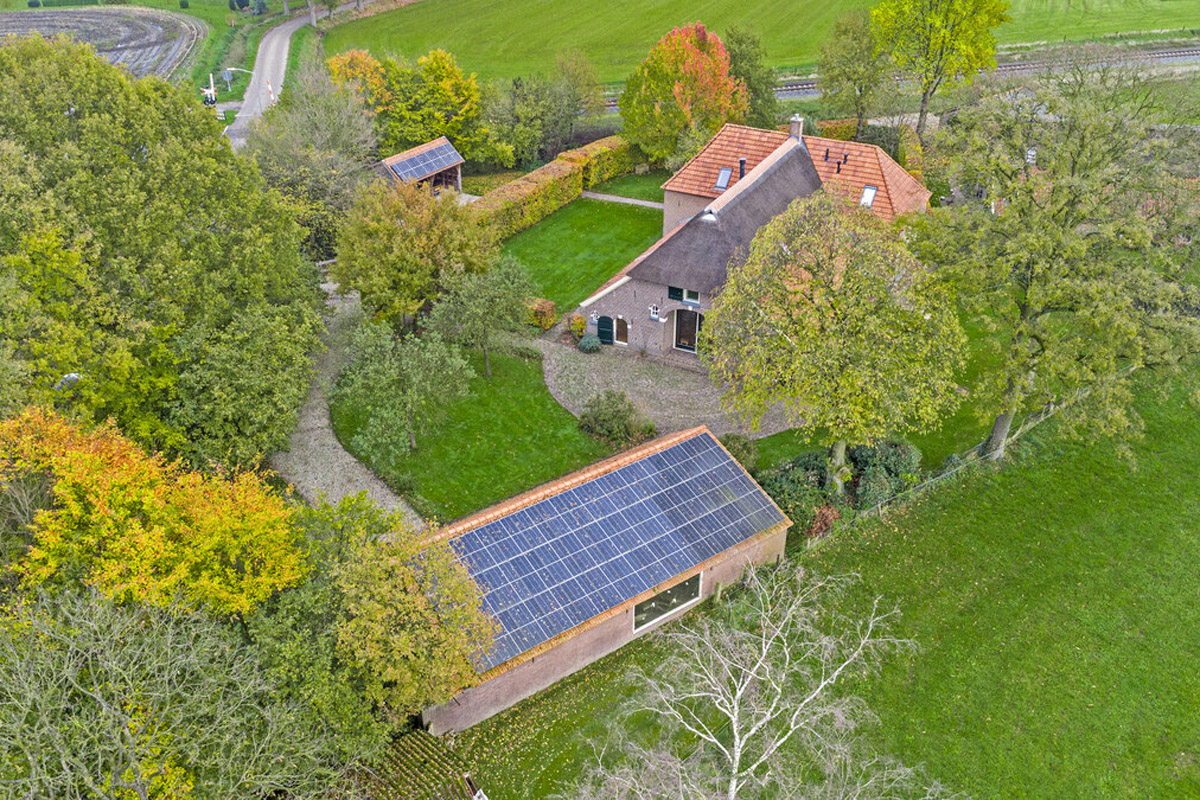 Het huis wordt omringd door een beeldige tuin. Er is een schuur met carport en aan de achterkant een afsluitbare tuingereedschapsberging (met op het dak 39 zonnepanelen - mooi uit het zicht), dus de auto’s staan droog, evenals de tuinspullen. Daarnaast is er een tweede houten bijgebouw (met op het dak 6 zonnepanelen) aanwezig, uitgevoerd in een landelijke stijl met potdekselwerk, Oud-Hollandse dakpannen en robuuste gebinten. Het bijgebouw biedt ruimte aan het parkeren van twee auto’s. Door de oriëntatie van het huis ligt er achter de woning een fijn zonneterras. Zowel aan de voor- als achterzijde zijn er grote gazons en de privacy wordt gewaarborgd door de manshoge beukenhagen.