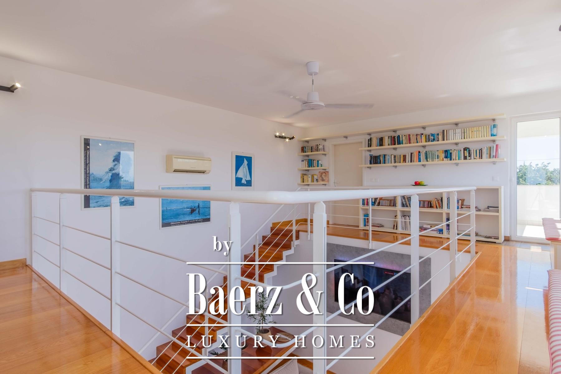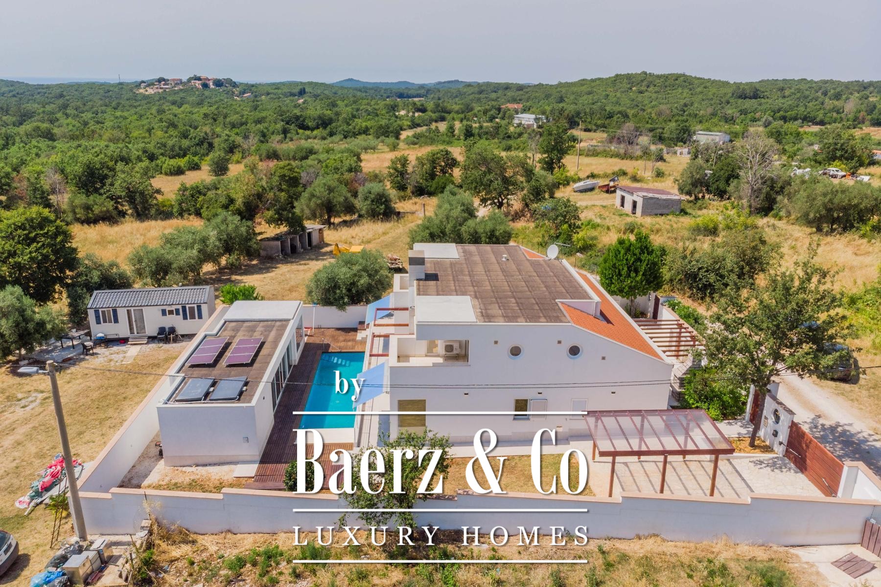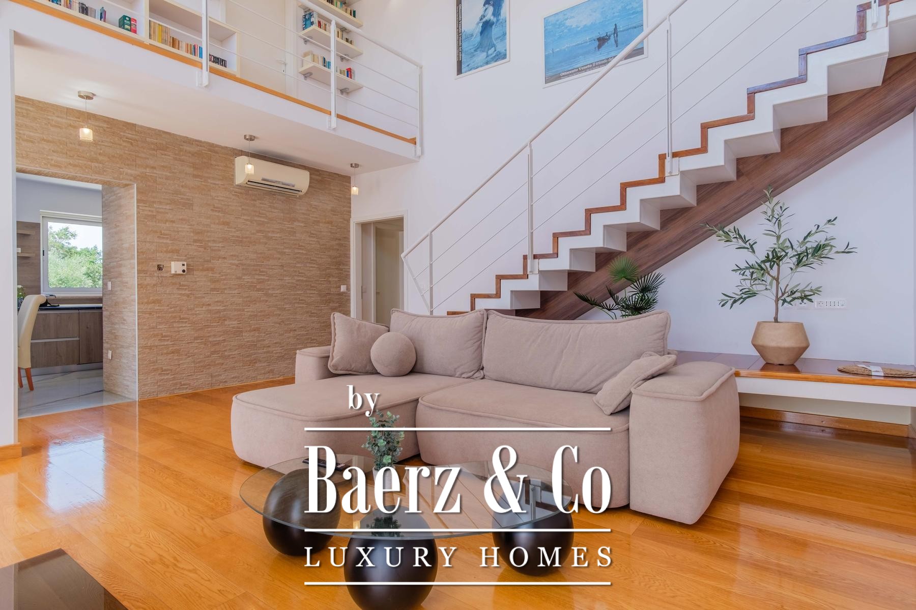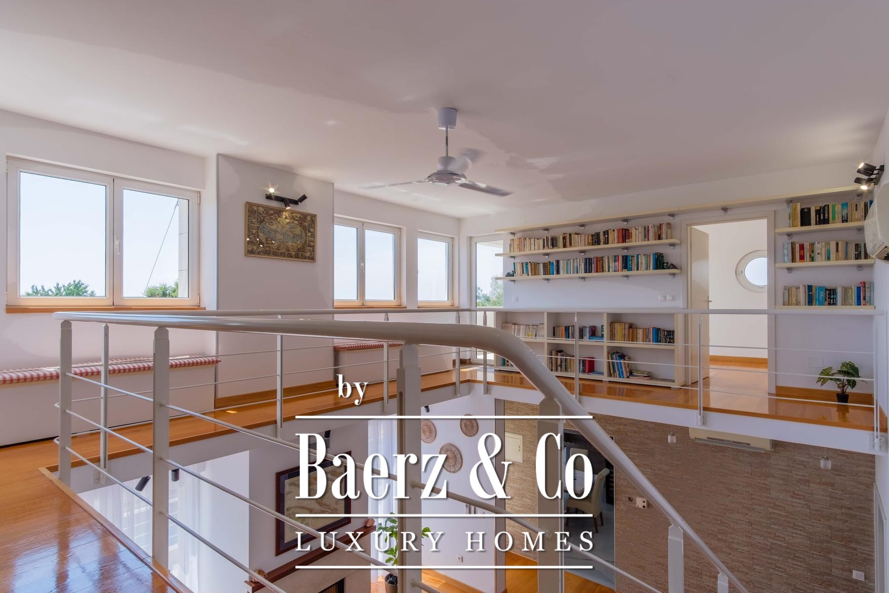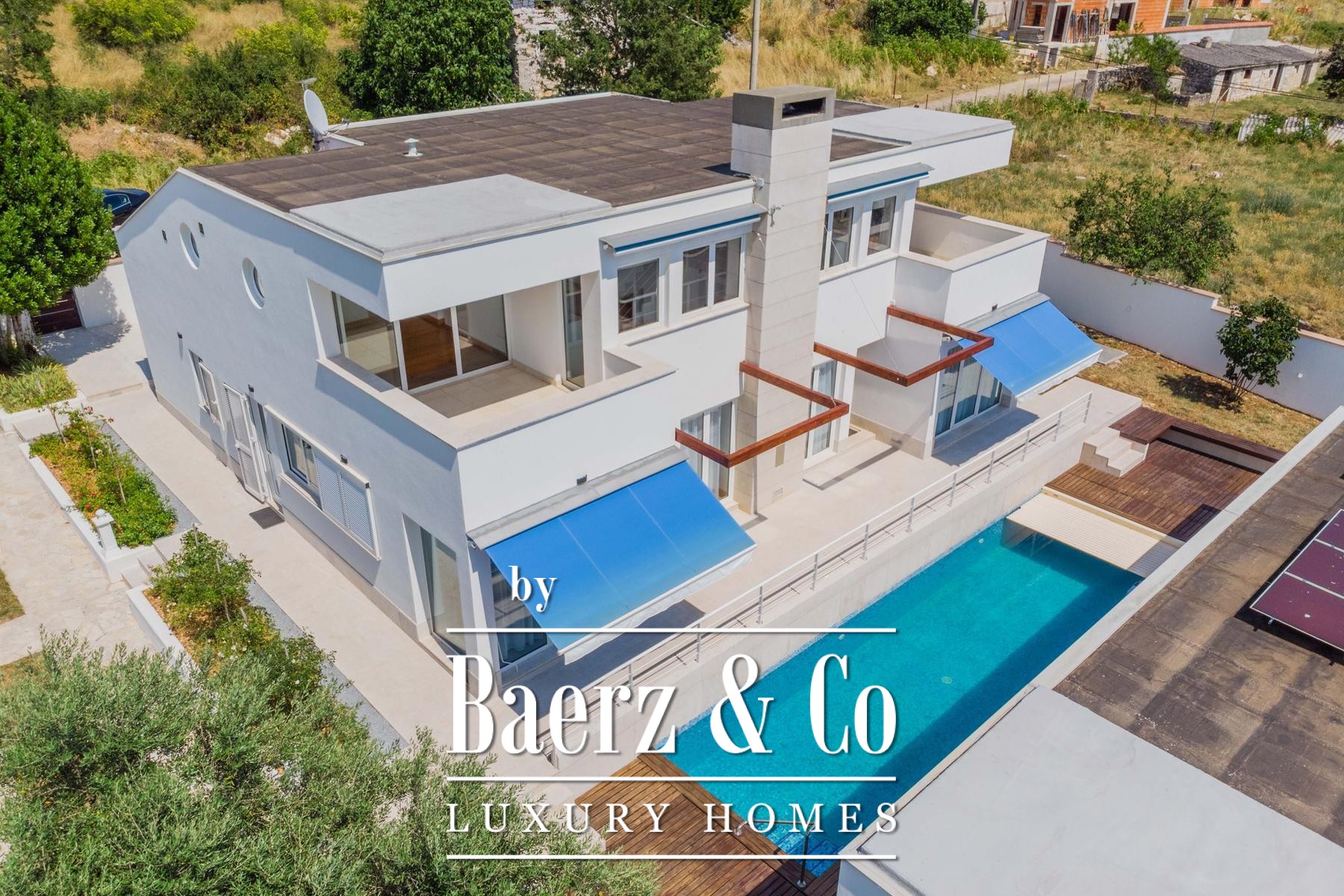 The villa has a modern design and luxurious interior, equipped with high-quality materials and in 344 m2 offers an ideal layout of spacious rooms as well as a sea view.It extends over two floors, so the ground floor has a spacious living room decorated with a fireplace by the famous Piazzetta company, a separate kitchen with a dining room and a pantry, then two bedrooms, each with its own toilet, while in between there is a shared shower cabin.A high-quality staircase leads us to an open gallery with a hallway that extends through all the wall surfaces, thus leaving a feeling of luxury where it stands out from the rest. On this floor there are two rooms with the potential to be converted into two separate apartments, given that they contain kitchen installations and gas installations, while currently they serve as rooms with a bathroom, pantry and terrace.An interesting part of the property is an additional apartment located in the extension of the villa and with its separate entrance offers a living room with a kitchen and dining room, a hallway that connects two bedrooms, a bathroom and its own pantry.The view of the heated 40 m2 pool is offered from all rooms as well as from the inevitable 56 m2 spa zone where there is a sauna, jacuzzi, hydromassage