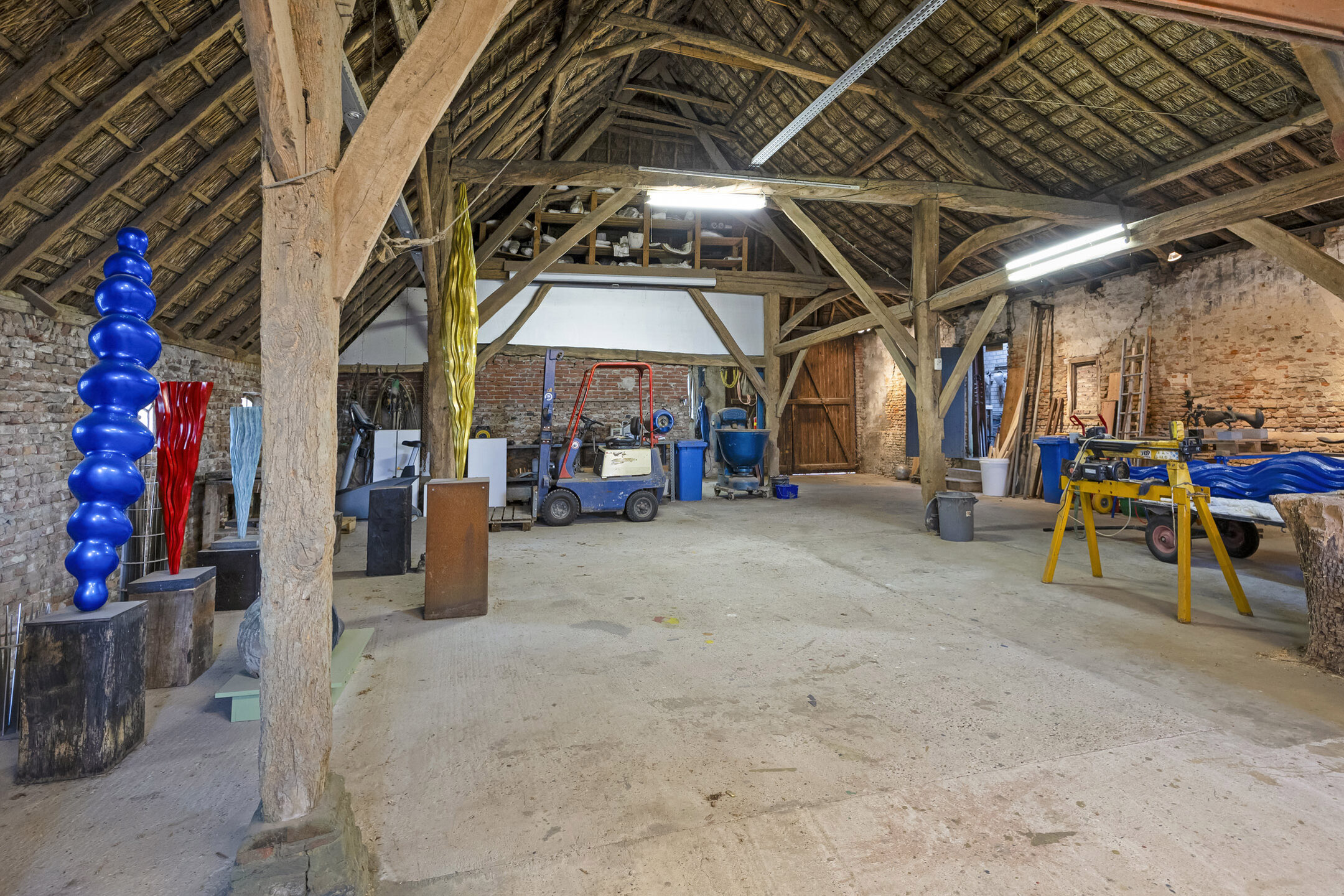 inpandig atelier als gesitueerd aan de voorzijde van de woonboerderij (ca. 87 m²), multifunctioneel in te richten / te gebruiken voor meerdere doeleinden, voorzien een keukenblok, een 2e trap naar de 1e verdieping, tuindeuren naar tuin/terras, loopdeur naar oprit, wandafwerking stucwerk, betonvloer en deels bestrating, balkenplafond.