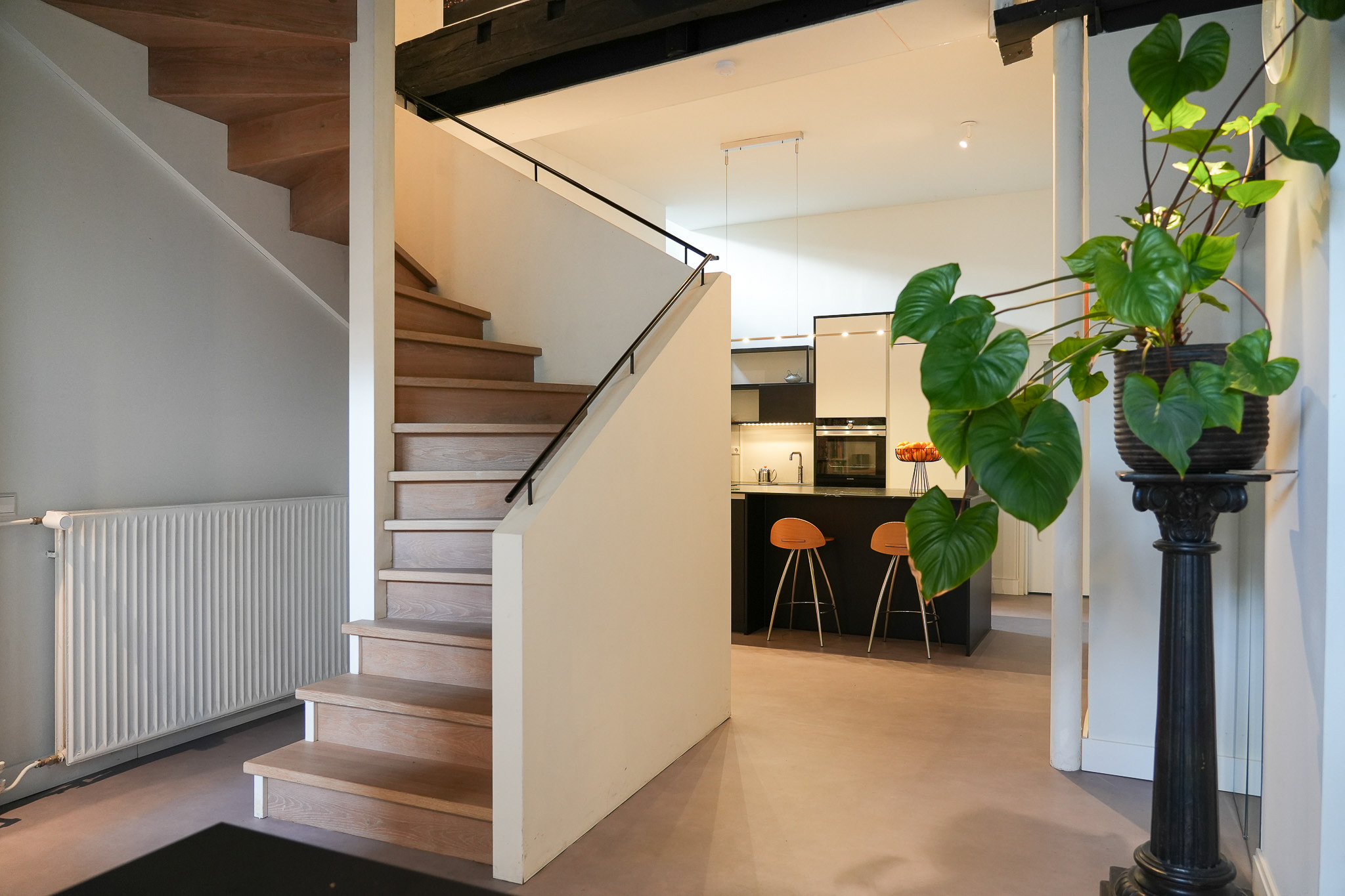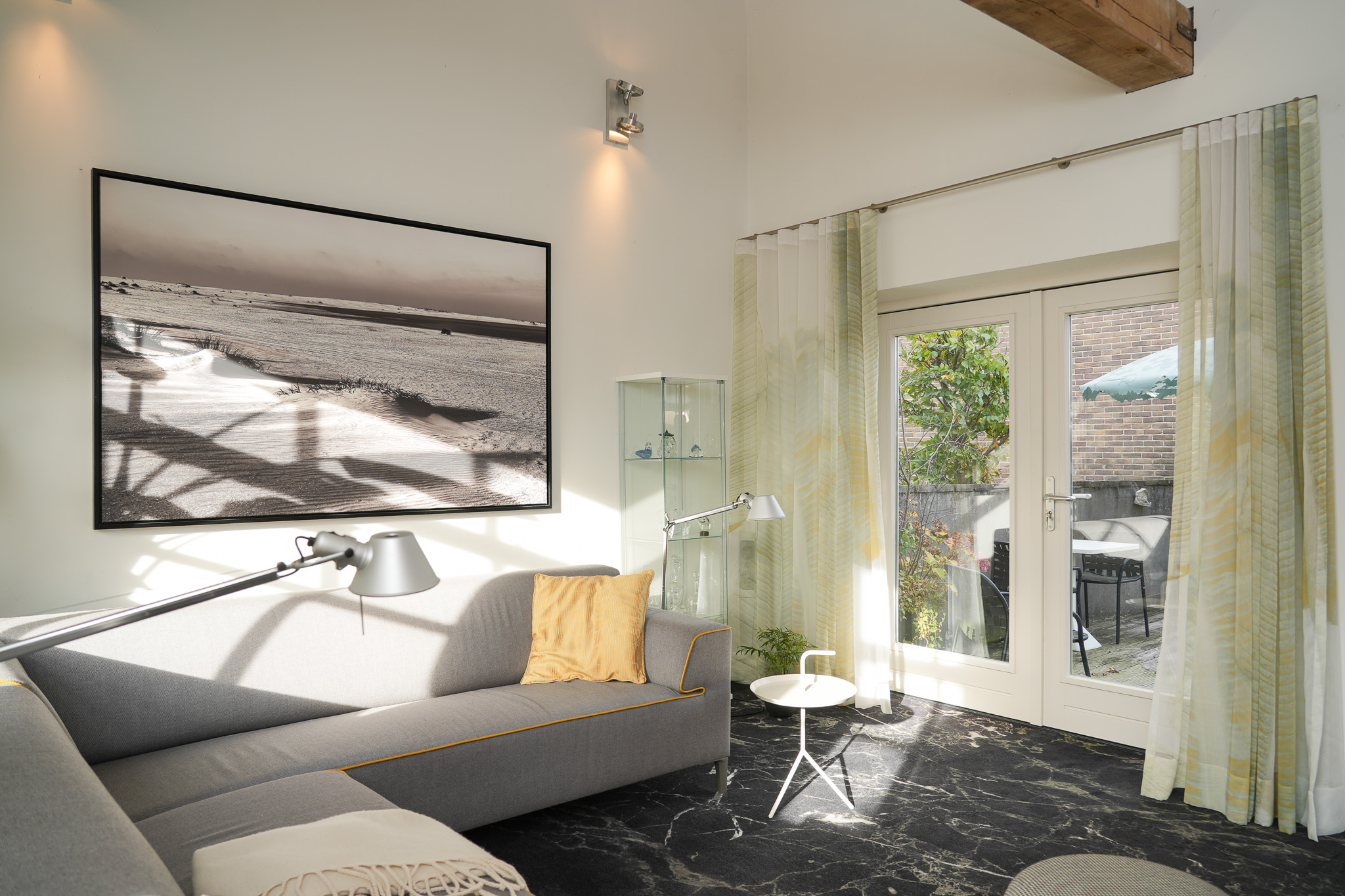 In de fotoreportage is ook te zien hoe de ruimte kan worden ingericht als grote leefruimte/woonkamer met open keuken. Bij zakelijk gebruik dan wel dubbele bewoning is de tweede entree ideaal.