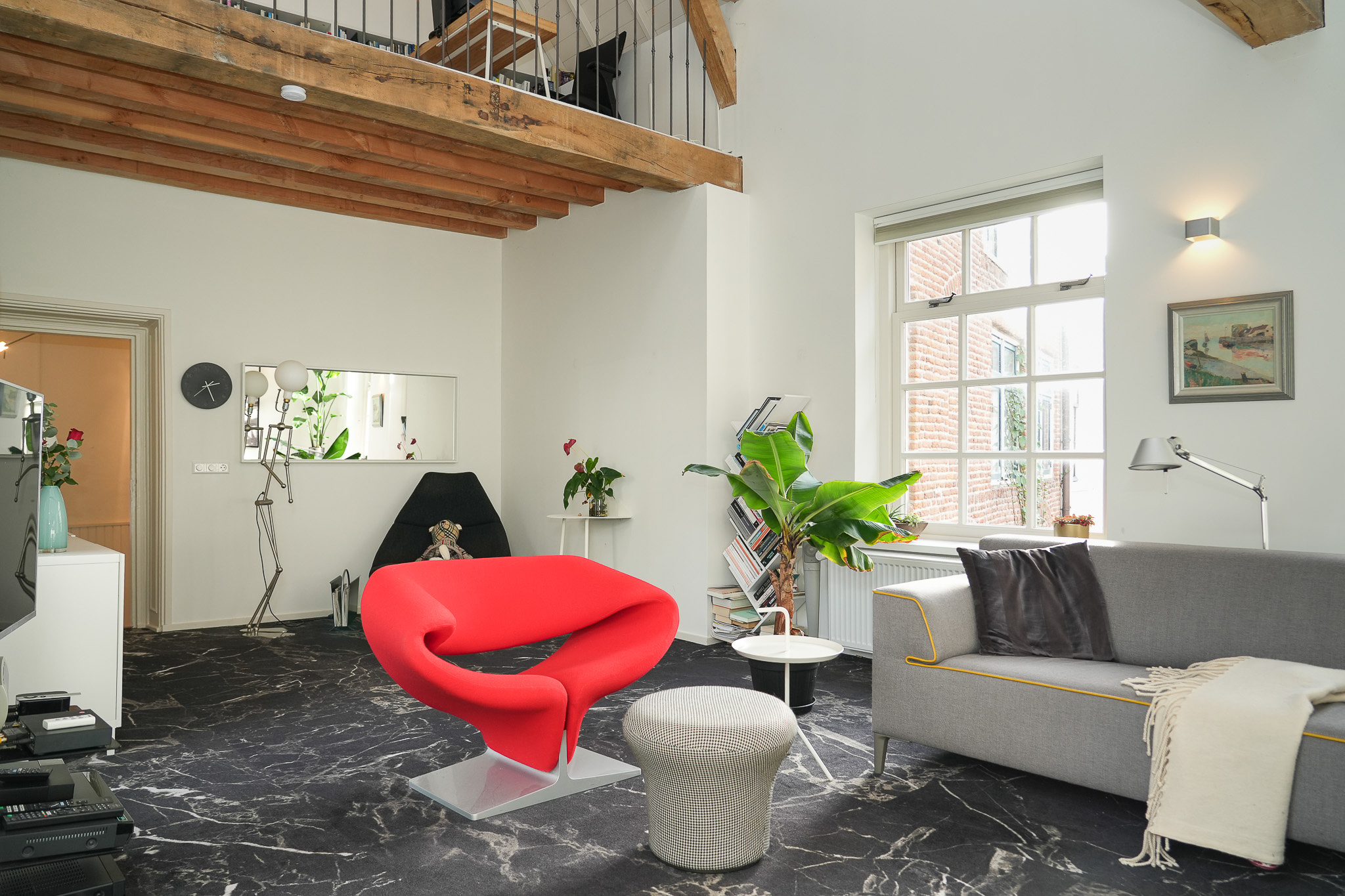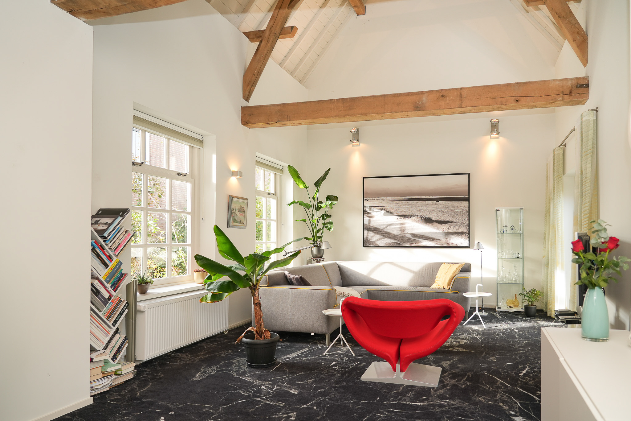 Via een entree met oude estrikenvloer is de woonkamer bereikbaar. Deze woonkamer is zeer eenvoudig bij de studio te betrekken, waardoor er een multifunctionele ruimte van circa 86 m² ontstaat. Deze studio leent zich door de uitstekende akoestiek voor meerdere doeleinden, zoals bijvoorbeeld een yoga- of pilatesstudio, trainingsruimte, atelier of galerie.