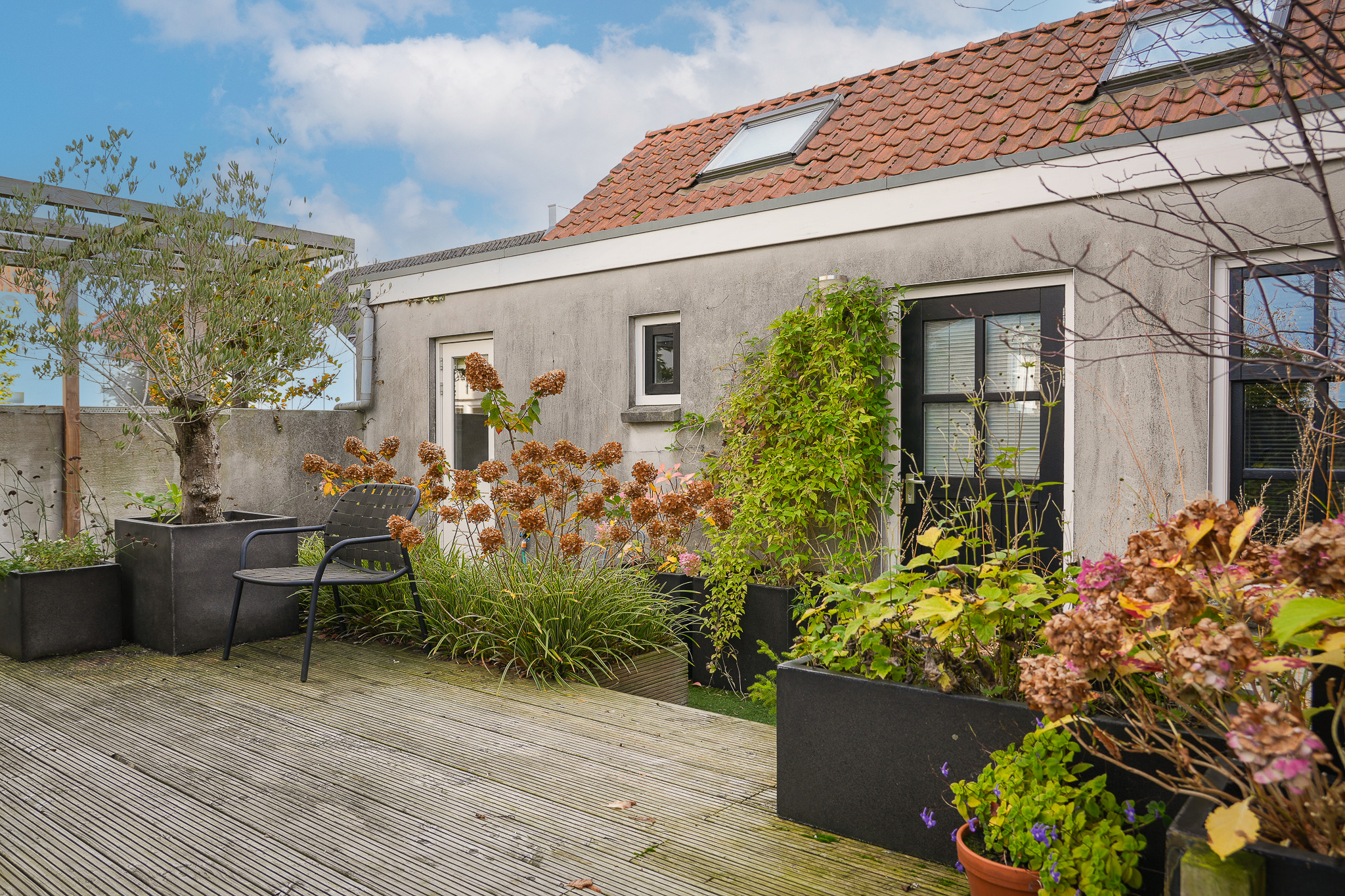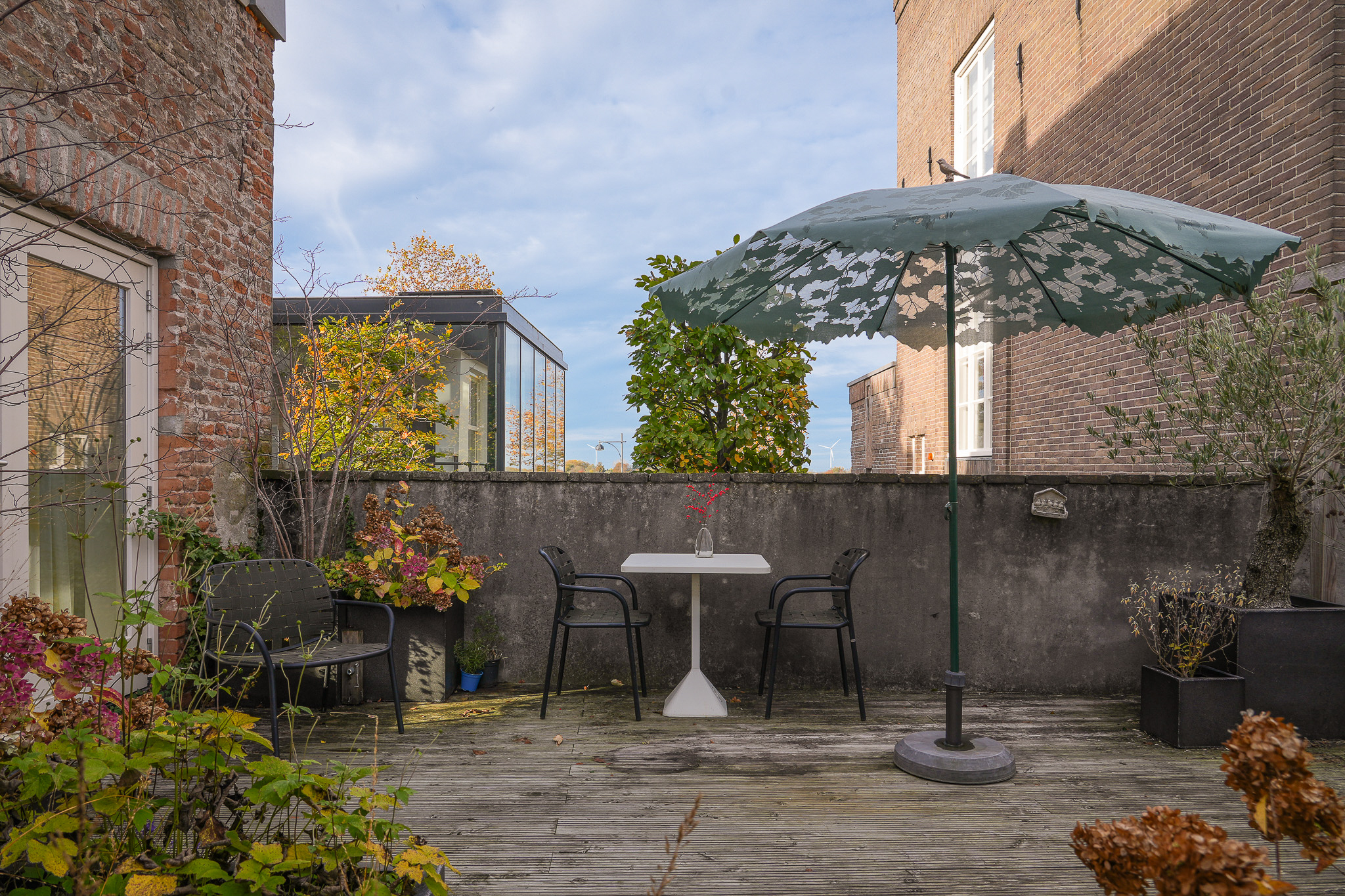 Het zonnige en privé gelegen dakterras (45 m²) is onder supervisie van een tuinarchitect aangelegd. Er is een fijne sfeer gecreëerd, compleet met olijfbomen, een pergola en sfeervolle beplanting. Door de beschutte ligging is er het hele jaar door wel een plekje te vinden om van de zon te genieten of om in de ochtend met een cappuccino naar de rivier te turen.