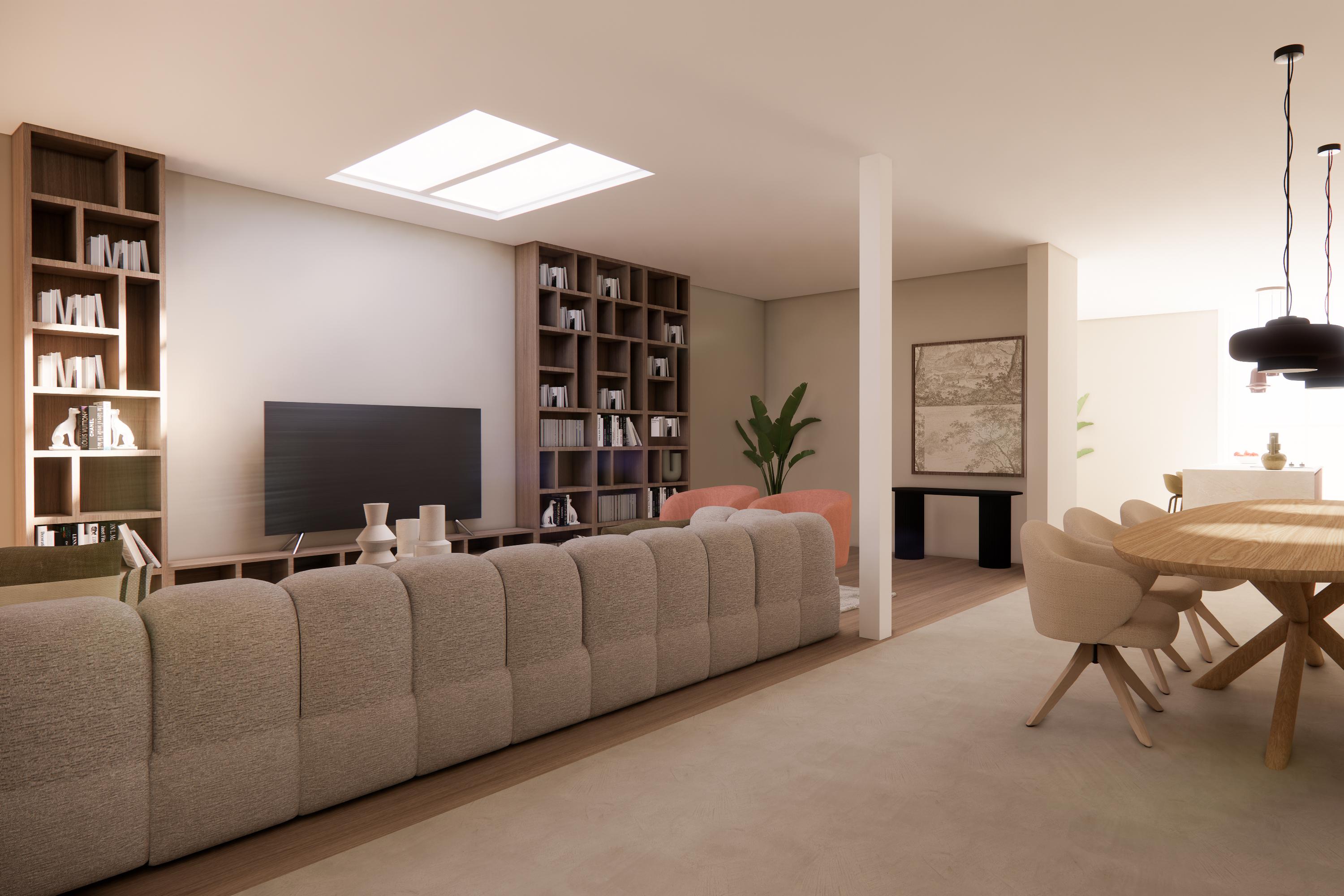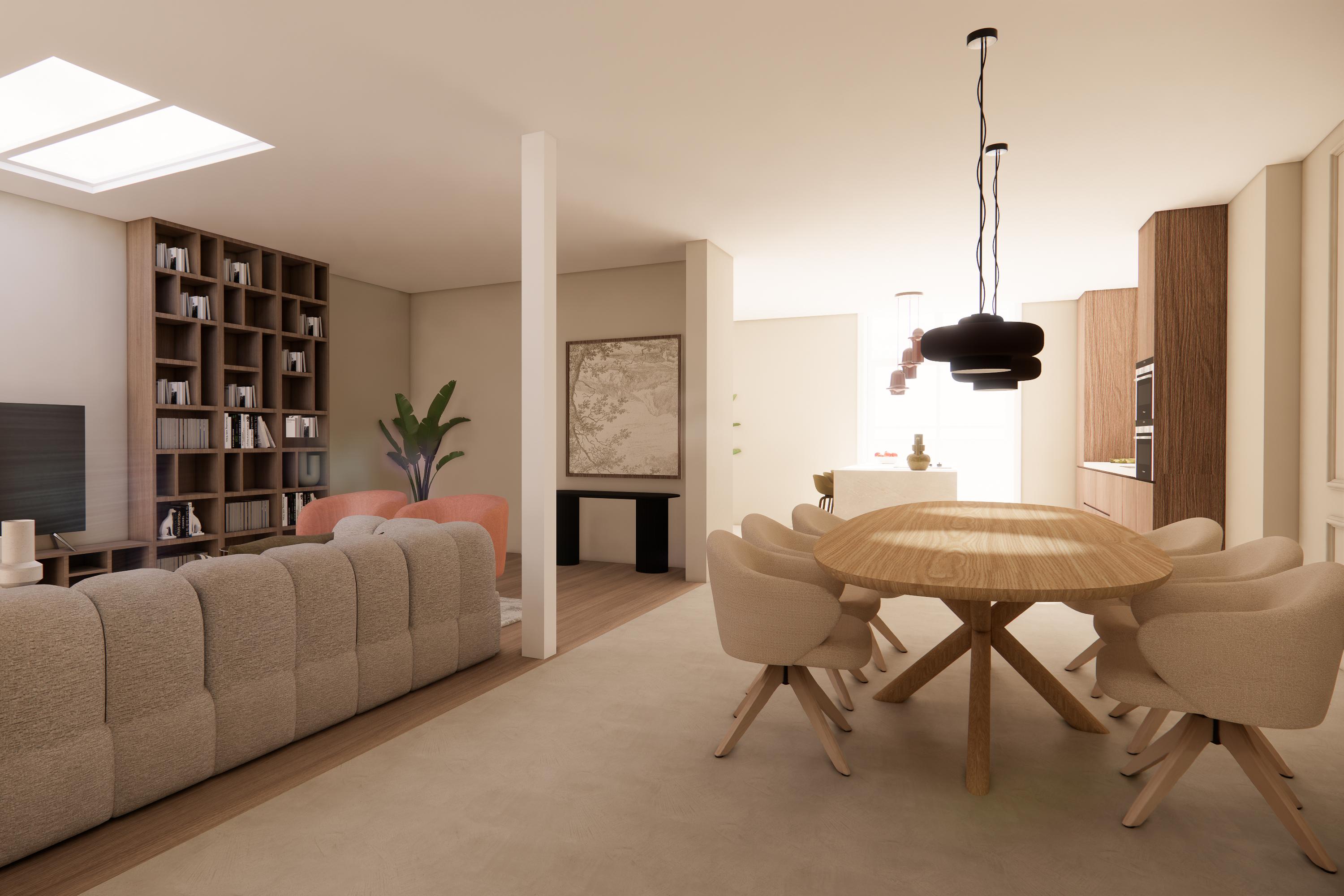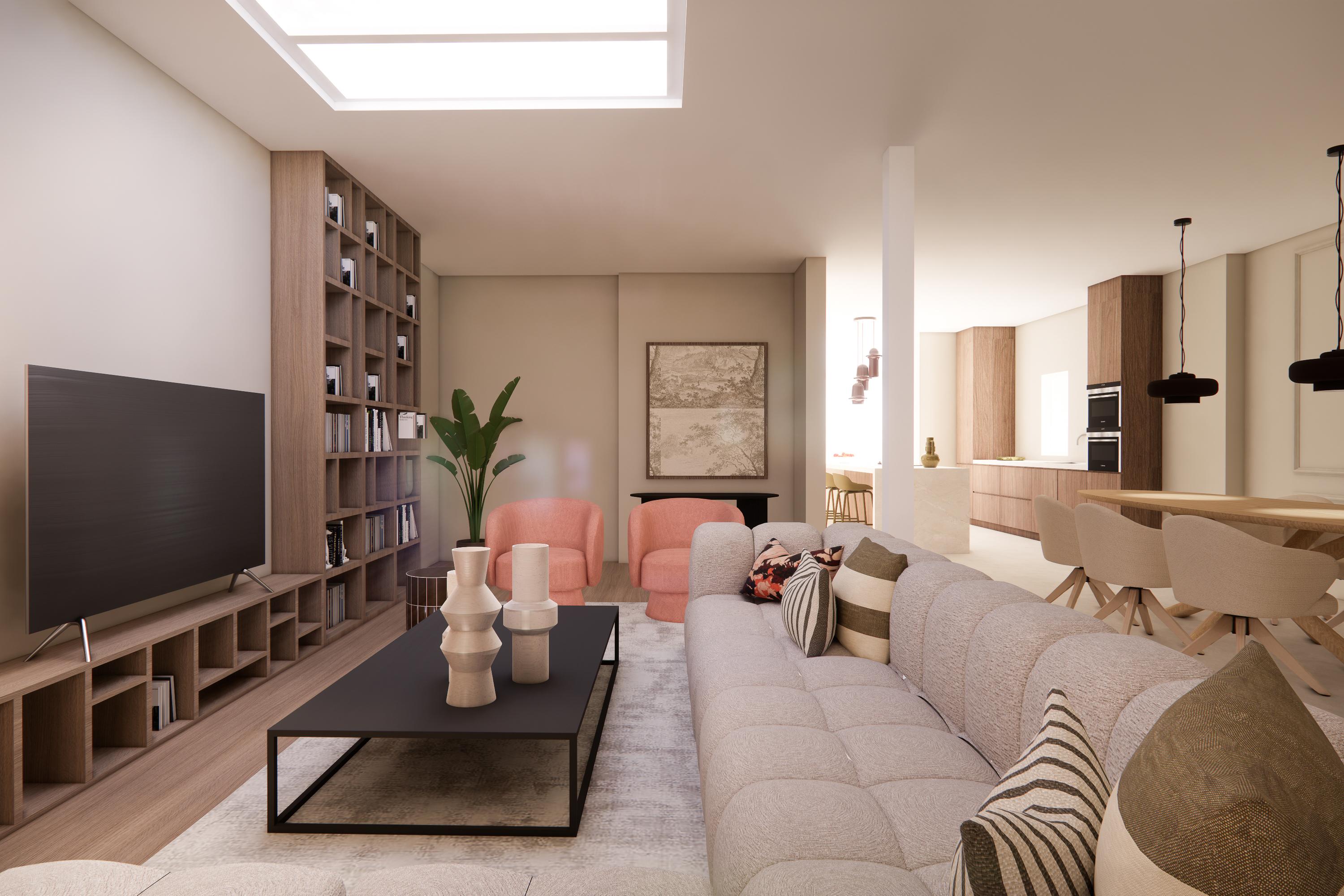 Zonnige woonkamer met vide en aangrenzend dakterras, slaapkamer en een luxe badkamer op de eerste verdieping.
