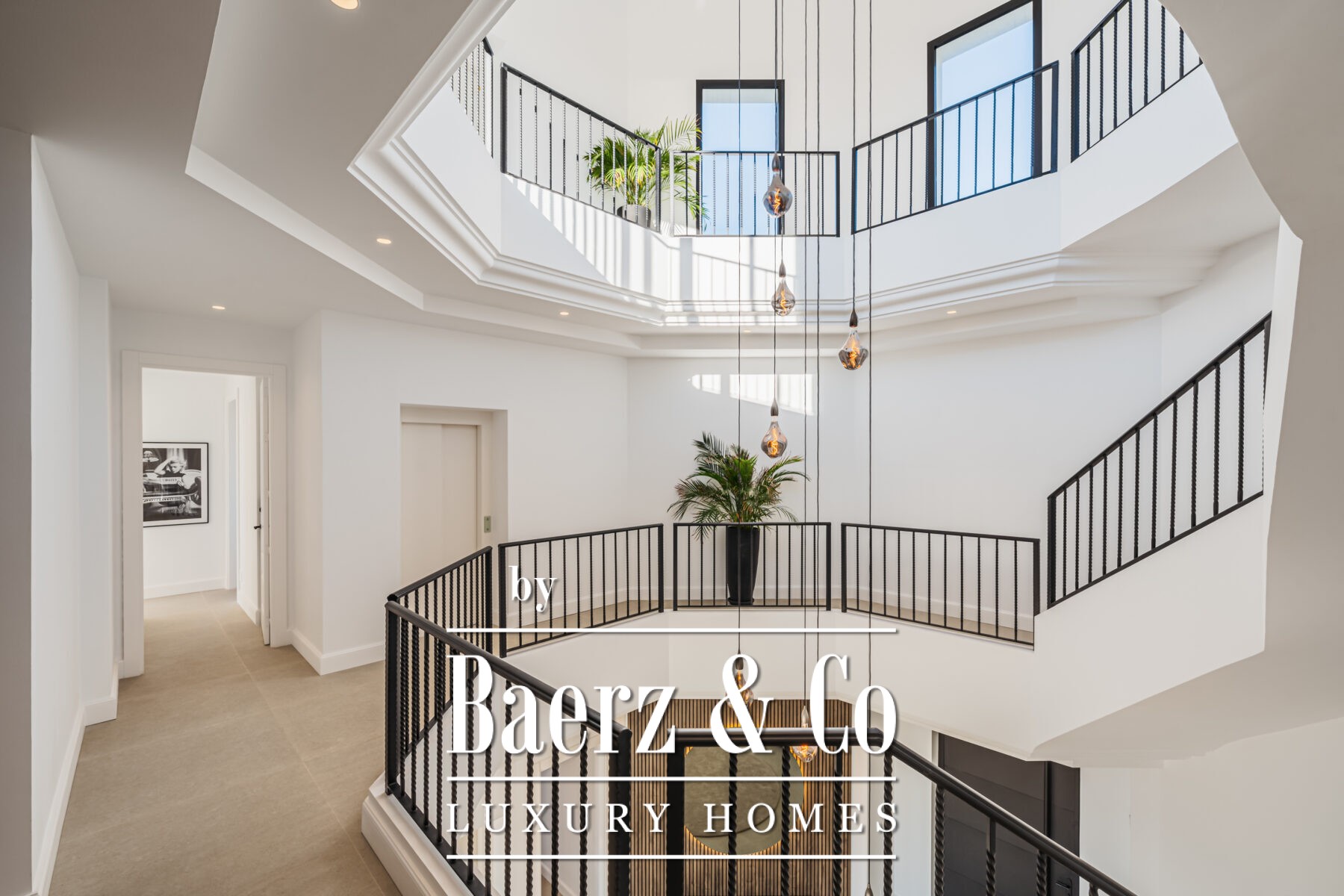Резиденция организована на четырёх уровнях, включает шесть спален, семь ванных комнат и безупречный доступ к изысканным пространствам, все они соединены личным лифтом. При входе — изящная винтовая лестница и подвесная люстра, формирующие спокойную атмосферу роскоши, дополненную естественным освещением и открывающимся видом на море. На первом этаже расположены просторная гостиная открытой планировки, формальная столовая, современная кухня и кладовая, отдельный кабинет, гостевая спальня с ванной комнатой и гибкое многофункциональное помещение. Раздвижные двери ведут на залитую солнцем террасу с летней кухней, инфинити-бассейном и зонами для уединённого отдыха и беспрепятственного приёма гостей.