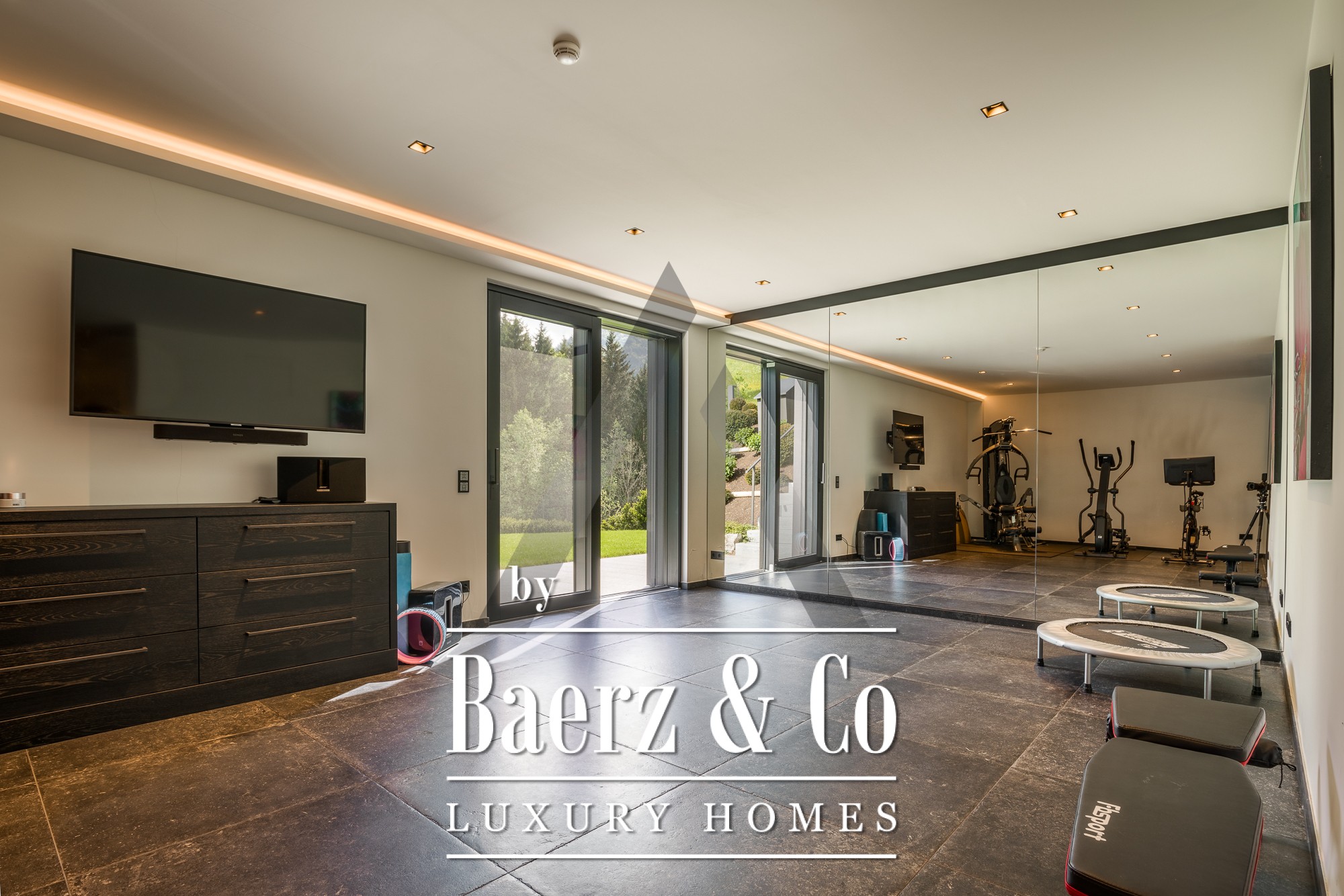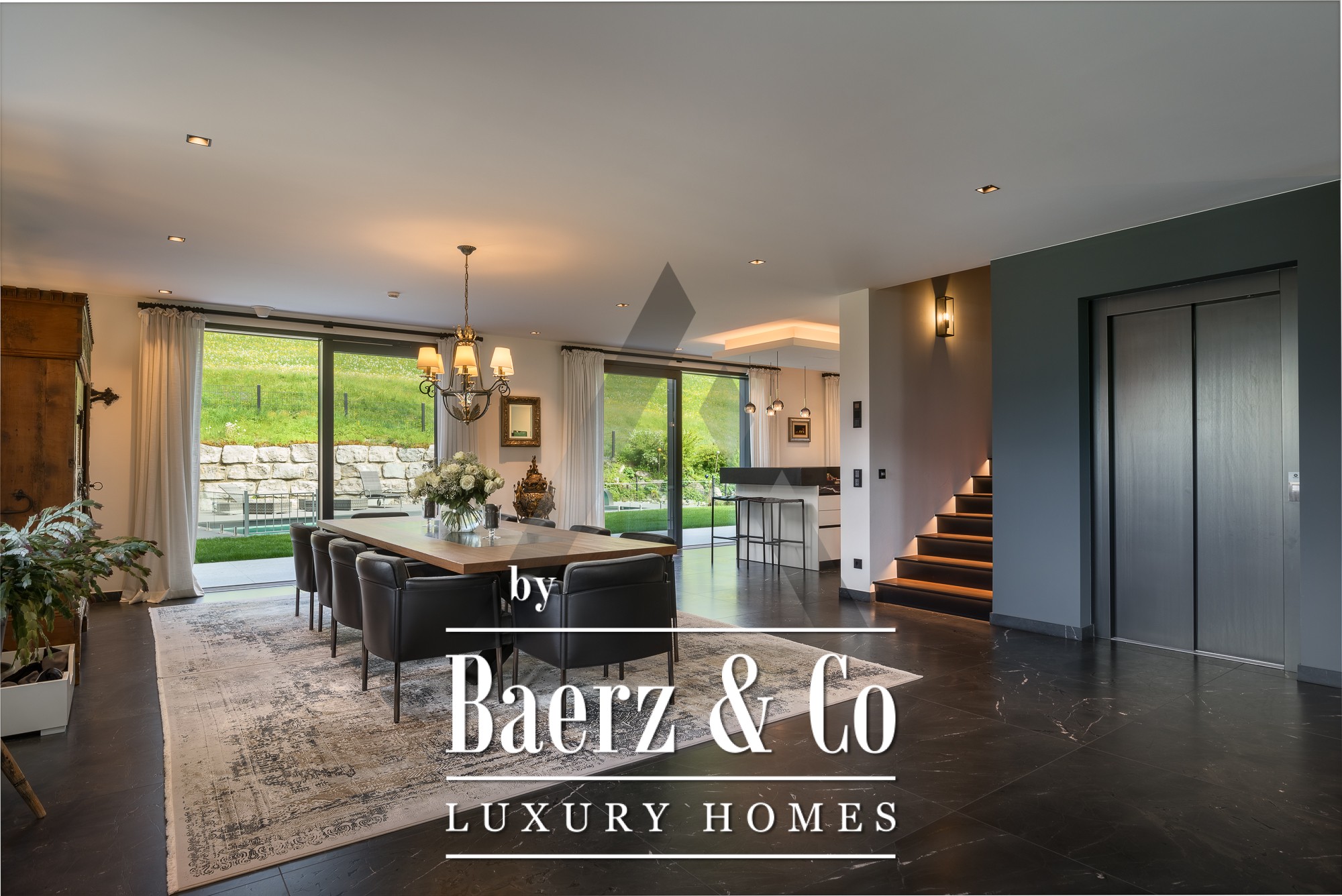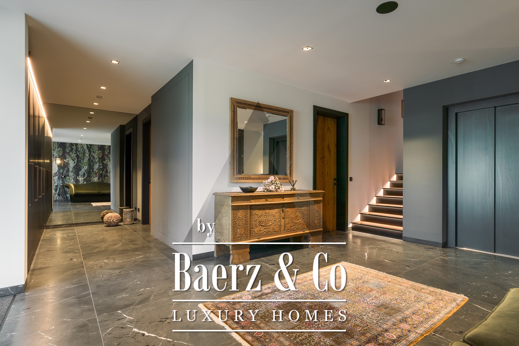 This spectacular property is accessed on the ground floor via a gorgeous entrance area with a coatroom. This level has a separate apartment with living/dining area, kitchen, as well as two bedrooms with dressing rooms, en-suite bathrooms and direct access to the sunny patio and garden. The secluded wellness and fitness area with sauna and steam bath offers hours of blissful relaxation.