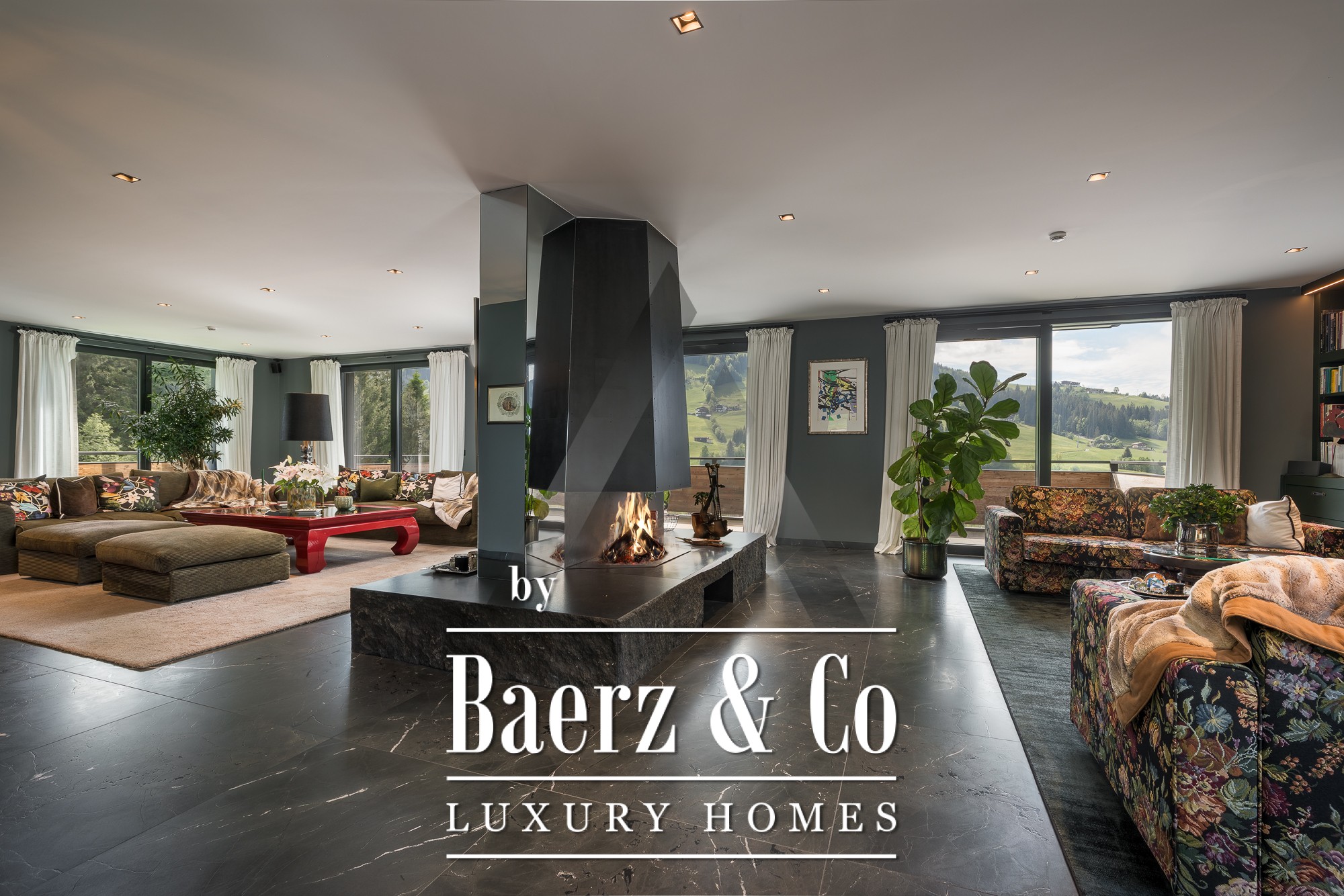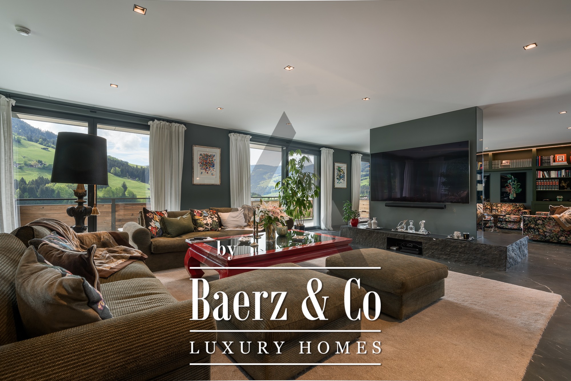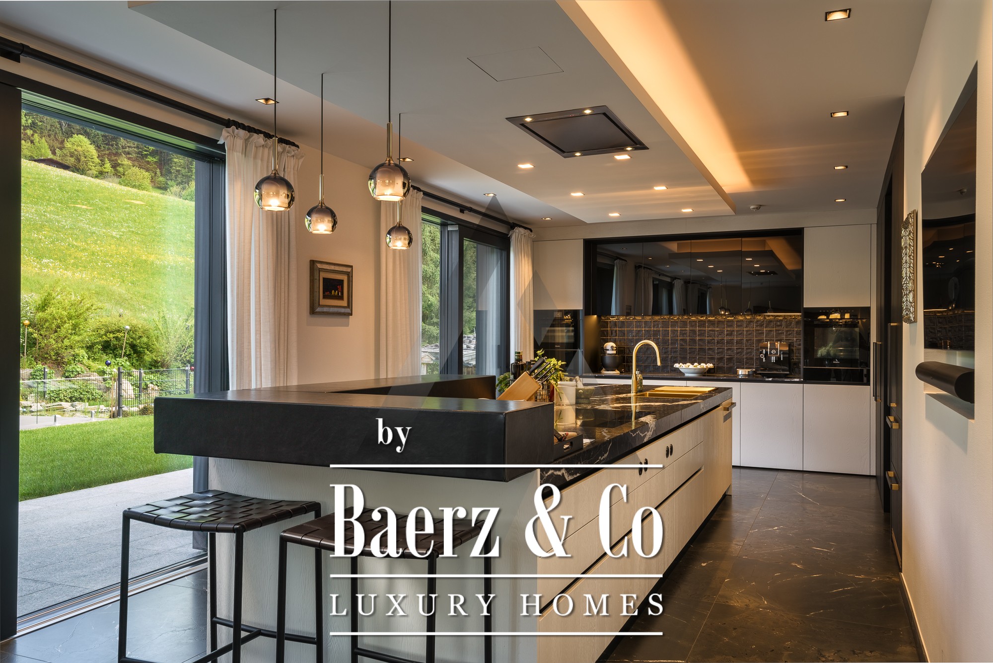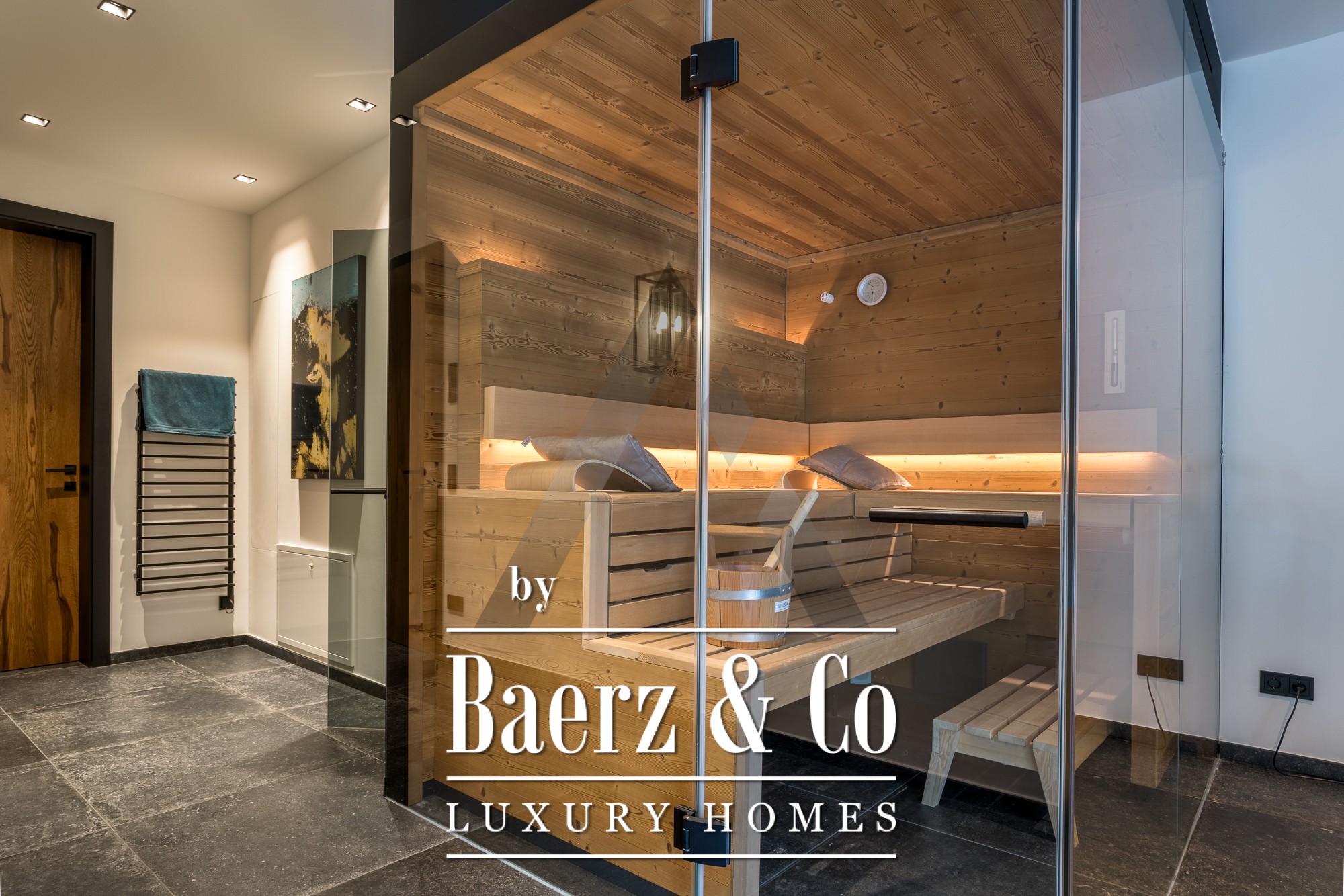This spectacular property is accessed on the ground floor via a gorgeous entrance area with a coatroom. This level has a separate apartment with living/dining area, kitchen, as well as two bedrooms with dressing rooms, en-suite bathrooms and direct access to the sunny patio and garden. The secluded wellness and fitness area with sauna and steam bath offers hours of blissful relaxation.