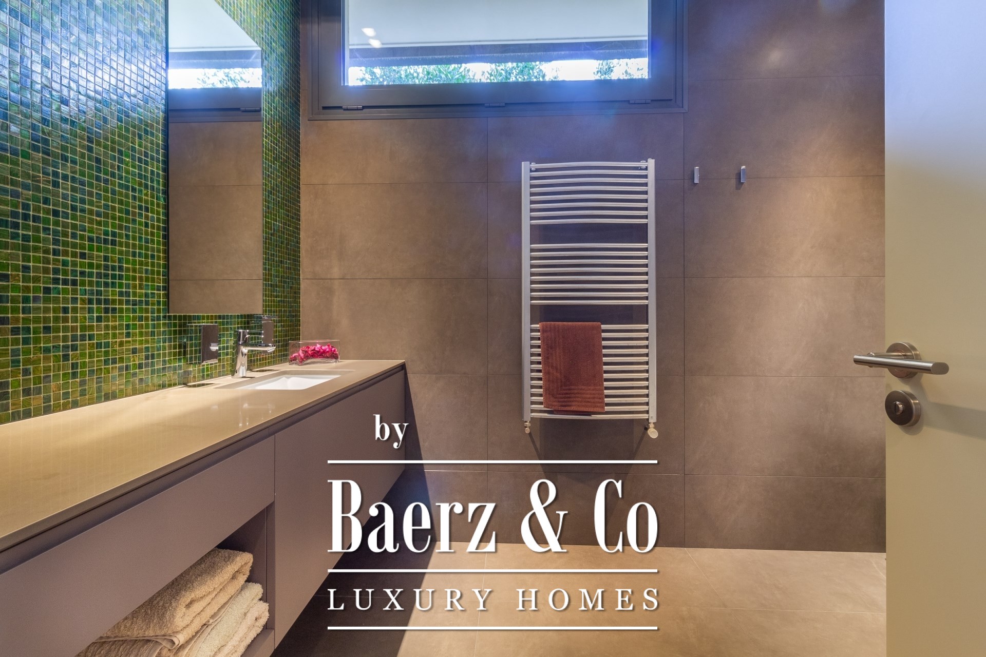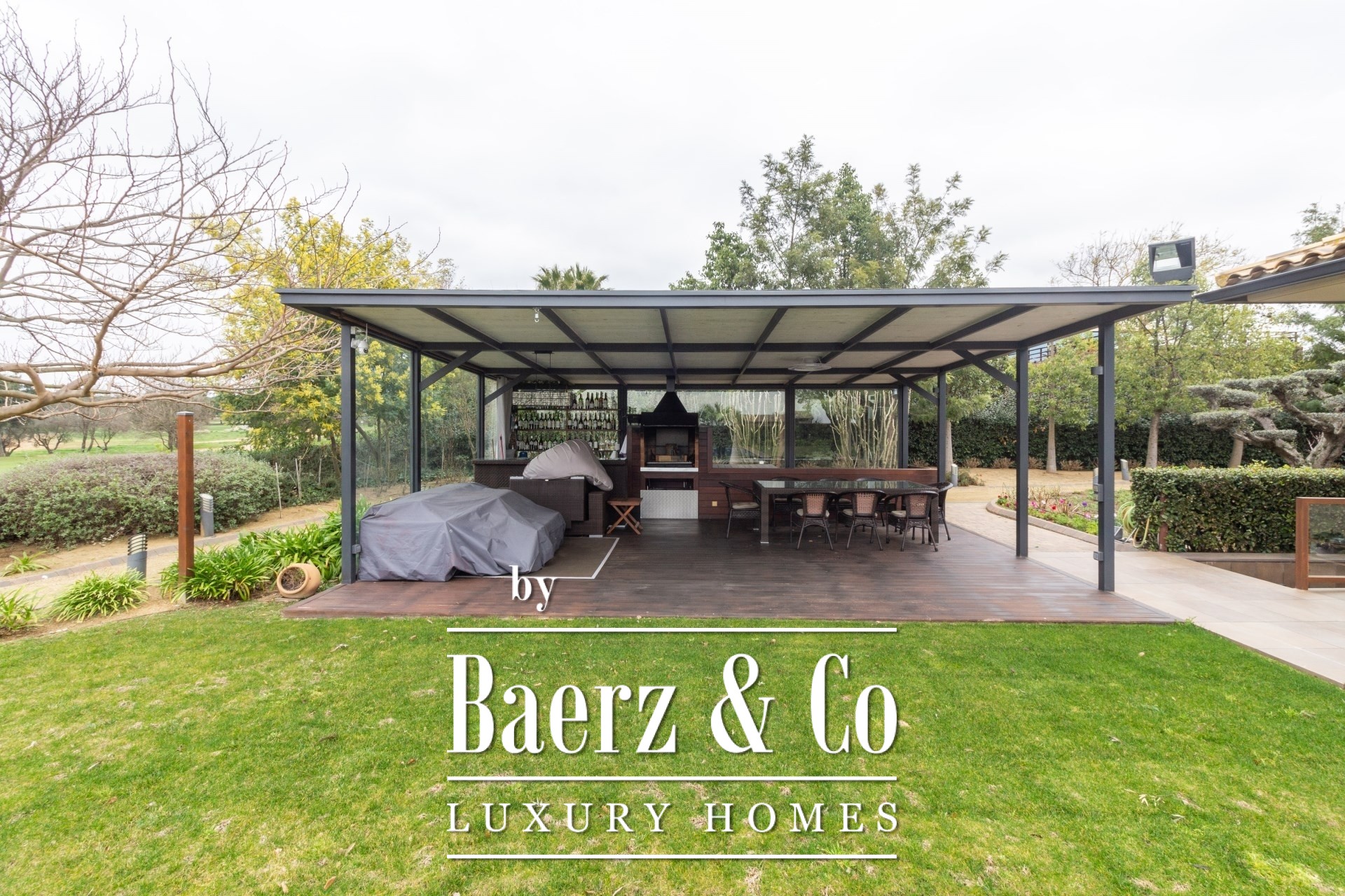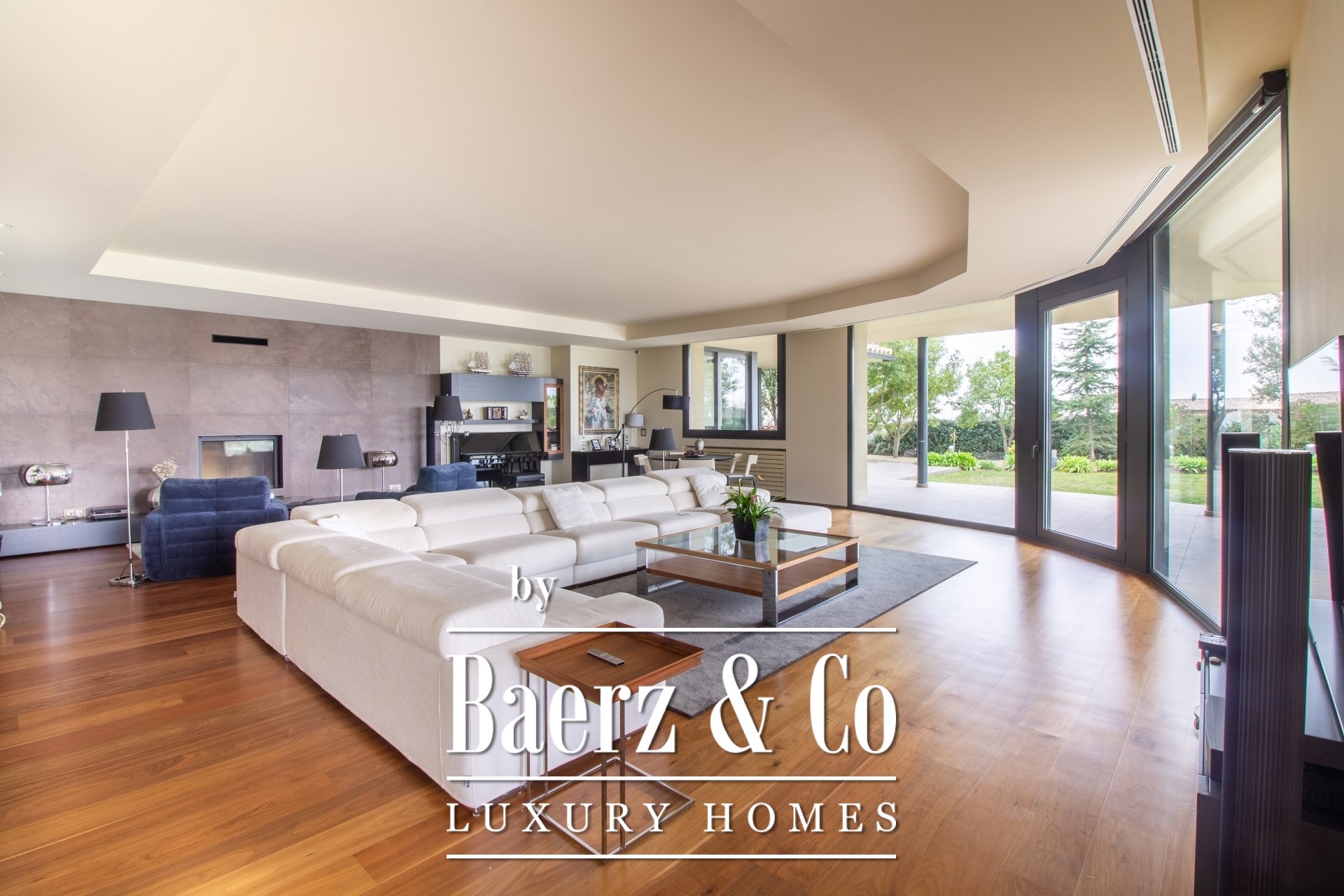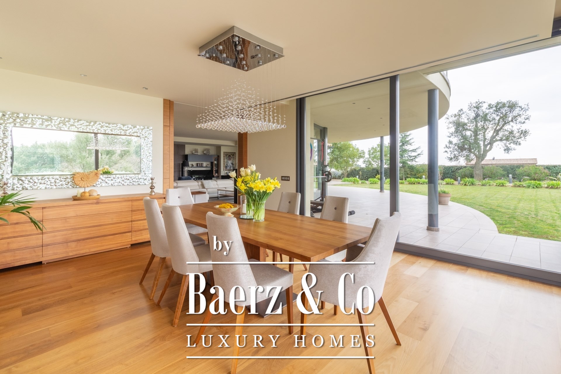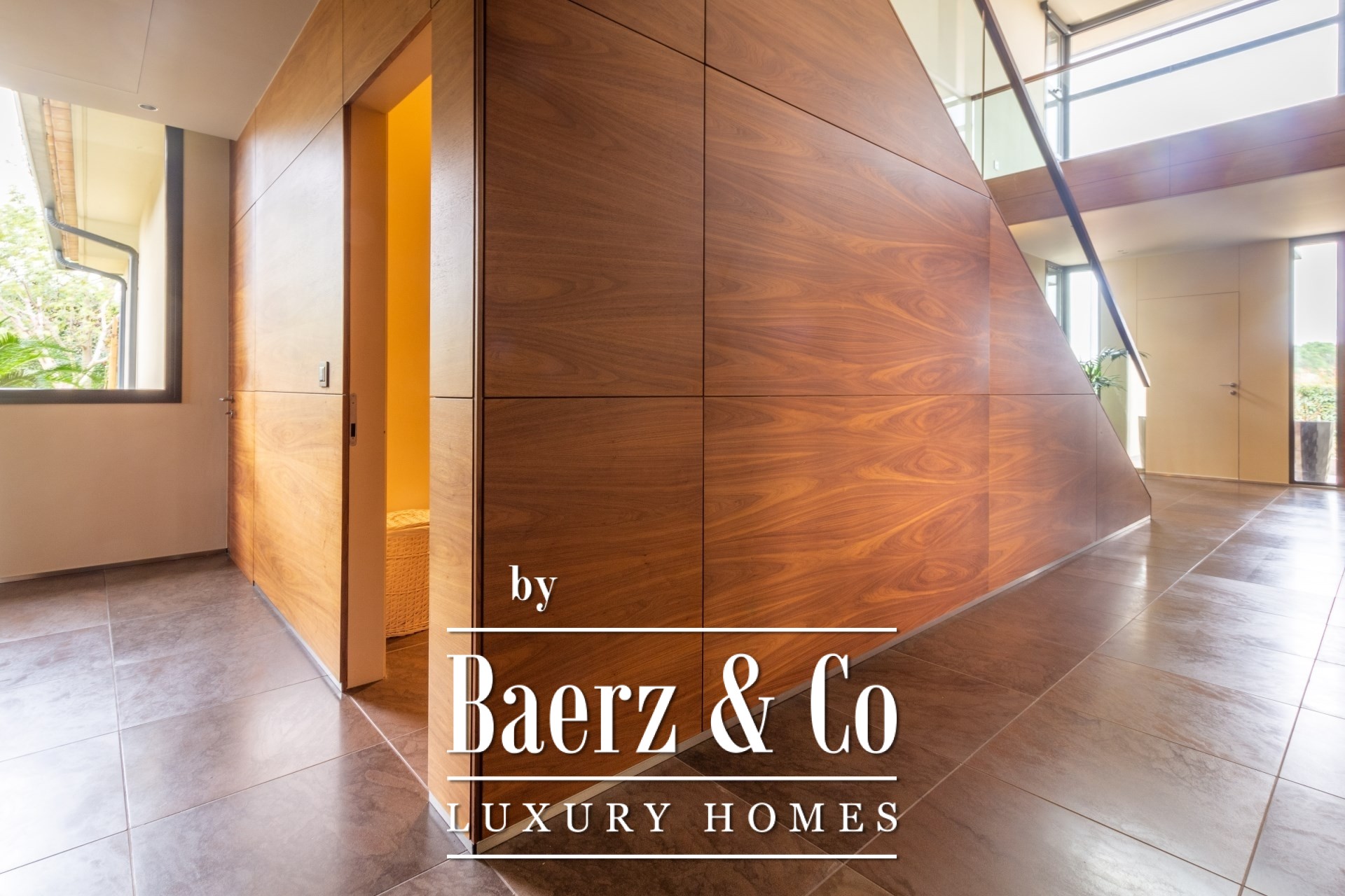 宽敞的玄关引入主层,宽阔的客餐厅沐浴在天然采光中,花园与泳池的开阔视野尽收眼底。带壁炉的阅读角为静谧思考营造氛围。厨房配备高端电器与卓越工艺,专为烹饪精致美食而设计。底层设有两间套房卧室,兼顾私密与便捷,并配有客用卫浴和独立办公室。