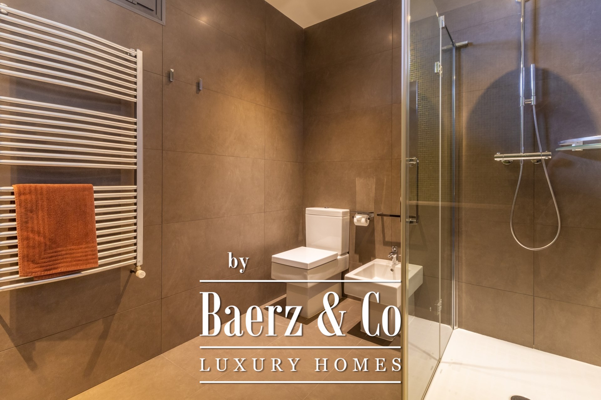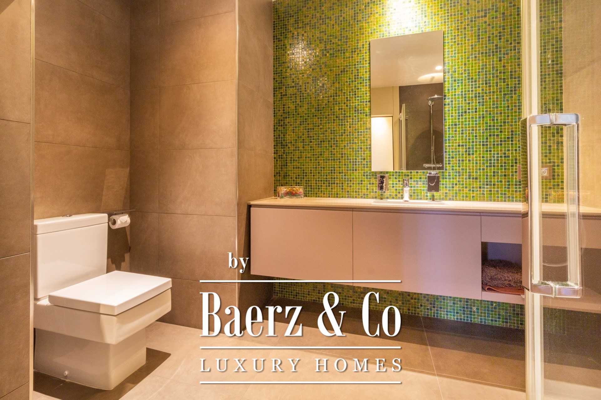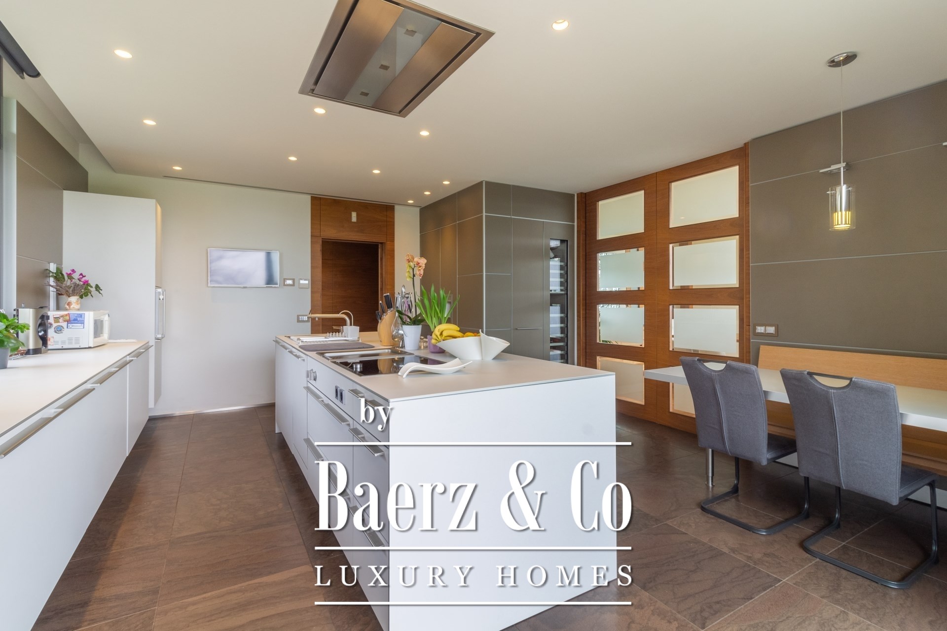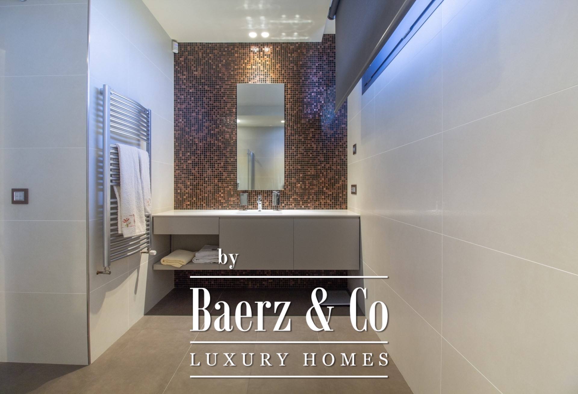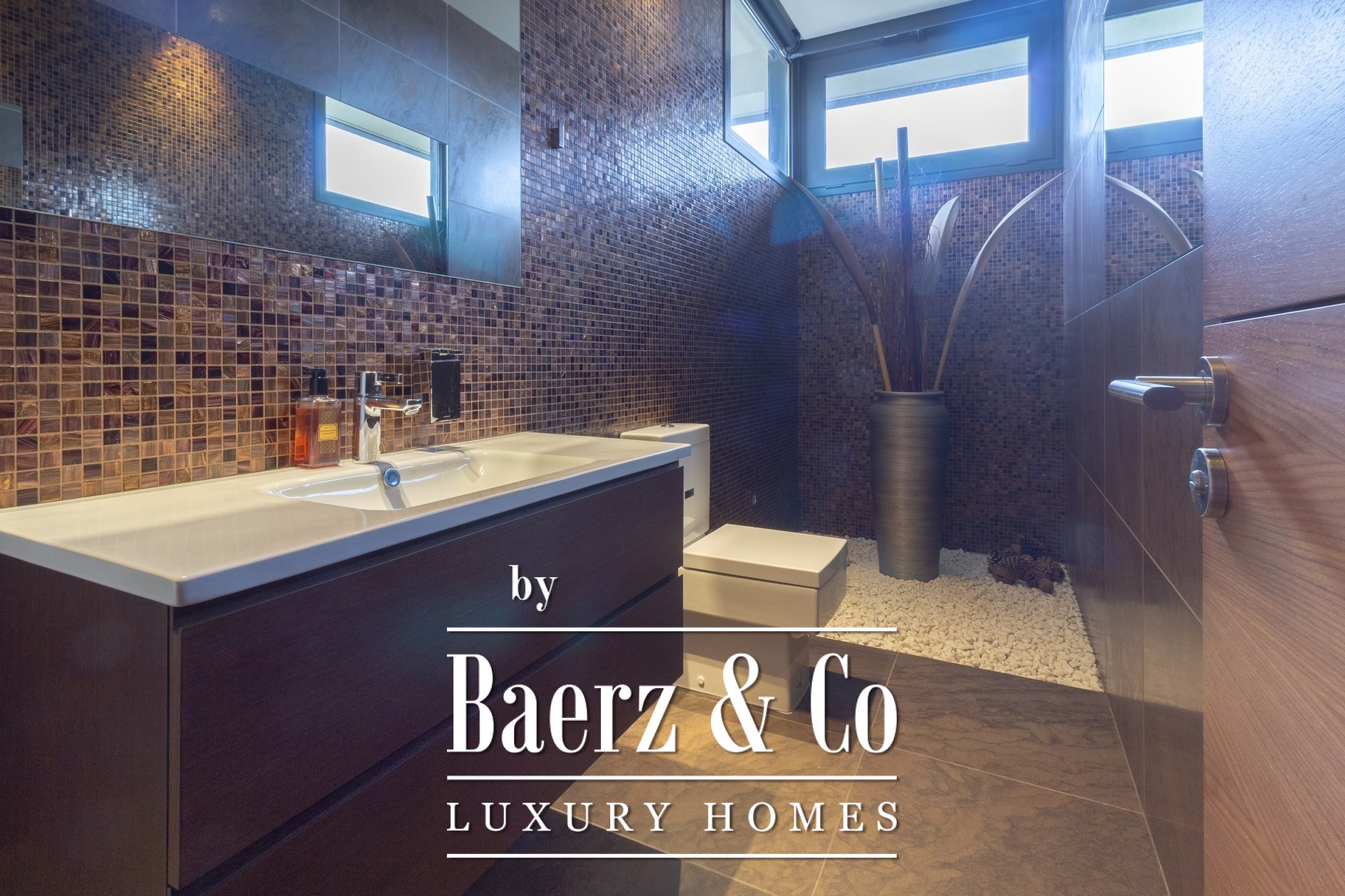 宽敞的玄关引入主层,宽阔的客餐厅沐浴在天然采光中,花园与泳池的开阔视野尽收眼底。带壁炉的阅读角为静谧思考营造氛围。厨房配备高端电器与卓越工艺,专为烹饪精致美食而设计。底层设有两间套房卧室,兼顾私密与便捷,并配有客用卫浴和独立办公室。