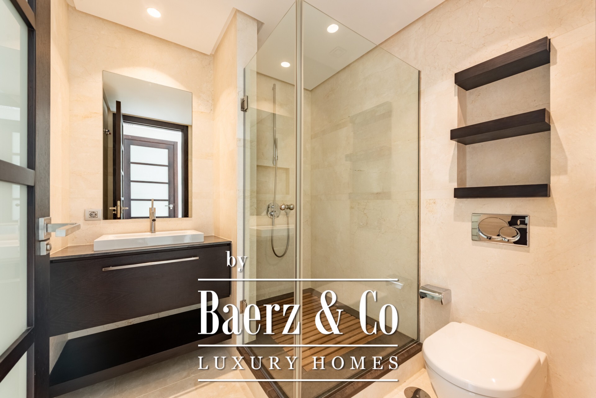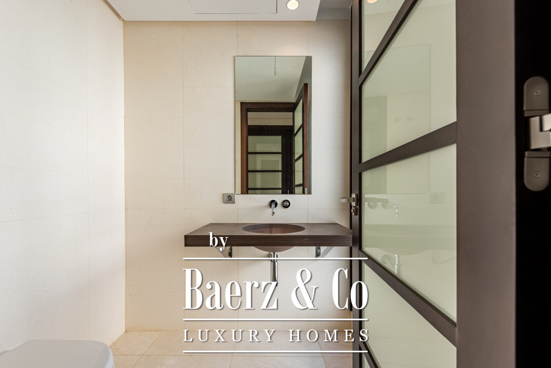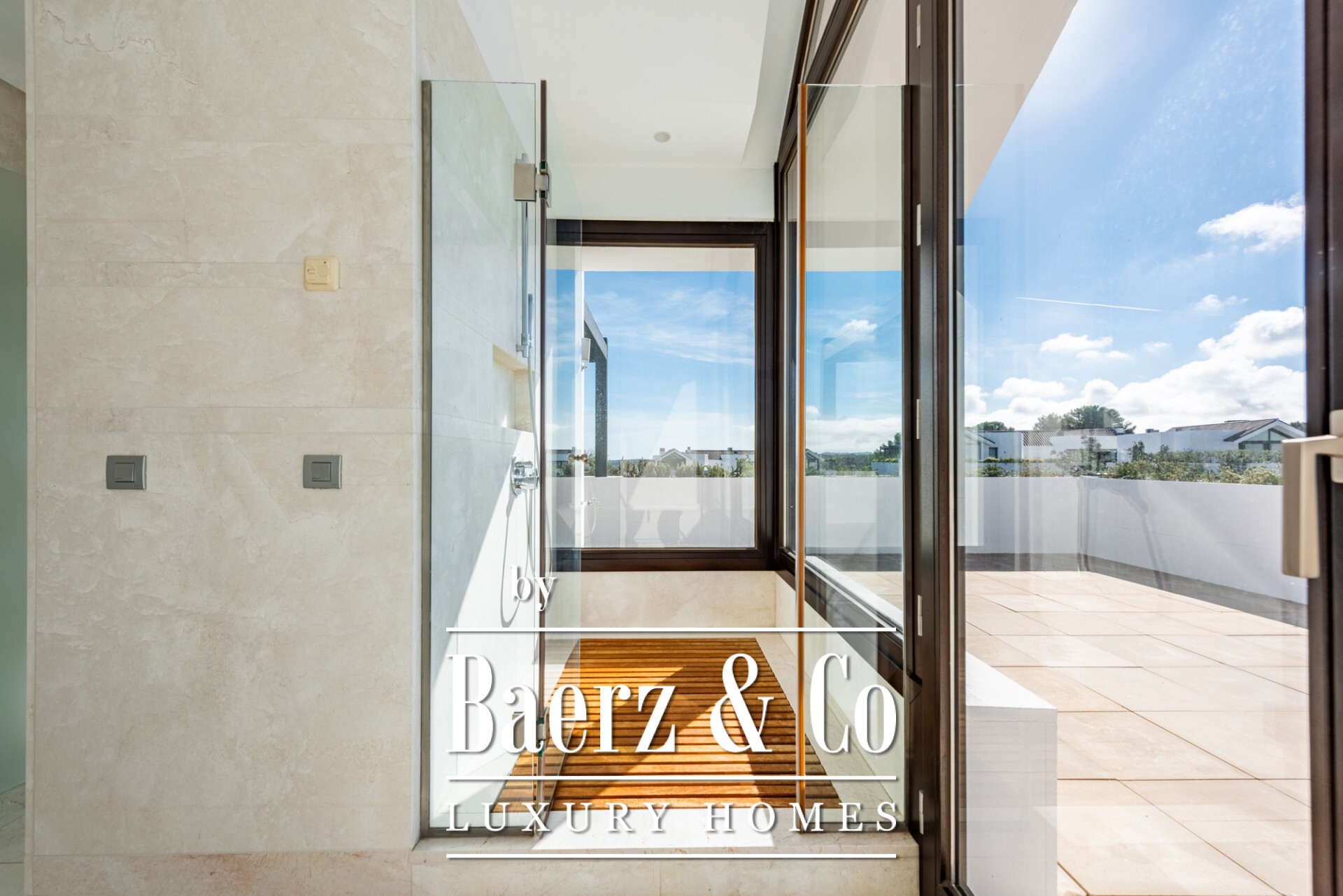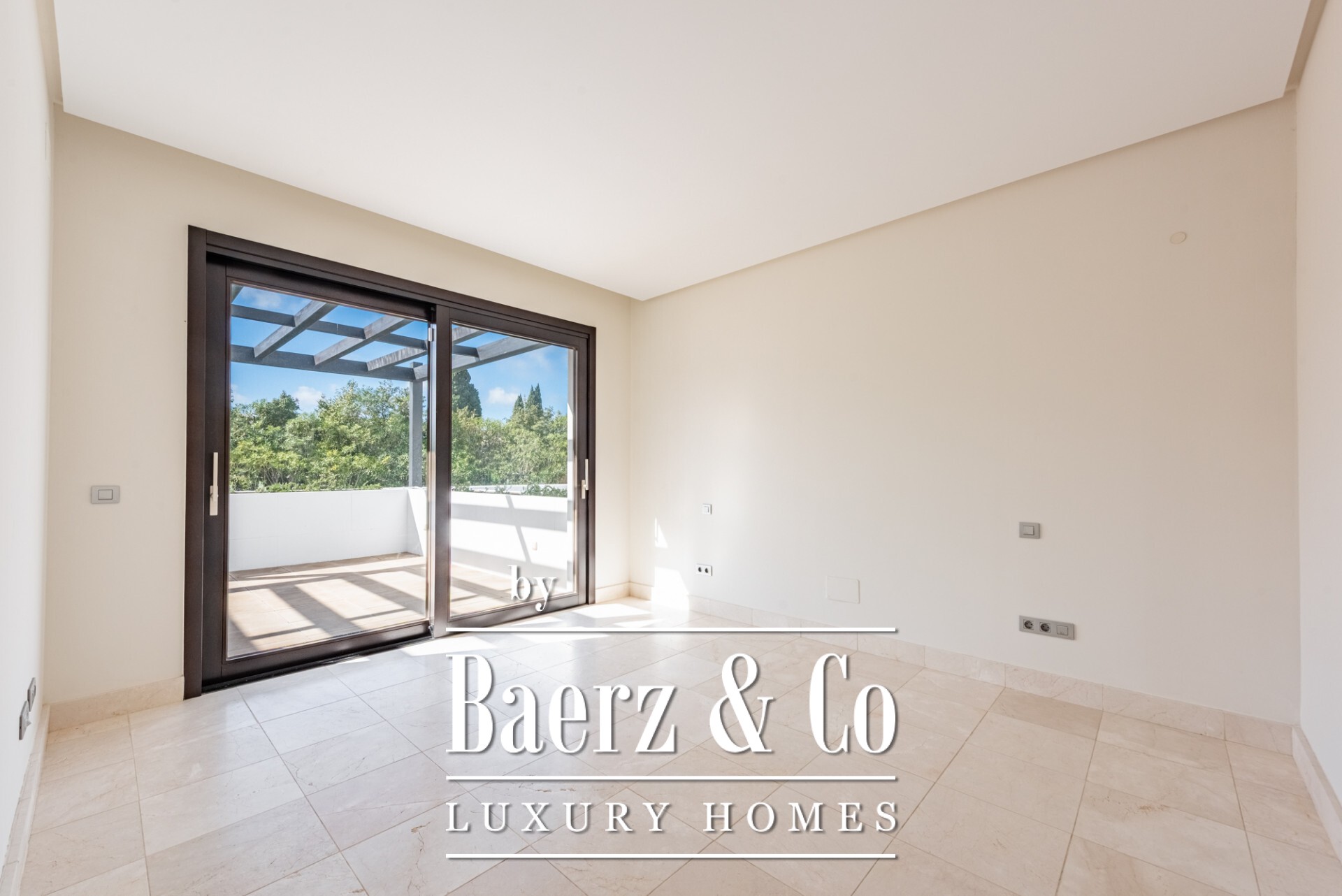 This modern and spacious and bright 4-bedroom apartment stands for luxury living within the esteemed Hacienda Valderrama urbanisation, comprising a private lift, private large garage, and basement, and offers unparalleled convenience and exclusivity. The main floor features three bedroom suites, complemented by expansive living and dining areas, connected to a well-appointed kitchen and utility room. On the upper floor is the master suite which is framed by a terrace. Surrounding these spaces are generous open and covered terraces, perfect for both relaxation and entertaining. The urbanisation of only 34 apartments provides 24hrs security, a large communal swimming pool and beautifully landscaped gardens.